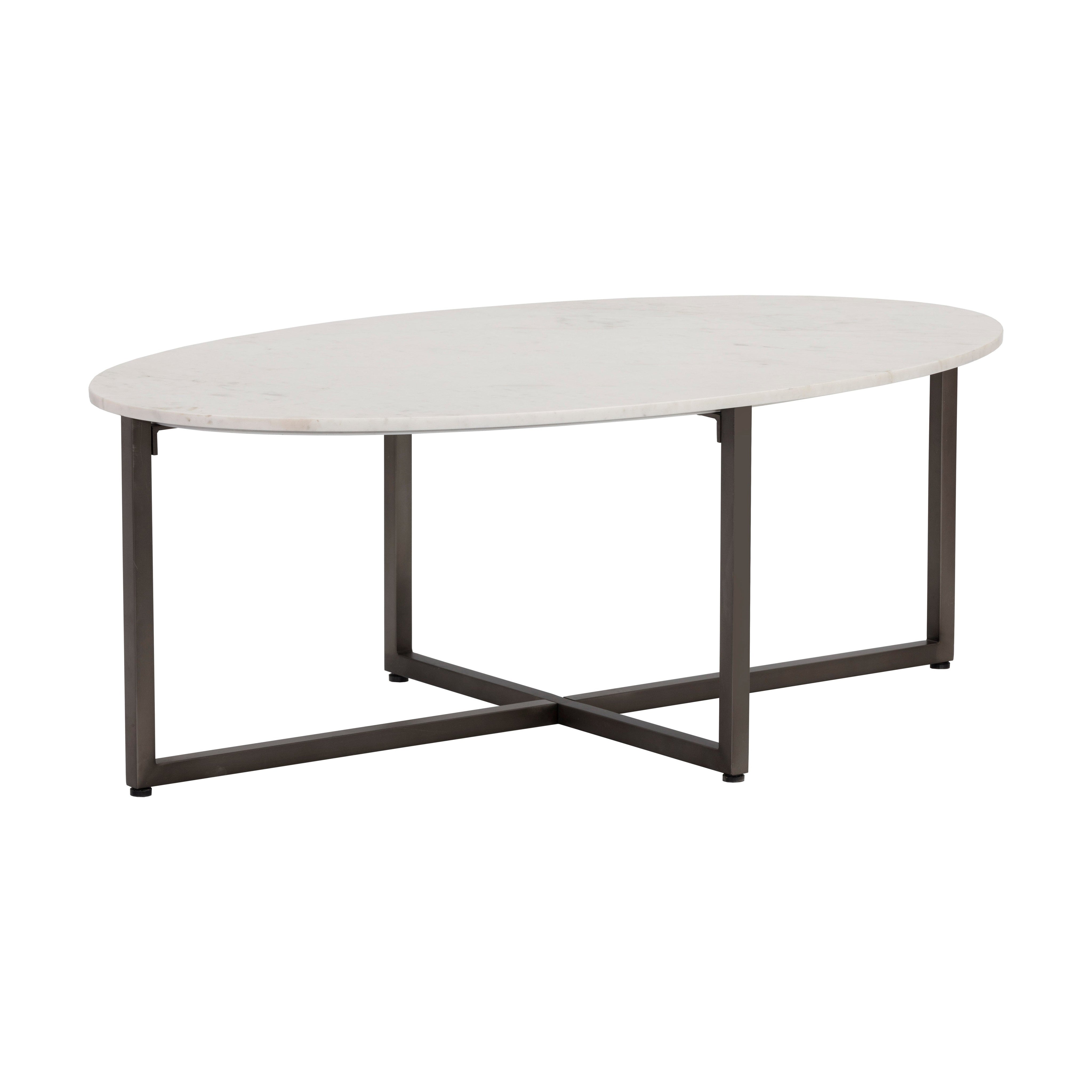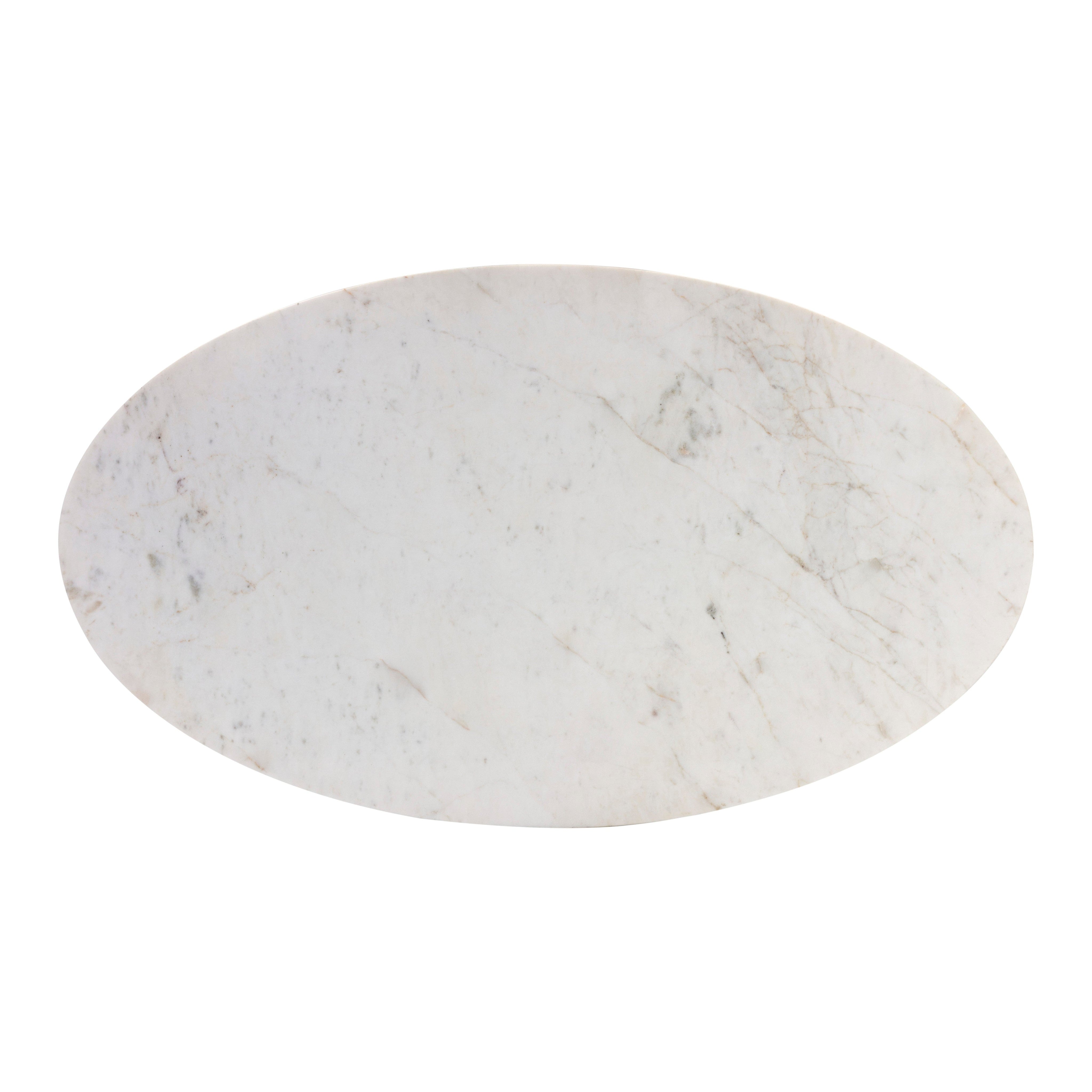 Boasting a minimalist design, this modern coffee table illustrates the contrasting beauty of smooth curves with rigid lines. Features an oval, white marble top with a stainless steel gunmetal base. Also available in a round version, along with coordinating console and end tables. As marble is a natural material, unique veining, pitting, fissures, micro-cracks and colour variations are all characteristics that add to the uniqueness and beauty of each piece. Made in India. With refined craftsmanship, this design was brought to life by skilled local artisans. Due to the nature of handcraftsmanship, unique imperfections such as fissures, markings and variations in colour and shape are welcomed and appreciated characteristics for a truly one-of-a-kind piece.