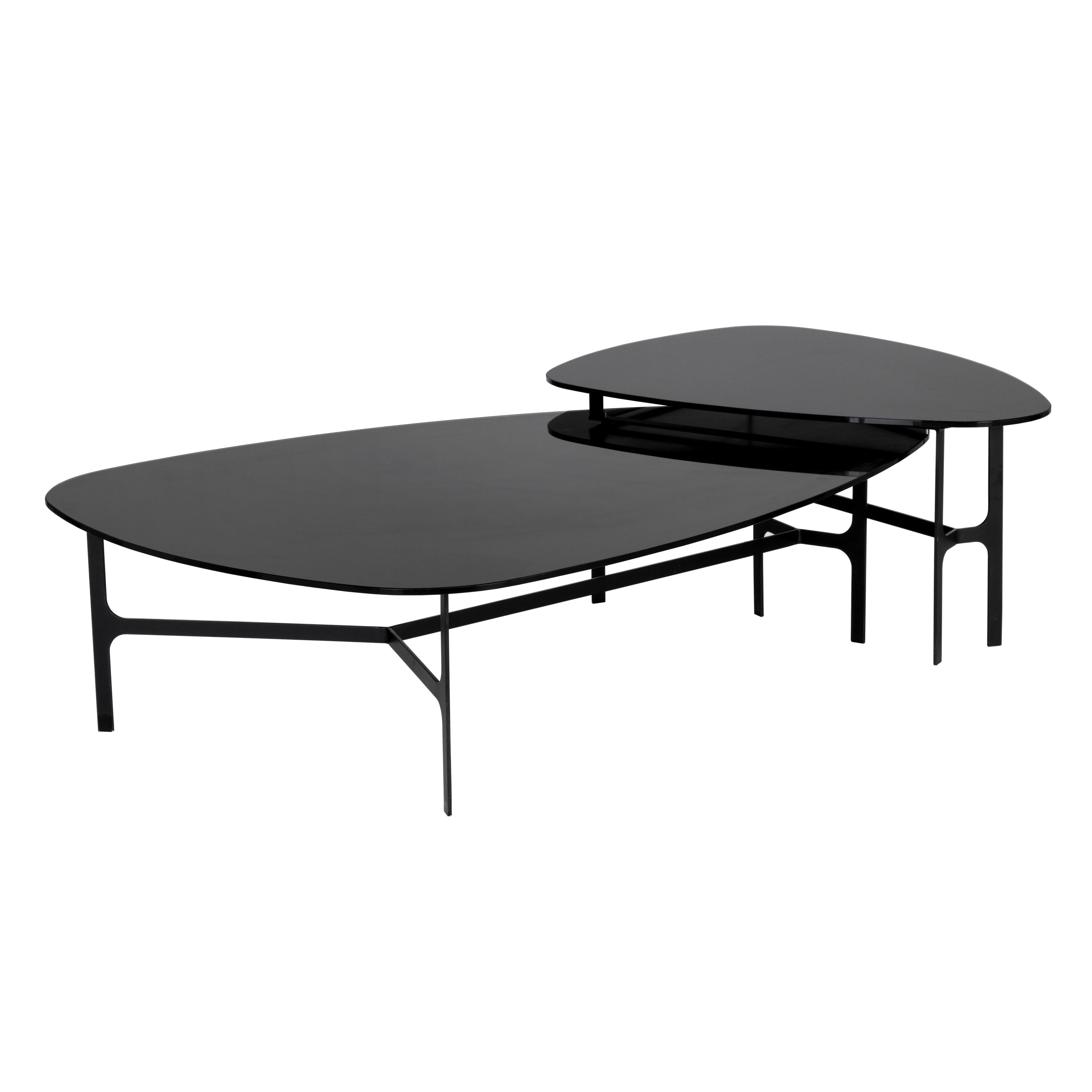 With a charming curved design, this coffee table boasts a mid-century modern appeal. Features a painted black glass top and completed with a matte black metal frame. Coordinating side table also available.