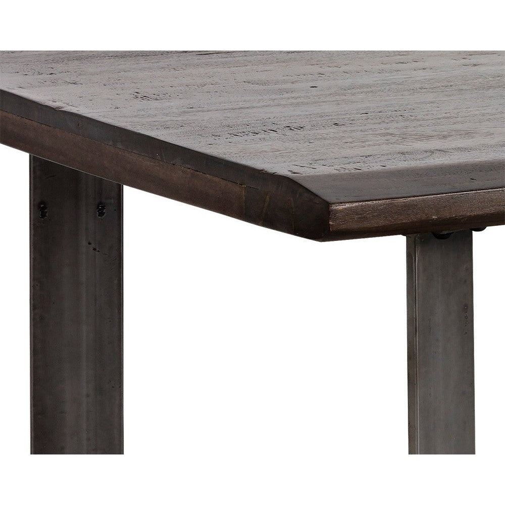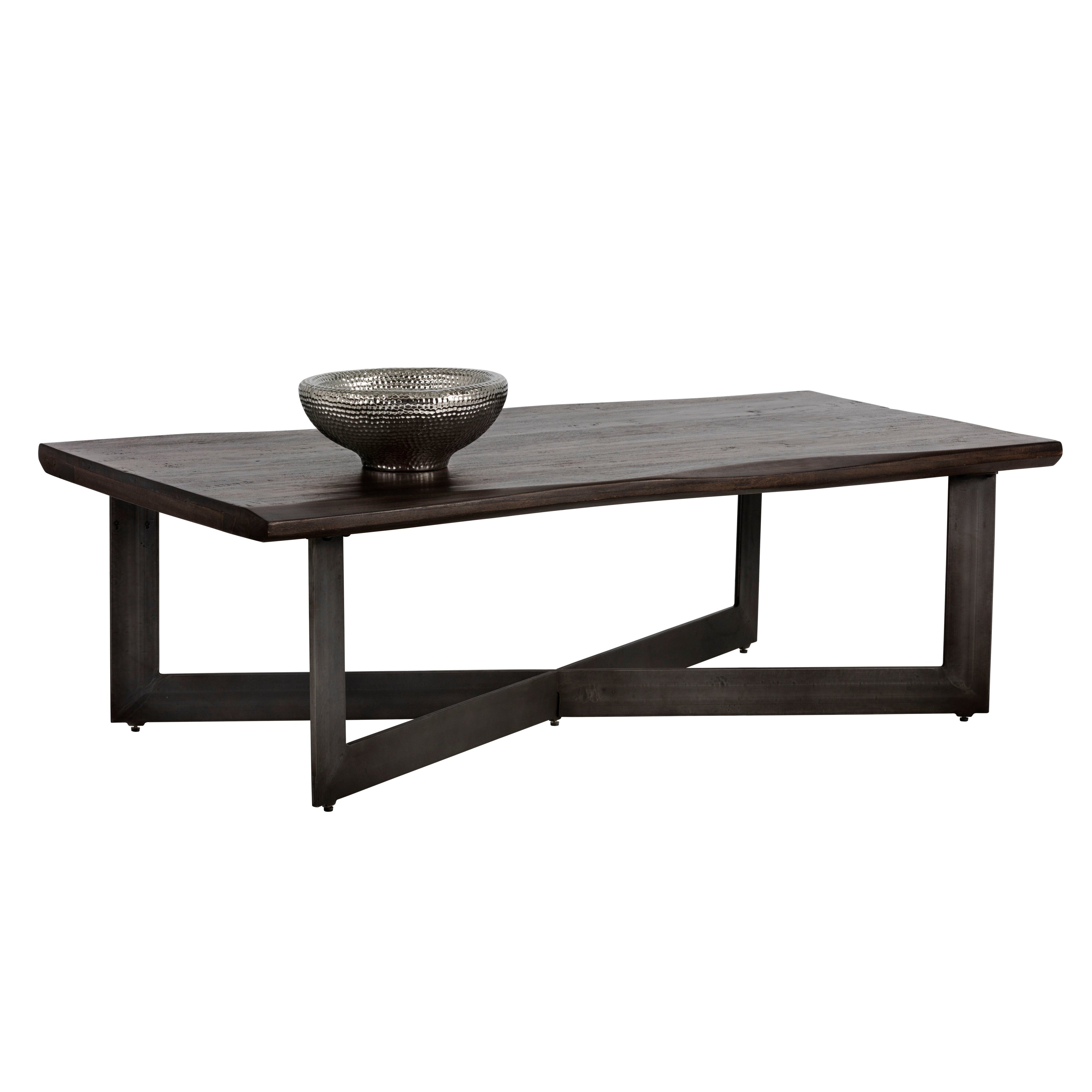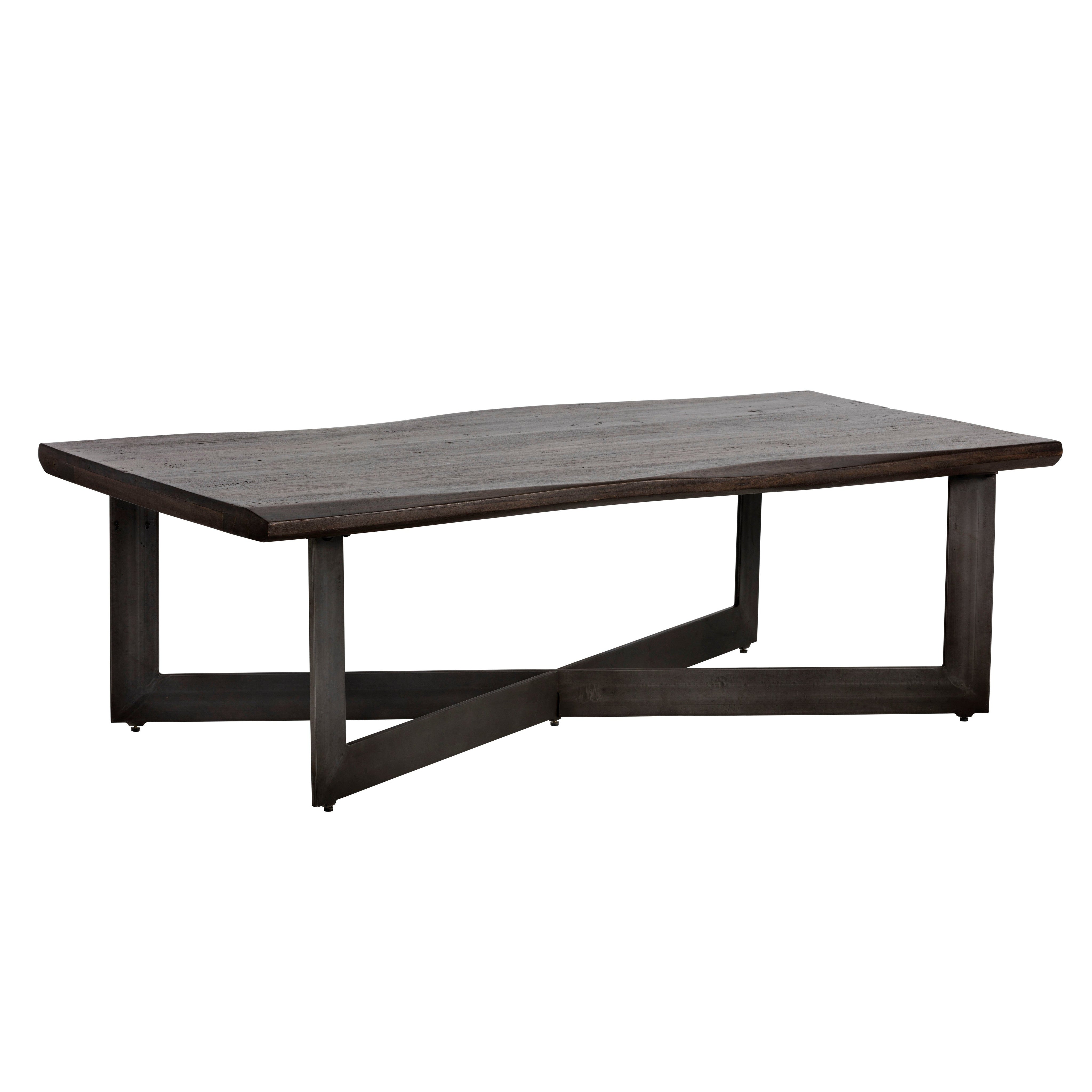 This rectangular coffee table combines rustic and industrial elements perfect for transitional spaces. Featuring a solid acacia wood top in a rich walnut brown finish, with a contrasting antique gunmetal steel base. As wood is an organic, porous material, these pieces will contain natural variation of texture and may also exhibit fine indentations and cracks. Wood pieces will also display a disparity of colour and grain, and visible knots and burls that add to the character of each piece.