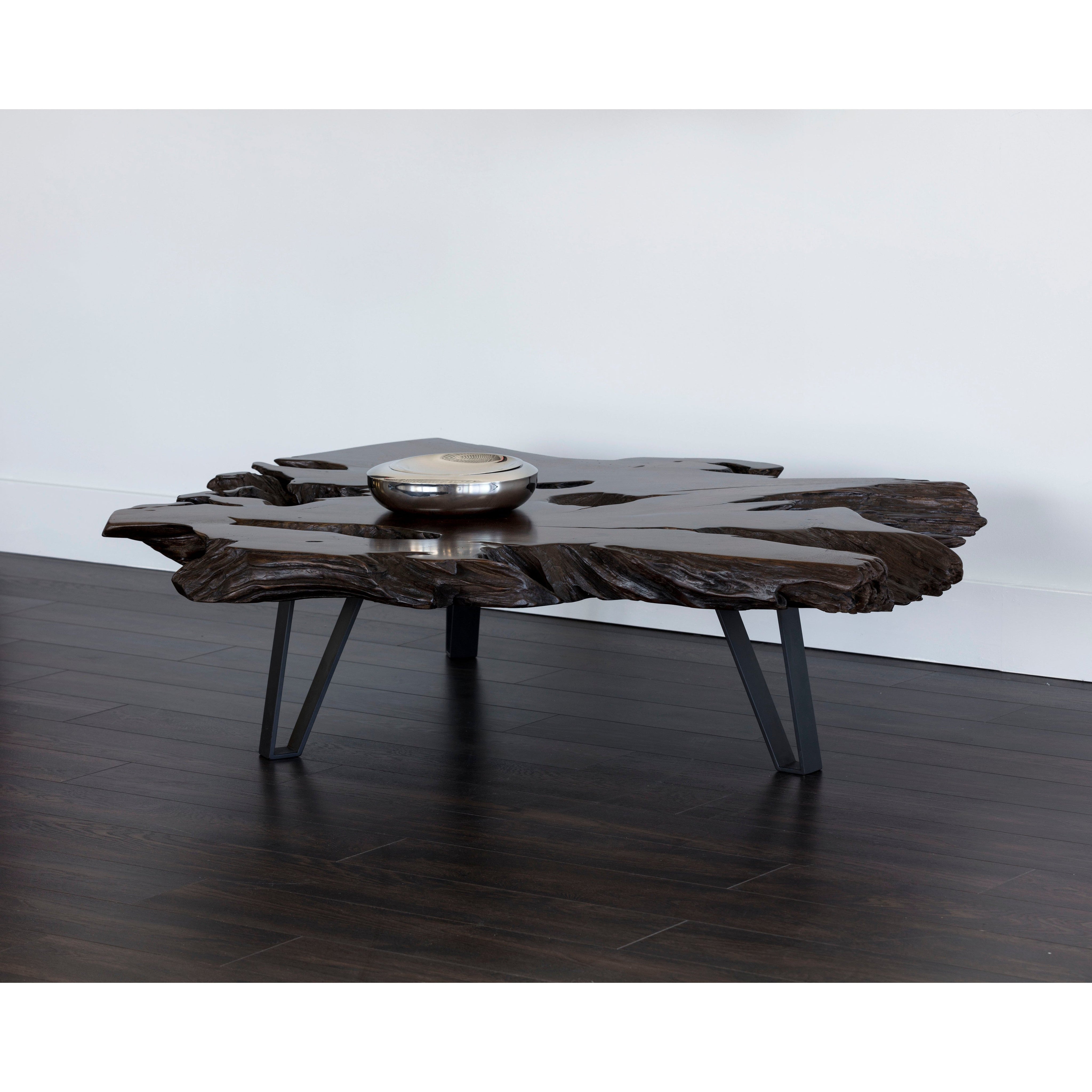 The perfect mix of industrial and organic come to life in this dramatic coffee table. Made in Indonesia from dark solid teak root wood, each top with be unique as they vary in shape and size. Finished with sturdy black iron legs.