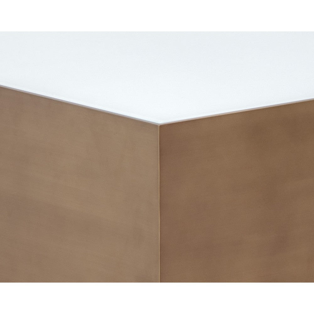 This large, stylish coffee table is elegant and modern. The unique white glass top is framed with a stunning brushed gold stainless steel frame and black oak wood base. Suitable for commercial and residential environments.