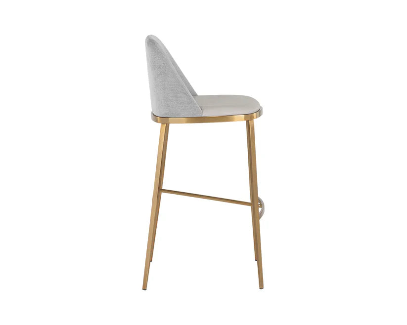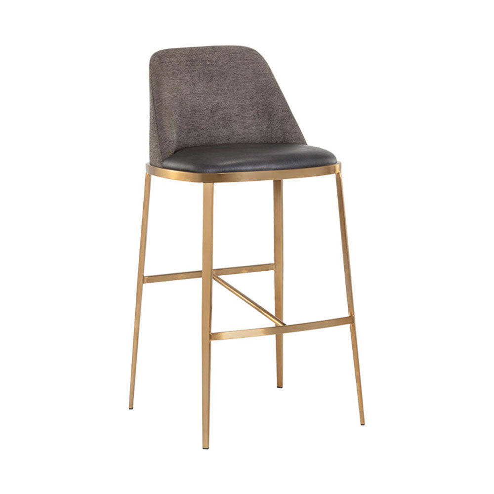 A combination of mixed materials creates a truly luxurious barstool. The contemporary silhouette is finished with a bravo portabella faux leather seat, sparrow grey fabric seatback and sleek gold steel legs.