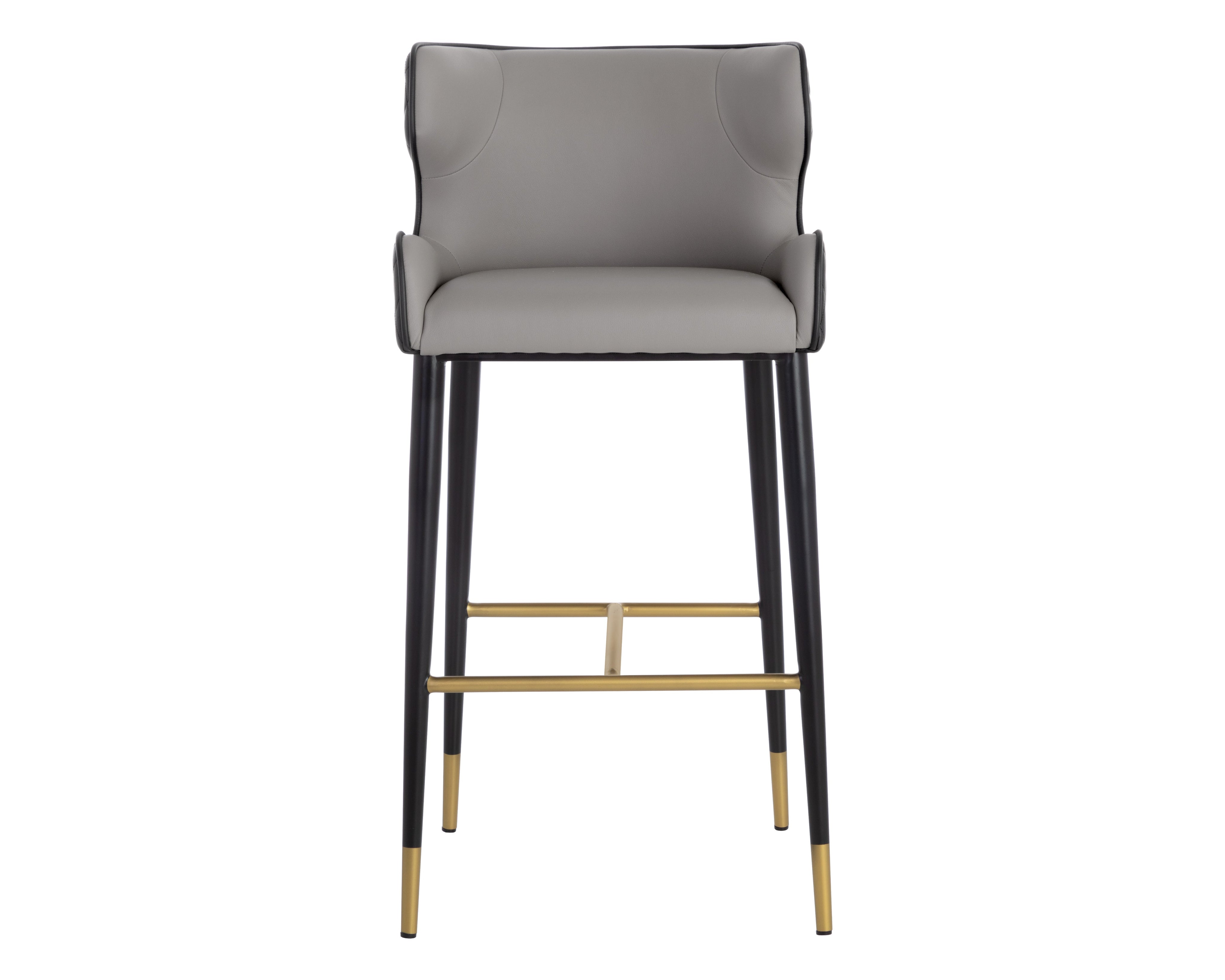 A classic barstool featuring a substantial seat upholstered in contrasting dillon stratus and black faux leather. Diamond stitching on the seatback adds a hint of elegance while black wood legs and brushed gold foot caps complete the look. Handle With Care: This design has been crafted with faux leather. Faux leather is manufactured to reflect the natural characteristics of leather; as such, colour variations, markings, wrinkles, grooves, and light scratches are appreciated characteristics. No two pieces will be alike. Visit our Product Care page for more information on how to ensure the lasting beauty of this piece.