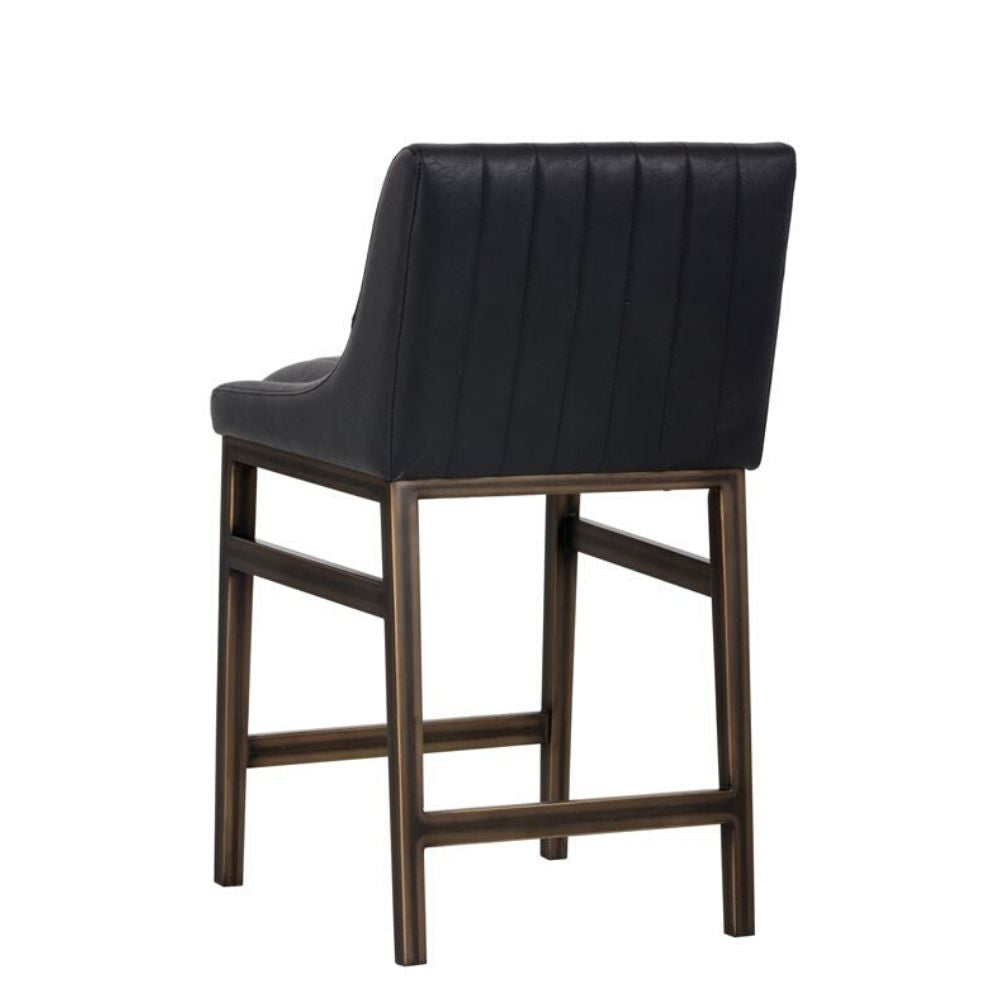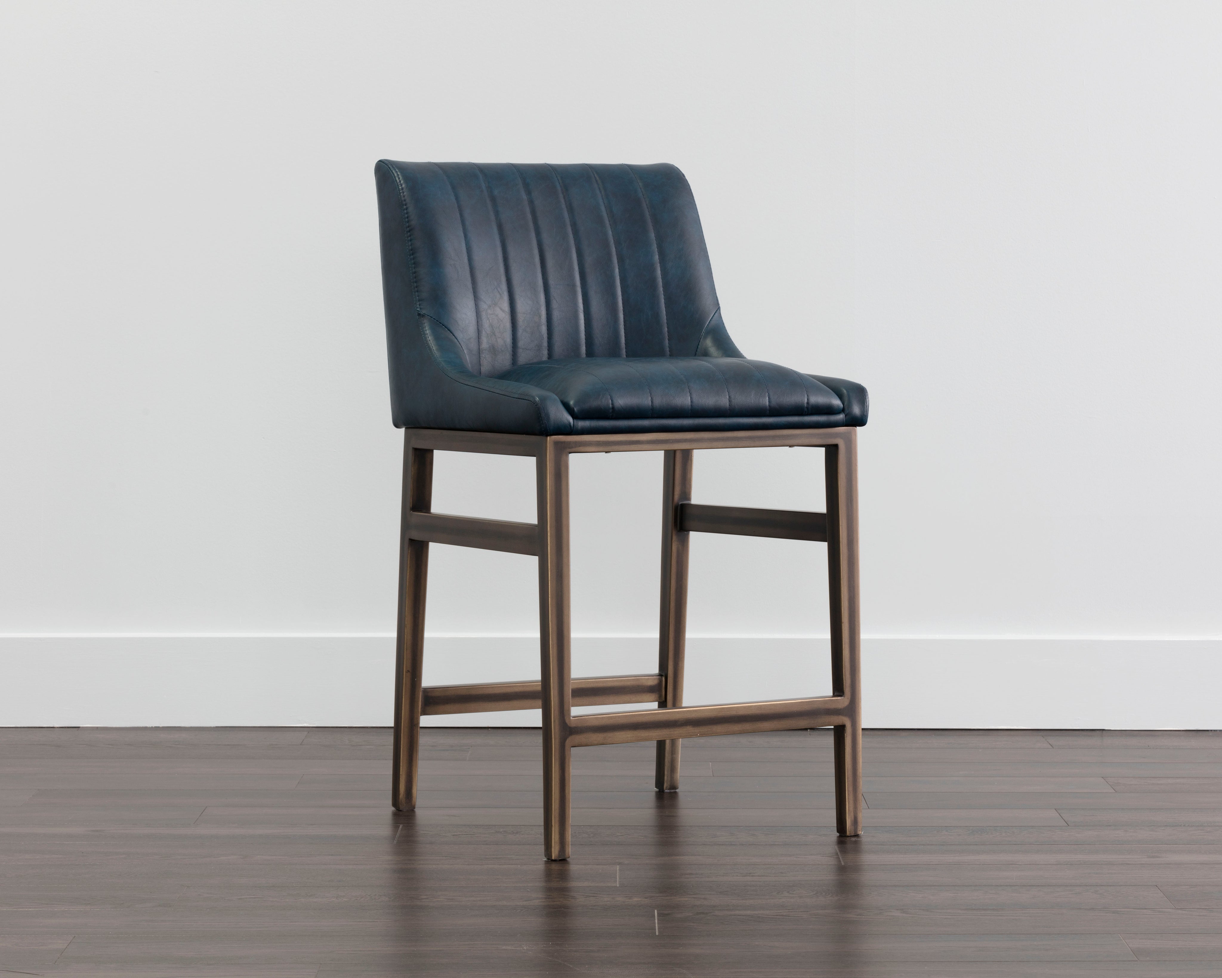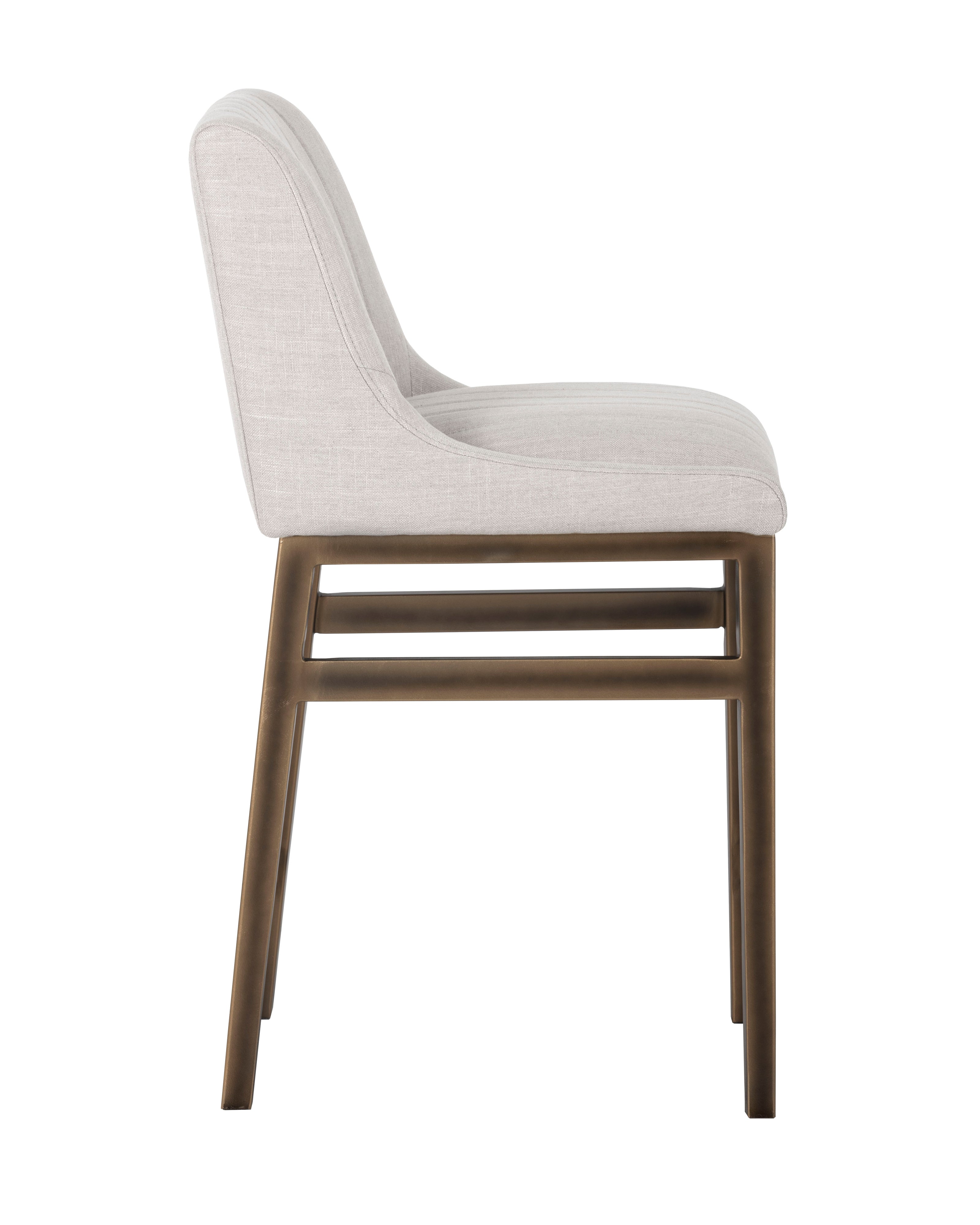 An urban designed stool featuring bold vertical channel tufting on the seat and back in beige linen fabric. Finished with a rustic bronze steel frame and stretchers. Suitable for various dining, kitchen and bar spaces of all sizes.
