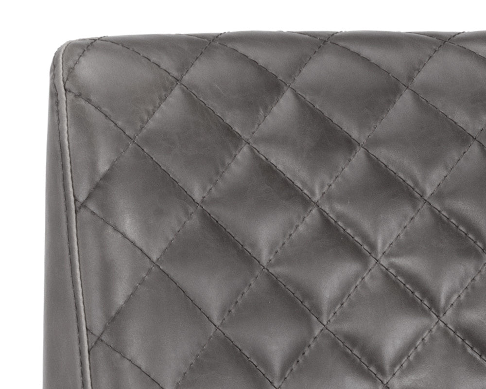 Transform bar and dining spaces with this classic barstool. Stocked in coal black faux leather with diamond stitching on the interior seat back and an antique brass frame steel frame. Suitable for various dining, kitchen and bar spaces of all sizes. Handle With Care: This design has been crafted with faux leather. Faux leather is manufactured to reflect the natural characteristics of leather; as such, colour variations, markings, wrinkles, grooves, and light scratches are appreciated characteristics. No two pieces will be alike. Visit our Product Care page for more information on how to ensure the lasting beauty of this piece.