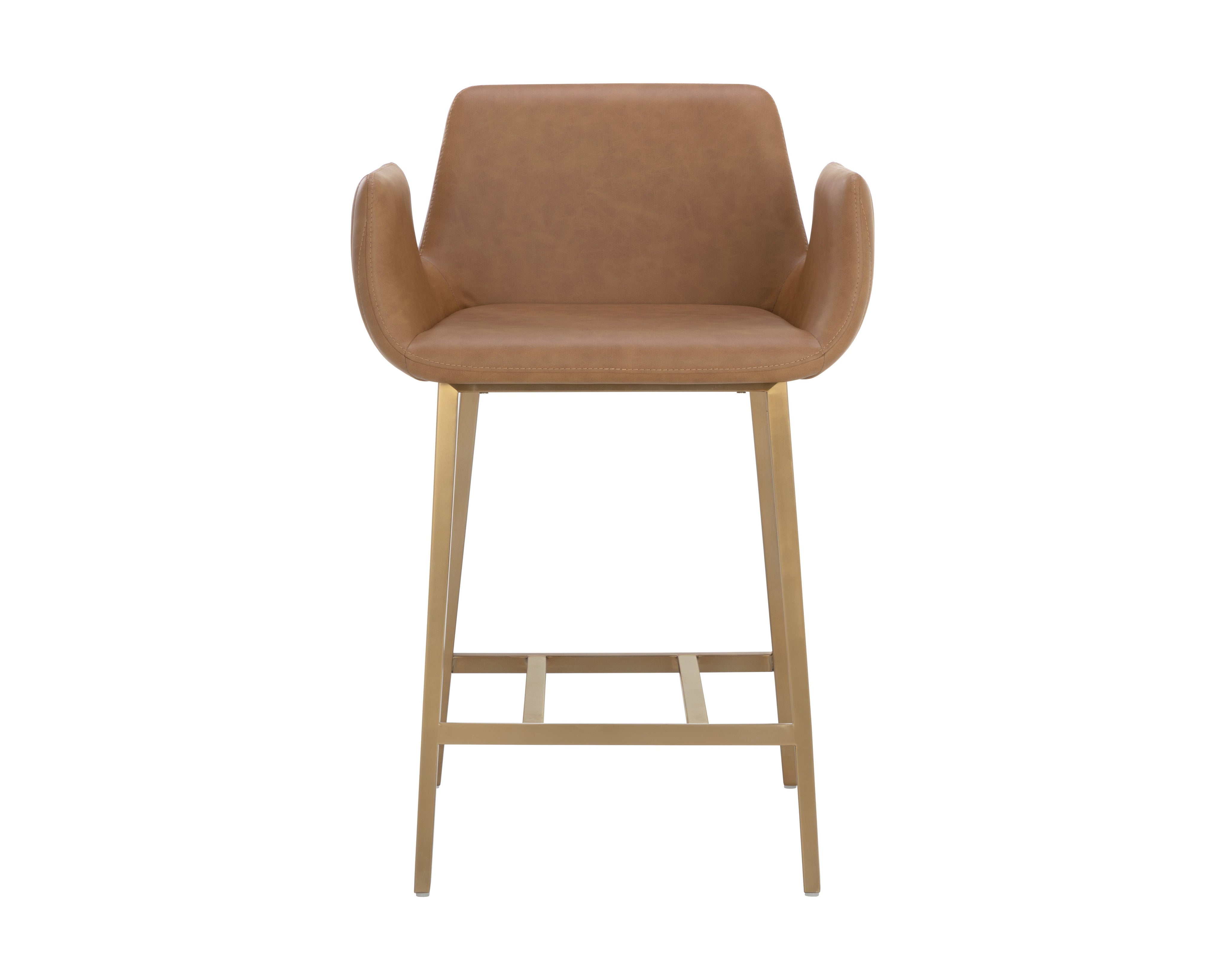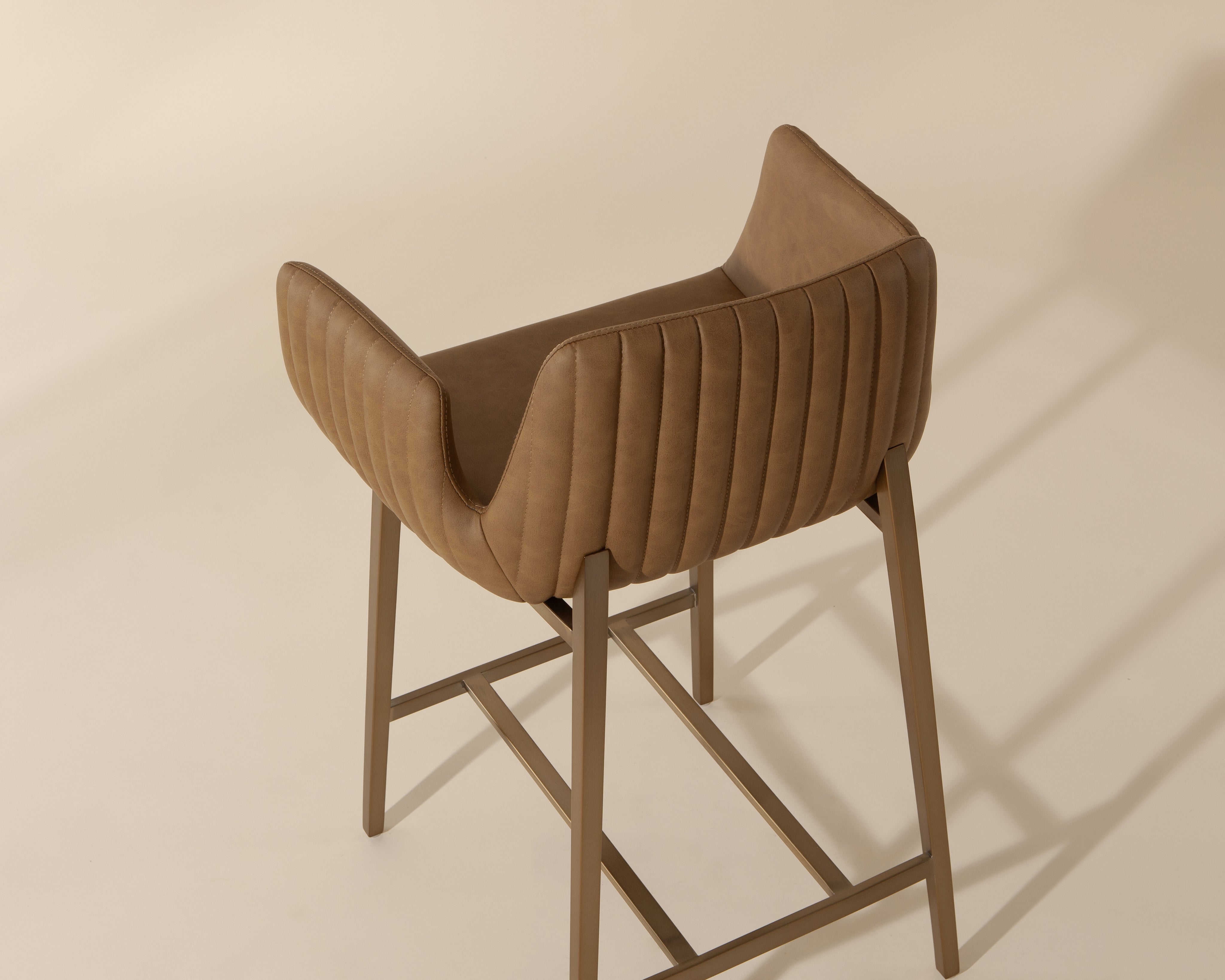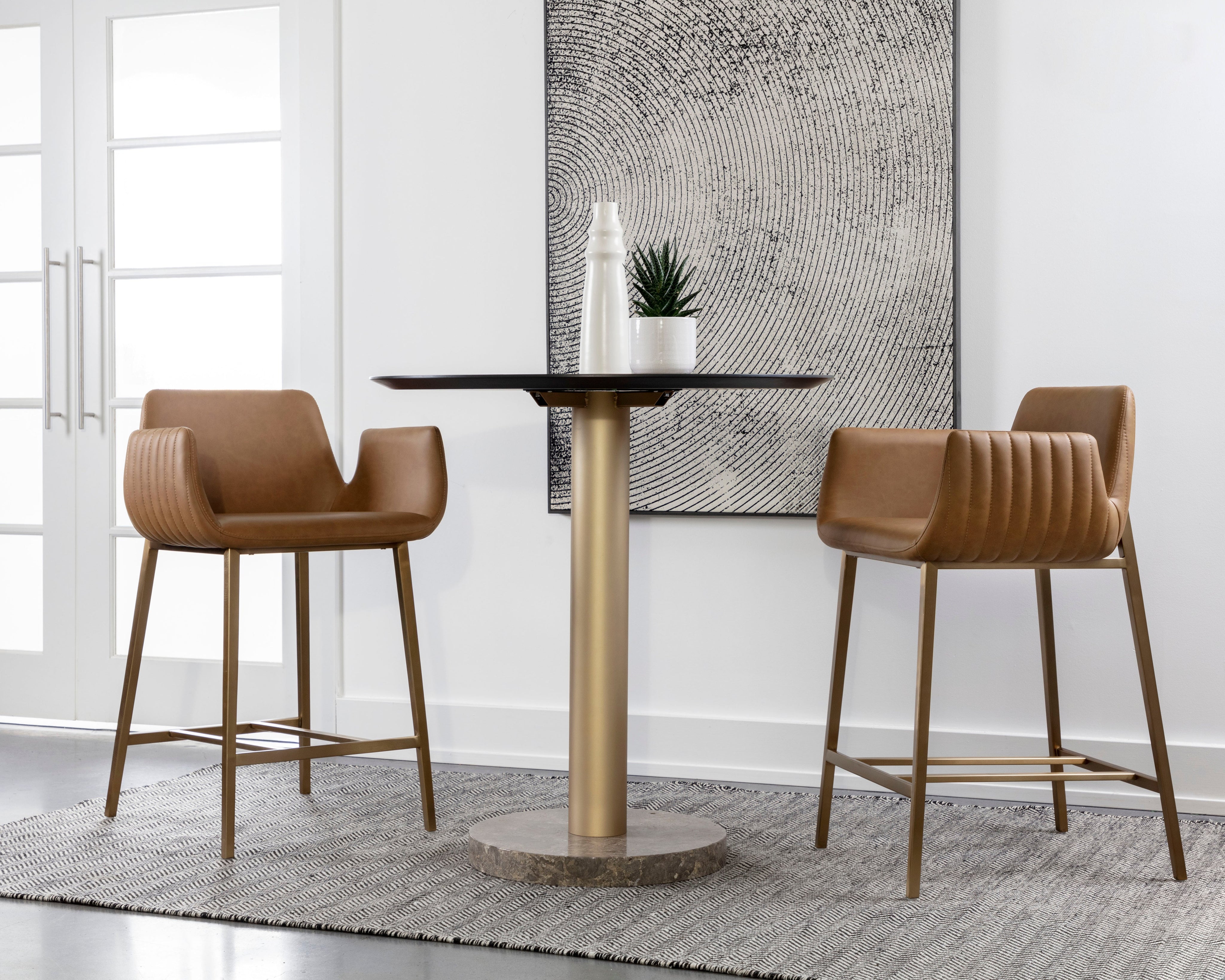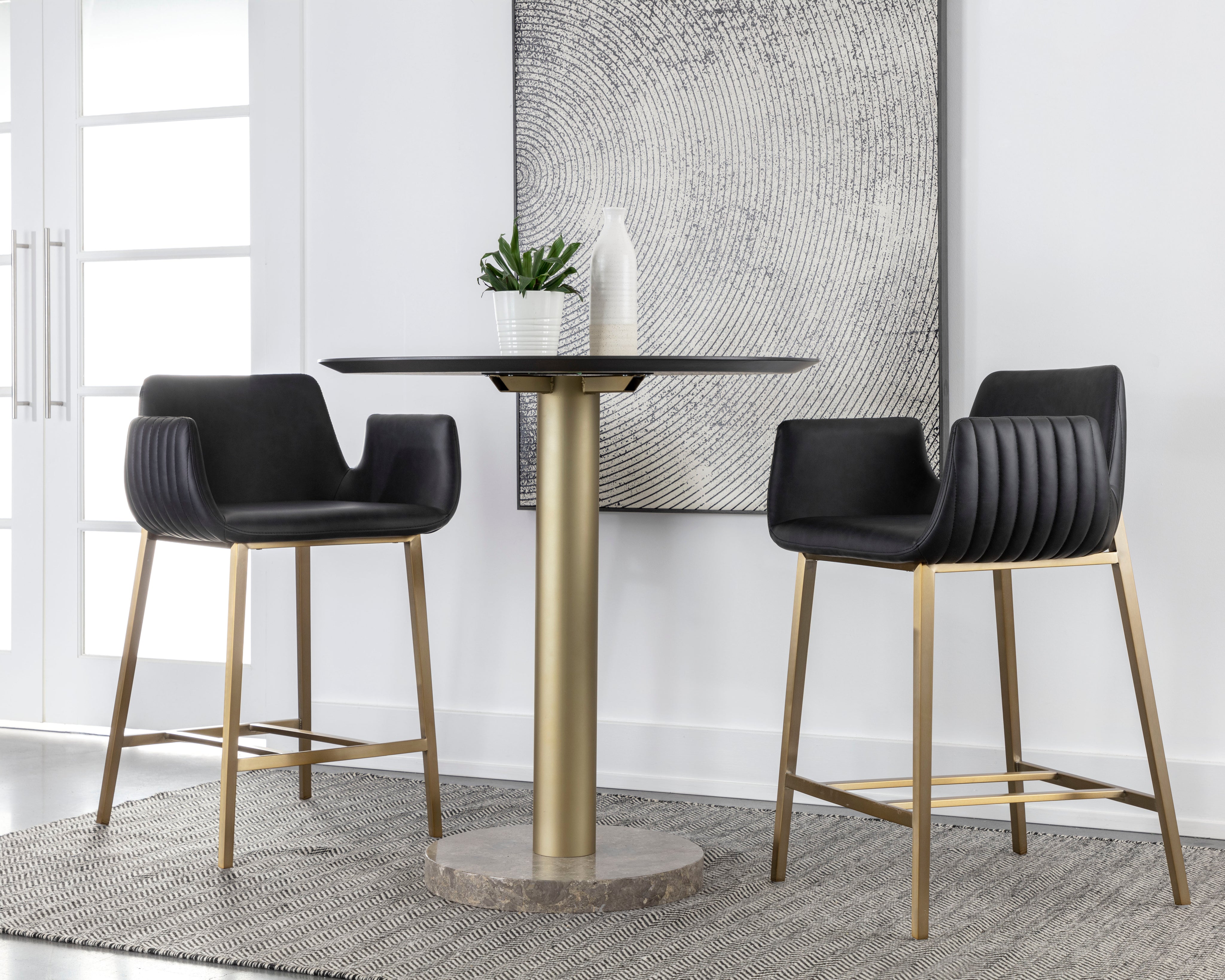 With its stunning scooped design, the Lucano Counter Stool is an impressive addition to any dining space. Features vertical channel tufting on exterior seat. Stocked in smooth bravo black faux leather and completed with gold stainless steel legs.