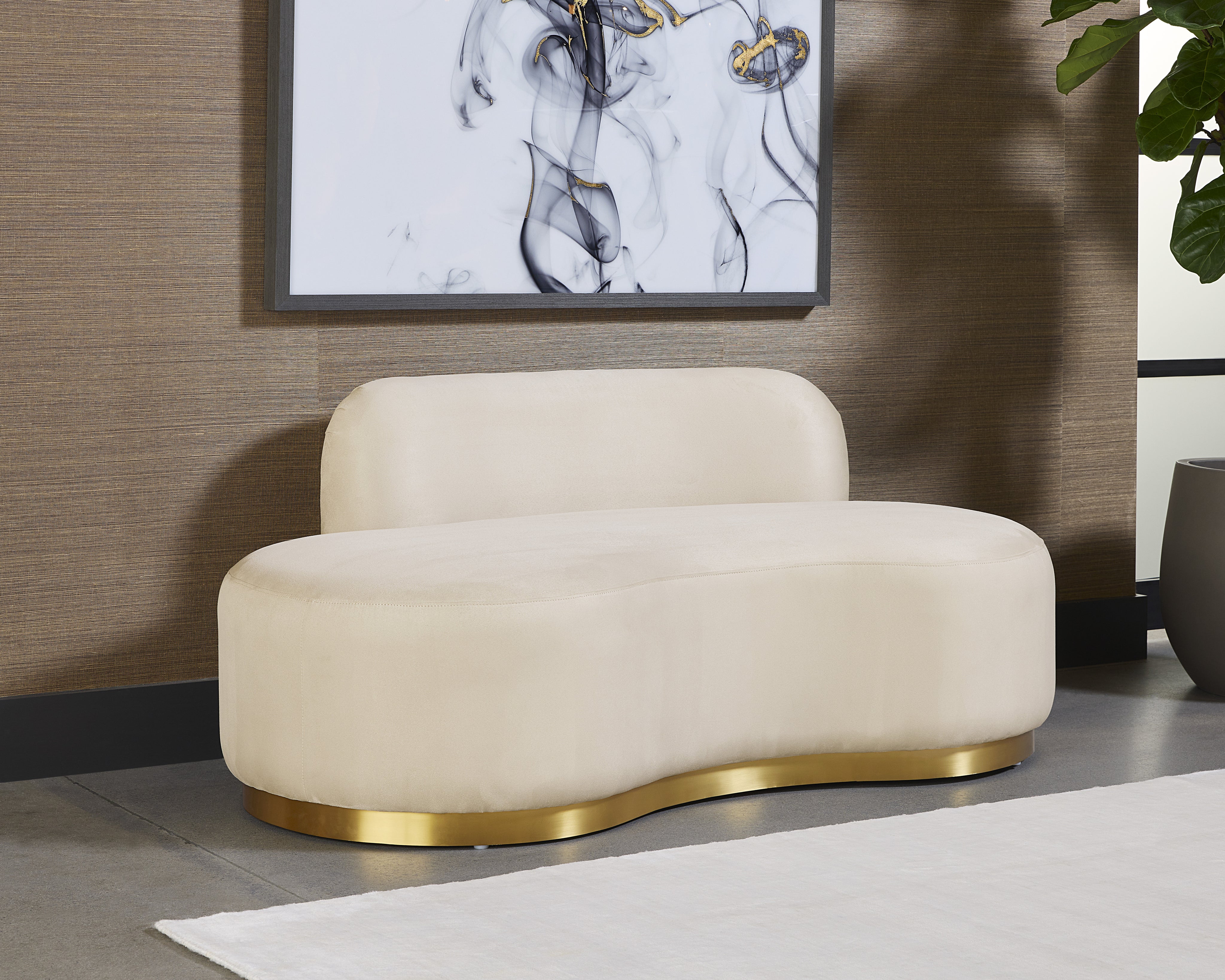 With an impressive contemporary design, this splendid bench features a mesmerizing curved shape that will add stunning appeal to any space. Stocked in casablanca cloud performance fabric and completed with a gold stainless steel base. Performance fabric is moisture repellent, durable and easy to clean.