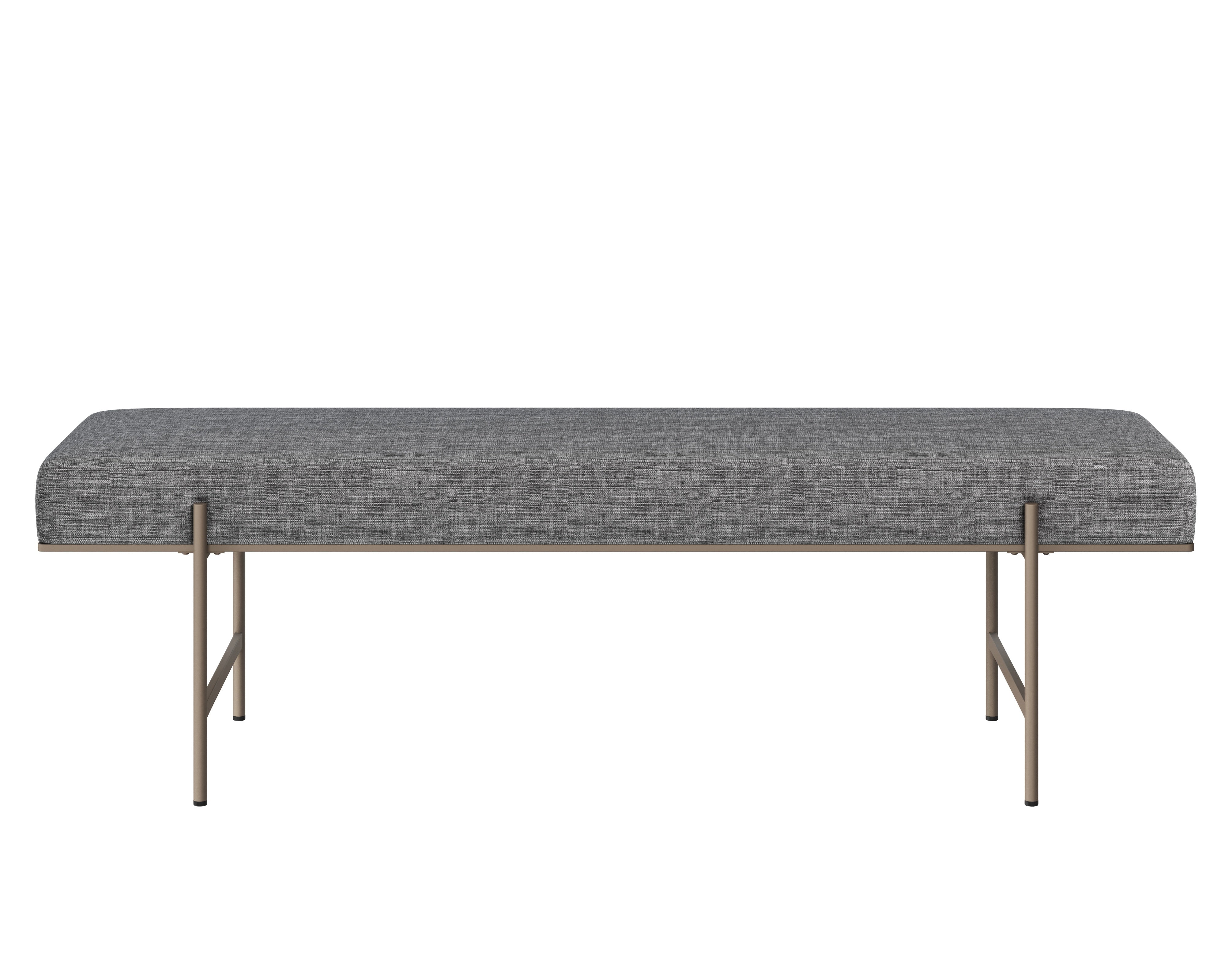 Defined by clean lines, this fabulous bench will effortlessly infuse modern style into any space. Stocked in chacha grey and limestone fabrics, and completed with an antique brass powder coated steel base.