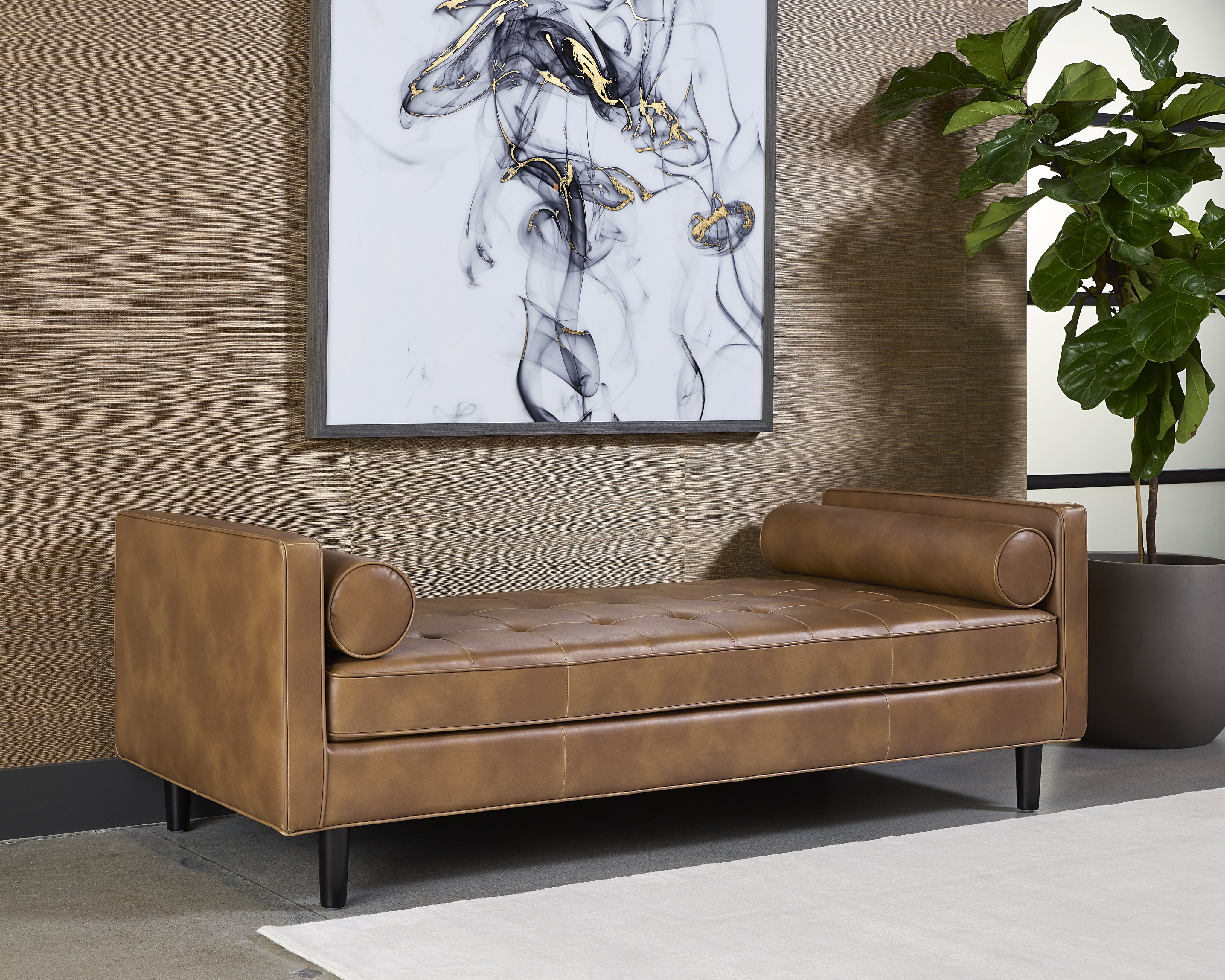 This attractive mid-century designed bench is a timeless addition to any space. Upholstered in tobacco tan faux leather with button tufting and piping detail. Finished with a black birch wood base. Pairs well with the Donnie sofa and armchair. Handle With Care: This design has been crafted with faux leather. Faux leather is manufactured to reflect the natural characteristics of leather; as such, colour variations, markings, wrinkles, grooves, and light scratches are appreciated characteristics. No two pieces will be alike. Visit our Product Care page for more information on how to ensure the lasting beauty of this piece.