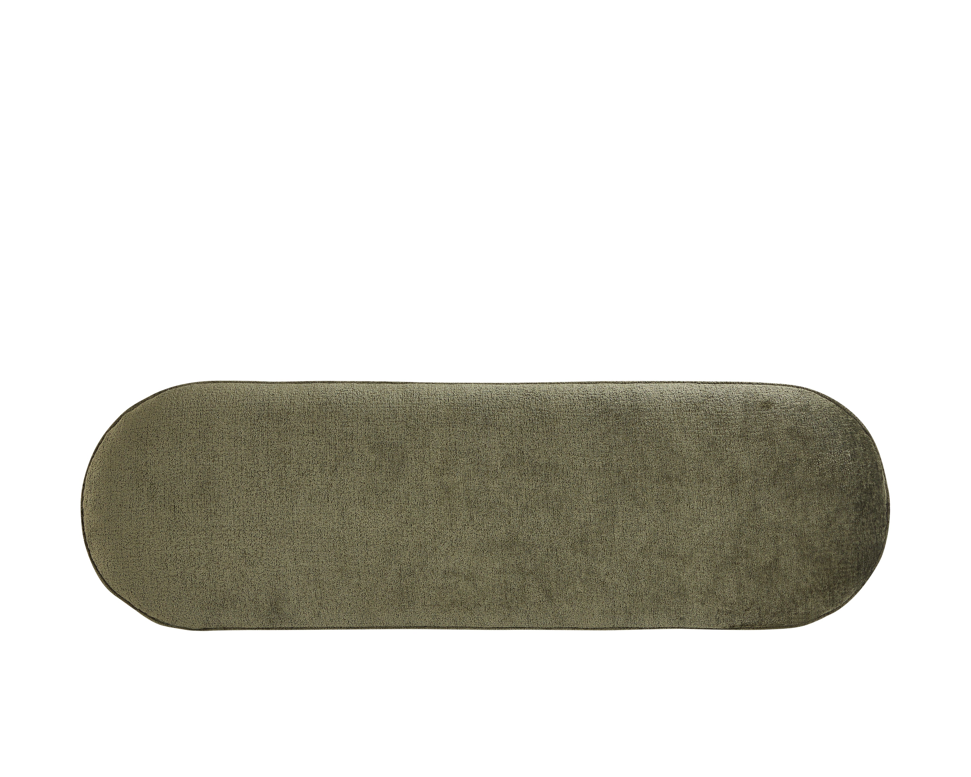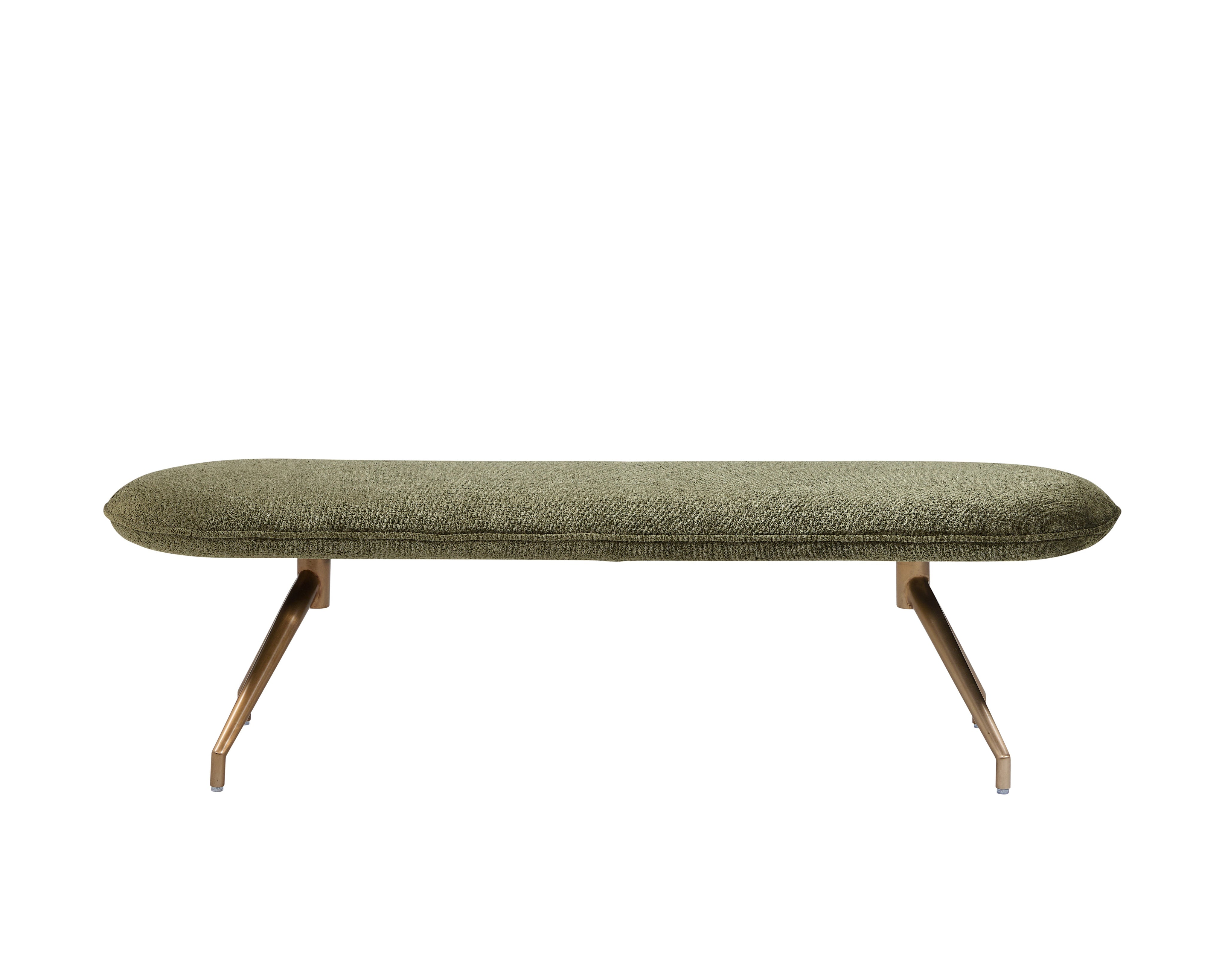 With a stunning oval design, this modern bench will add style and function to any space. Stocked in bergen olive fabric and completed with an antique brass powder coated stainless steel base.