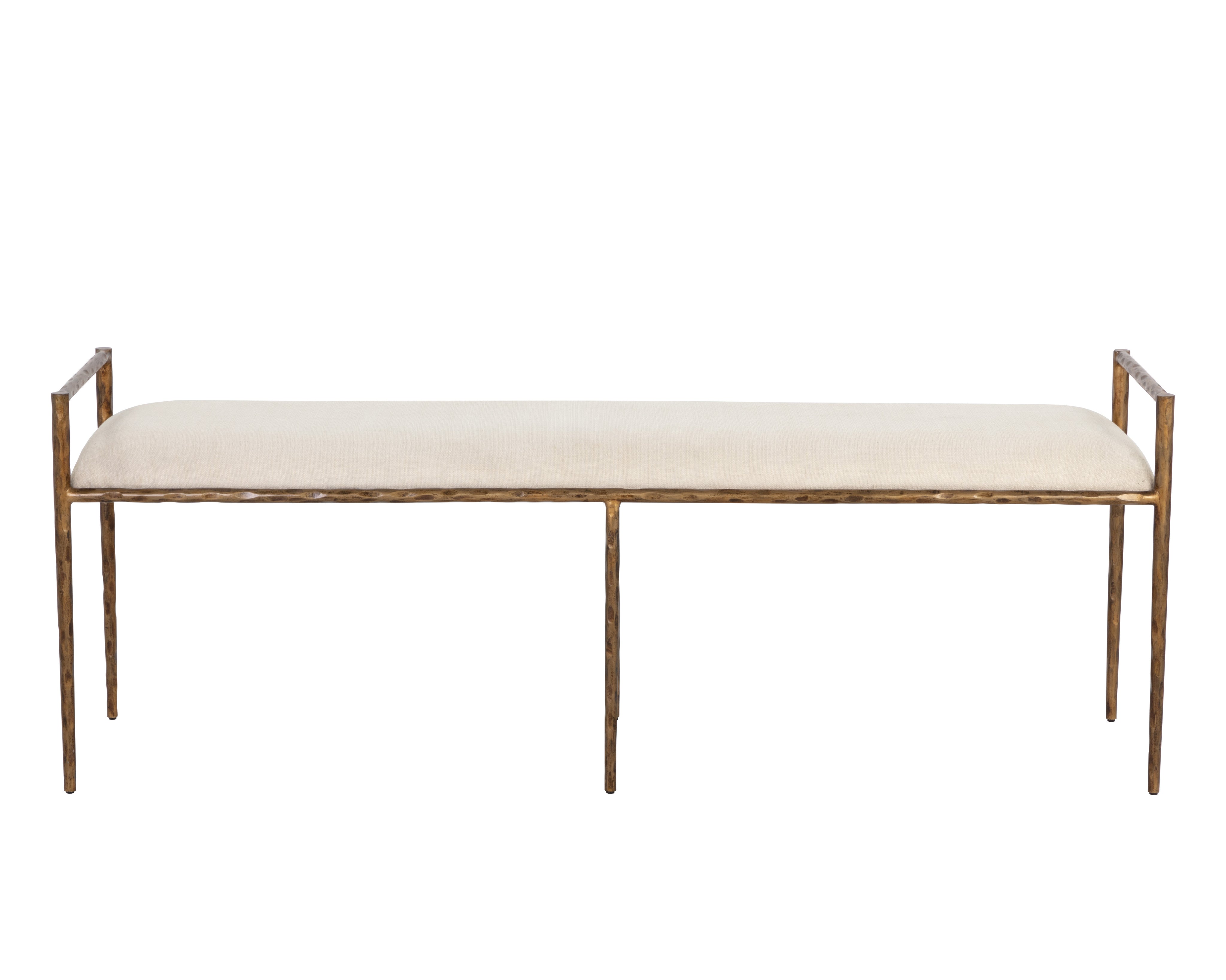 Rich with texture, this impressive bench is infused with an exotic touch. Stocked in zenith alabaster performance fabric, and completed with a hammered antique brass steel frame. Performance fabric is moisture repellent, durable and easy to clean. Made in India. With refined craftsmanship, this design was brought to life by skilled local artisans. By nature, these materials develop unique imperfections such as fissures, markings and colour variations for a truly one-of-a-kind piece.