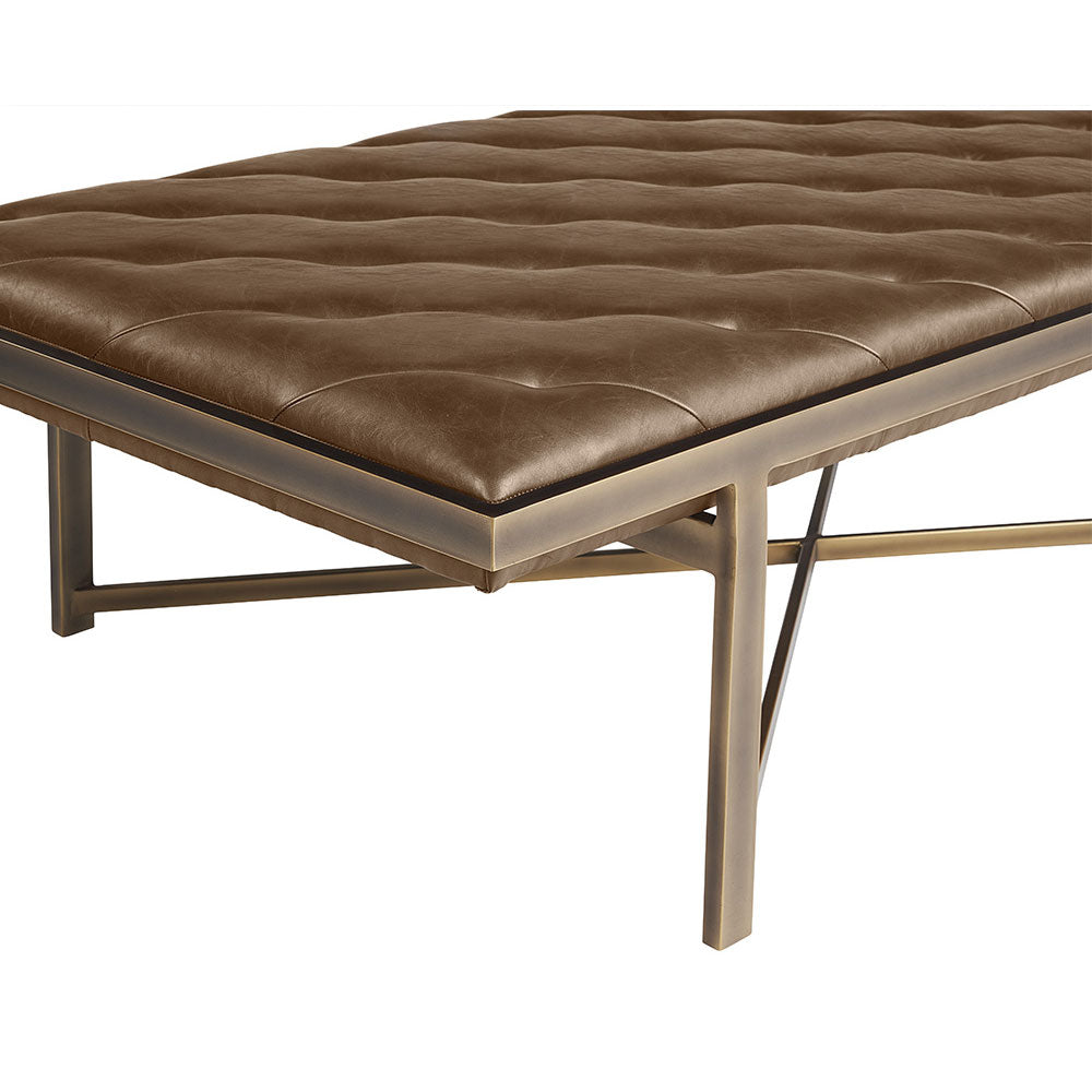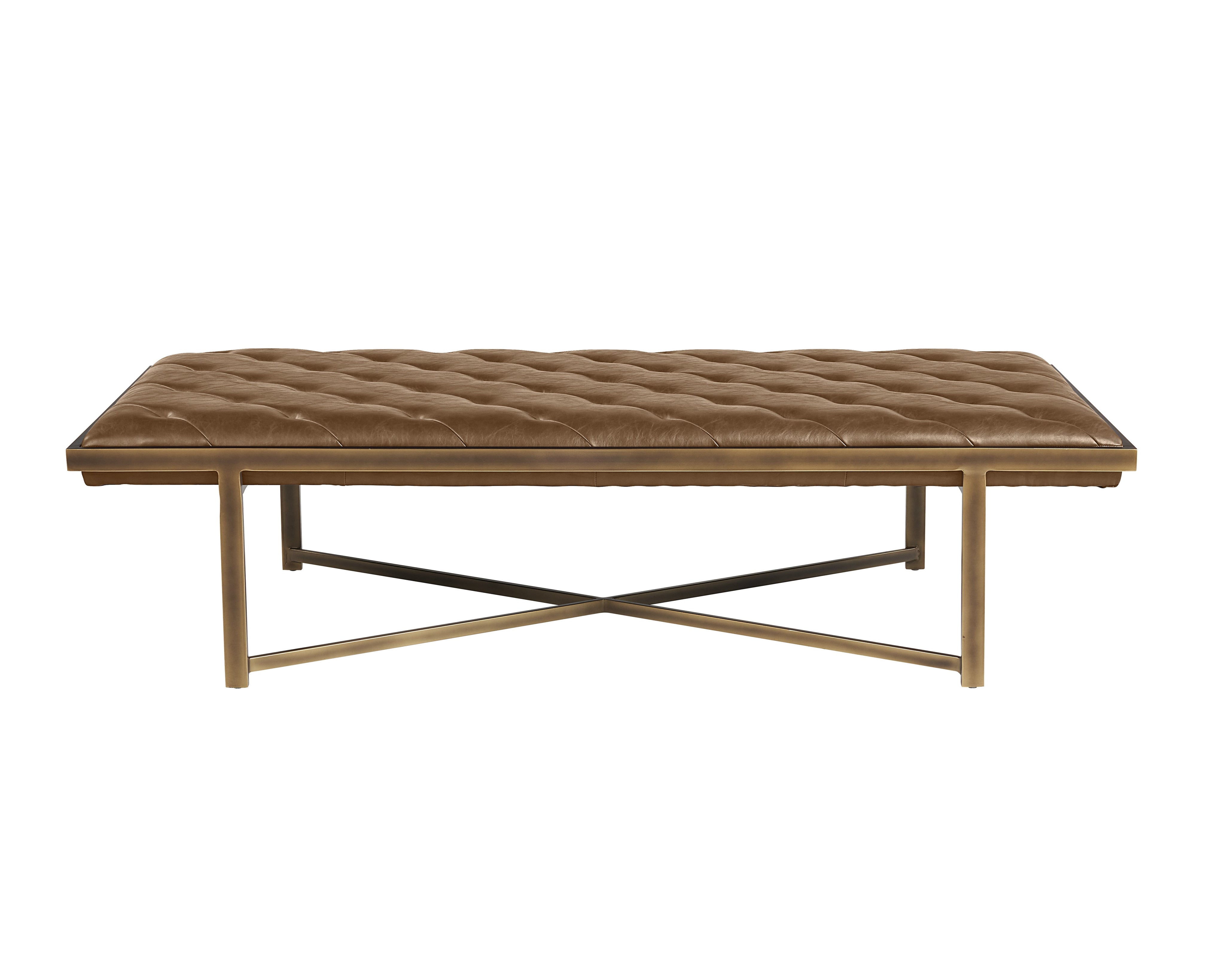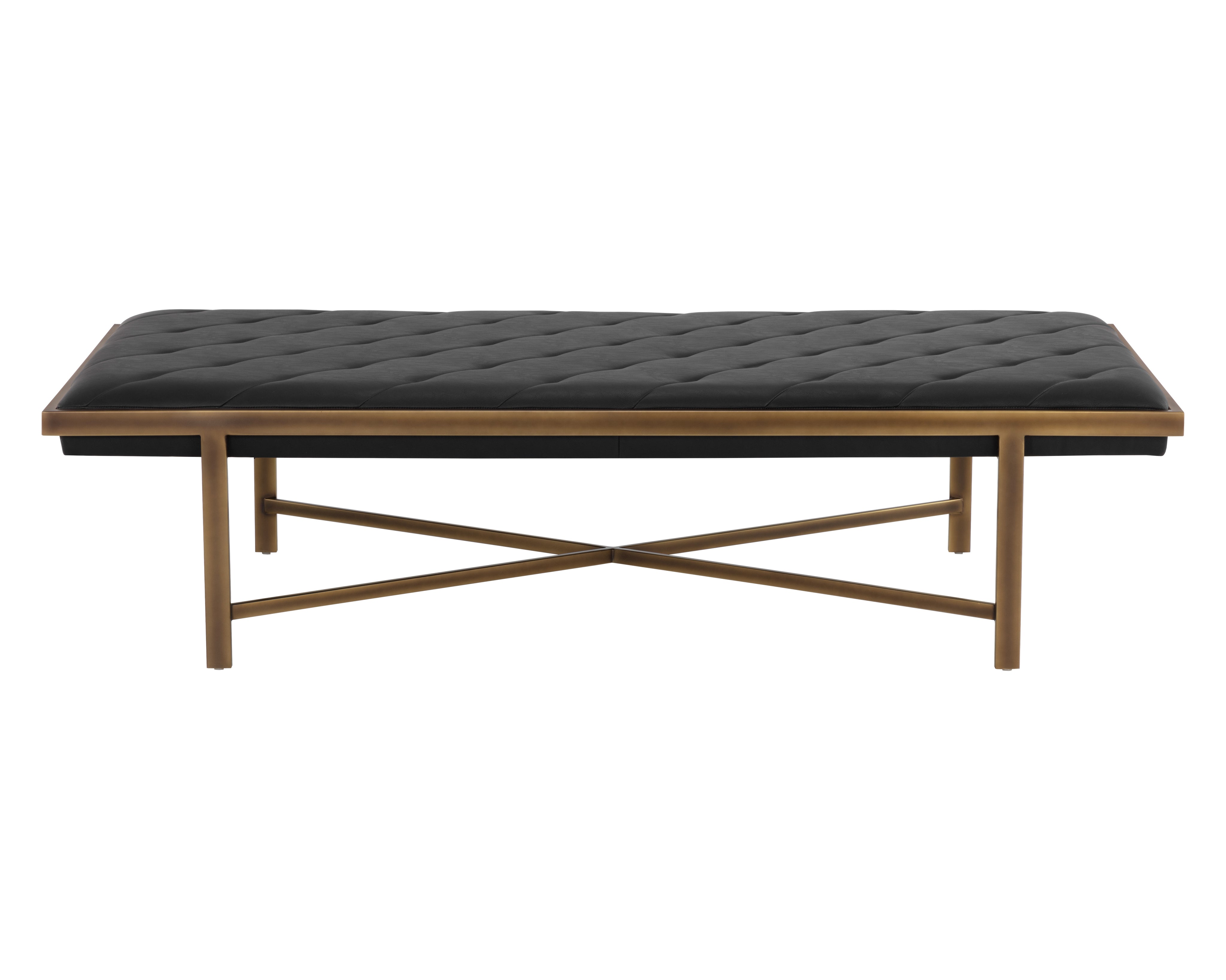 This large bench exudes opulent transitional style. Features diagonal tufting with an exposed x-base frame. Stocked in vintage black faux leather with an antique brass frame. Can be used as a daybed, coffee table or as extra seating in residential and commercial spaces. Handle With Care: This design has been crafted with faux leather. Faux leather is manufactured to reflect the natural characteristics of leather; as such, colour variations, markings, wrinkles, grooves, and light scratches are appreciated characteristics. No two pieces will be alike. Visit our Product Care page for more information on how to ensure the lasting beauty of this piece.
