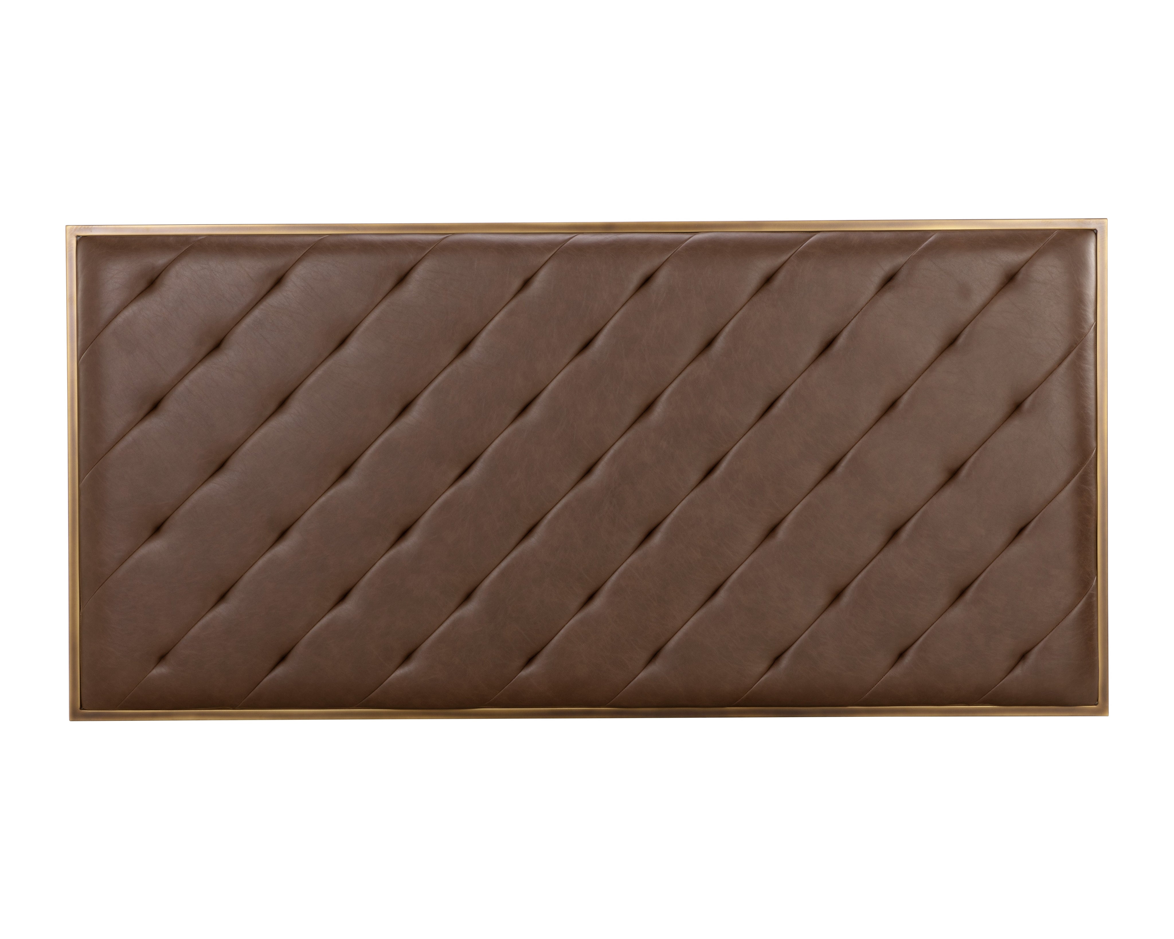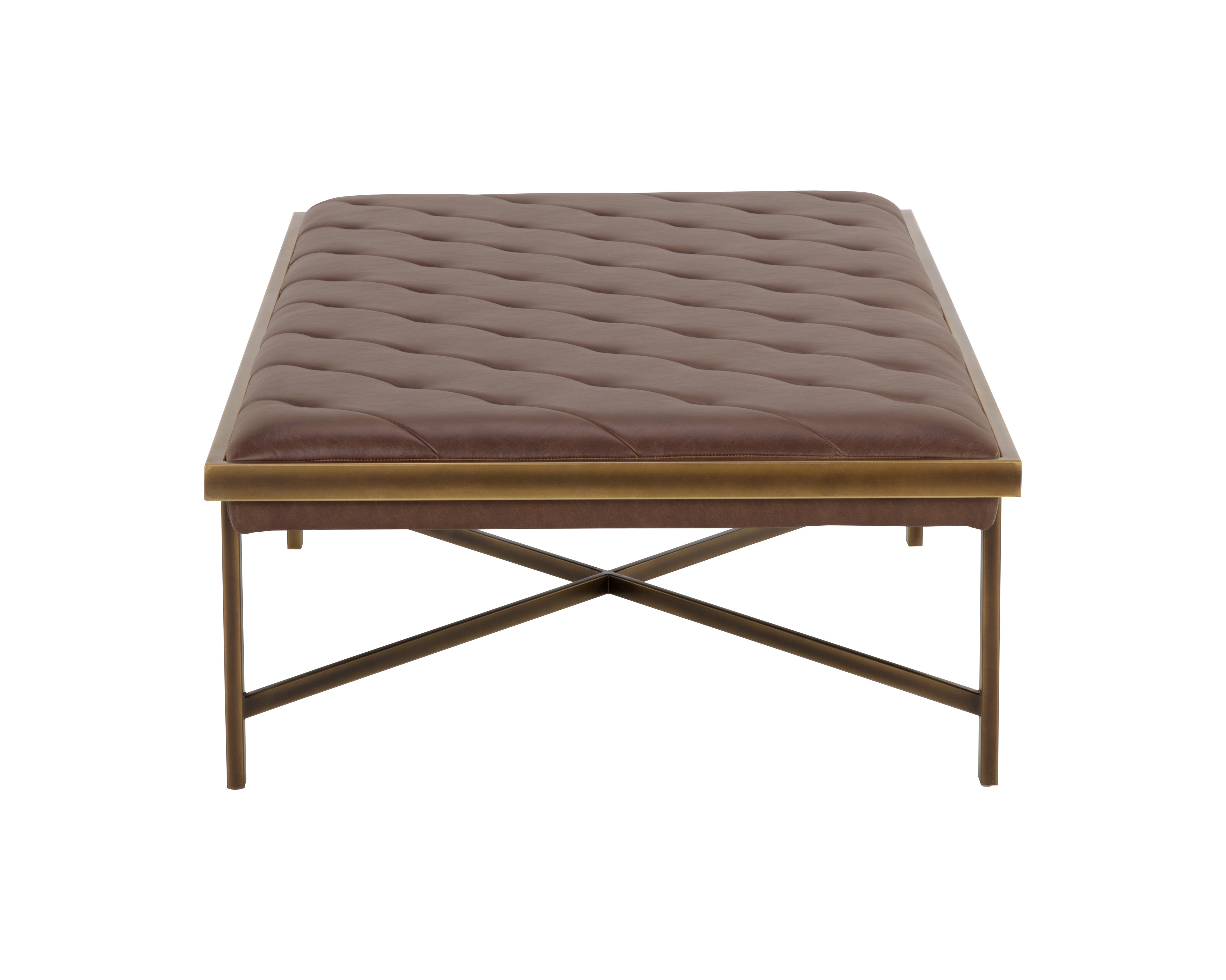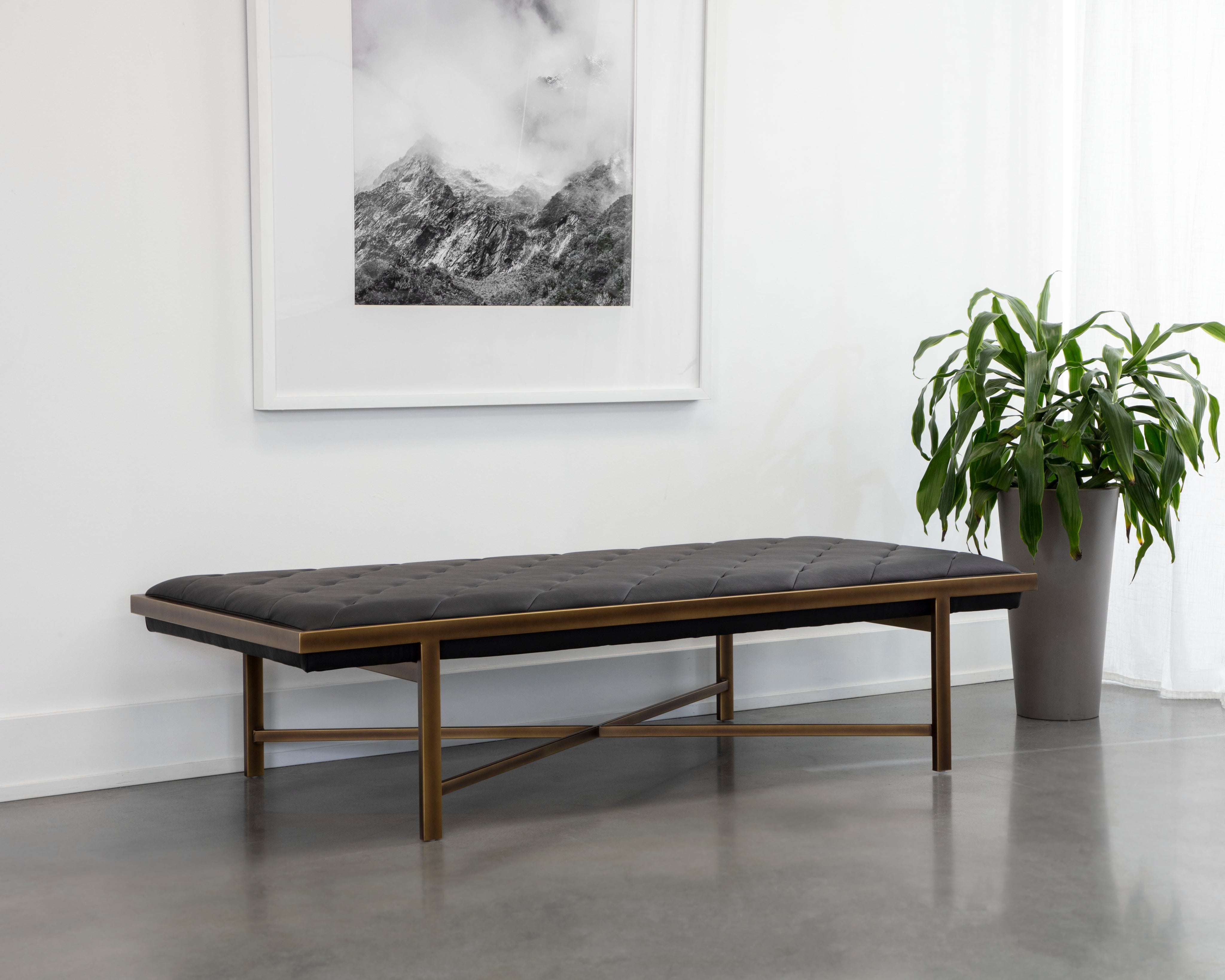 This large bench exudes opulent transitional style. Features diagonal tufting with an exposed x-base frame. Stocked in vintage black faux leather with an antique brass frame. Can be used as a daybed, coffee table or as extra seating in residential and commercial spaces. Handle With Care: This design has been crafted with faux leather. Faux leather is manufactured to reflect the natural characteristics of leather; as such, colour variations, markings, wrinkles, grooves, and light scratches are appreciated characteristics. No two pieces will be alike. Visit our Product Care page for more information on how to ensure the lasting beauty of this piece.