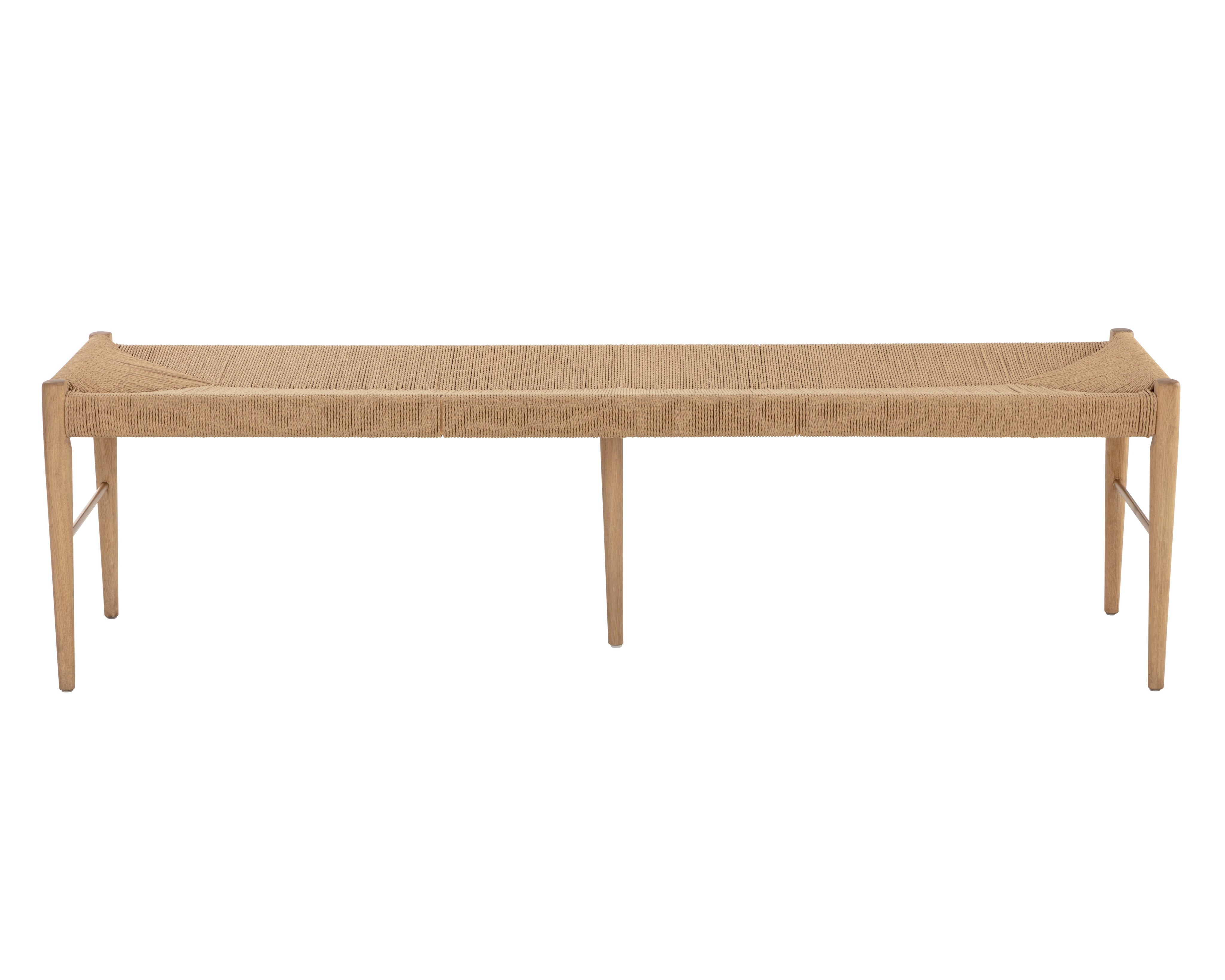 The Moira bench brings together a sleek modern silhouette with a coastal look. Features sturdy seating made from natural paper rope and a white wash oak frame. Brass painted stretcher bars complete the design. As wood is an organic, porous material, these pieces will contain natural variation of texture and may also exhibit fine indentations and cracks. Wood pieces will also display a disparity of colour and grain, and visible knots and burls that add to the character of each piece. Due to the natural contents of natural paper rope, it is advised to minimize contact with strongly dyed fabrics to avoid discolouration and/or colour transfer.