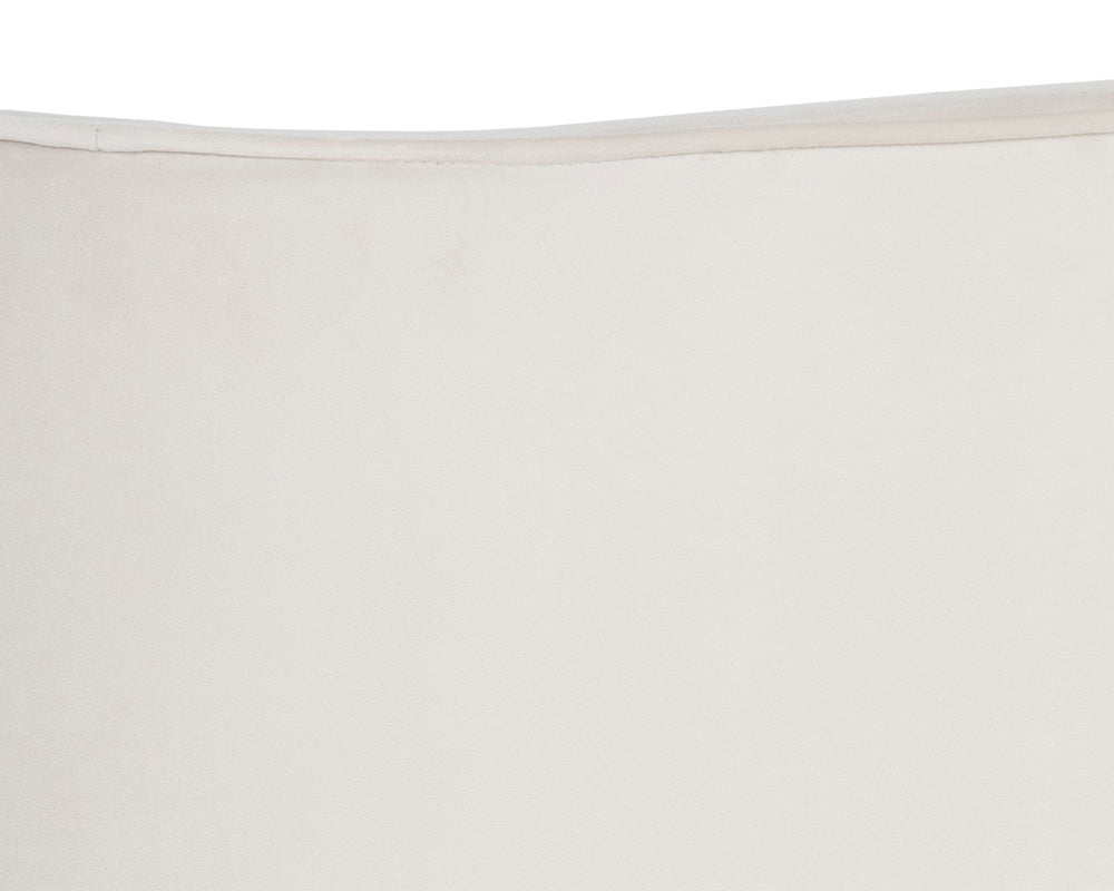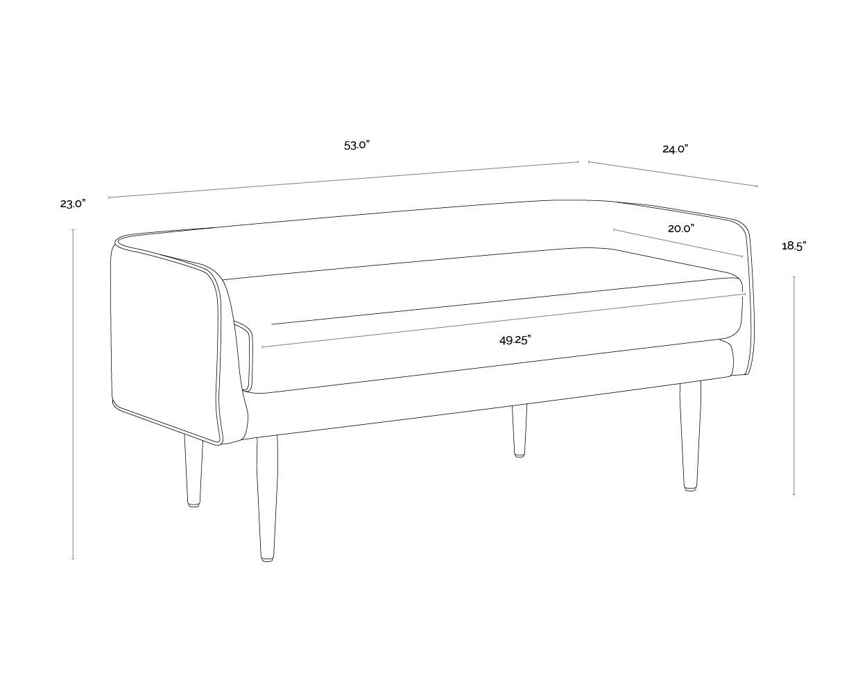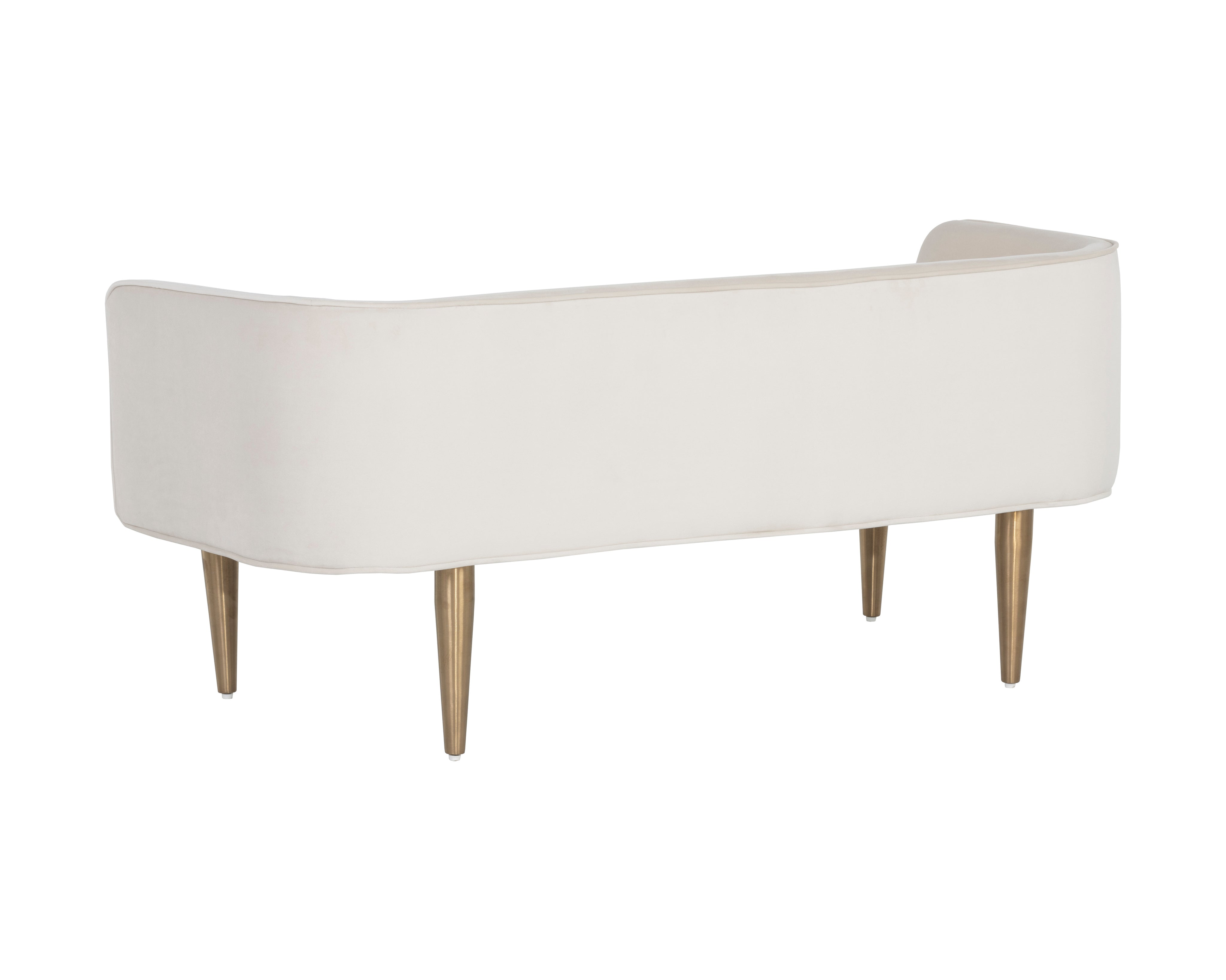 A delicately designed bench suitable for placement in a lobby or lounge, at the foot of a bed, or in an customized dressing room. Stocked in soft black, grey or cream sky fabric with brushed gold stainless steel legs.