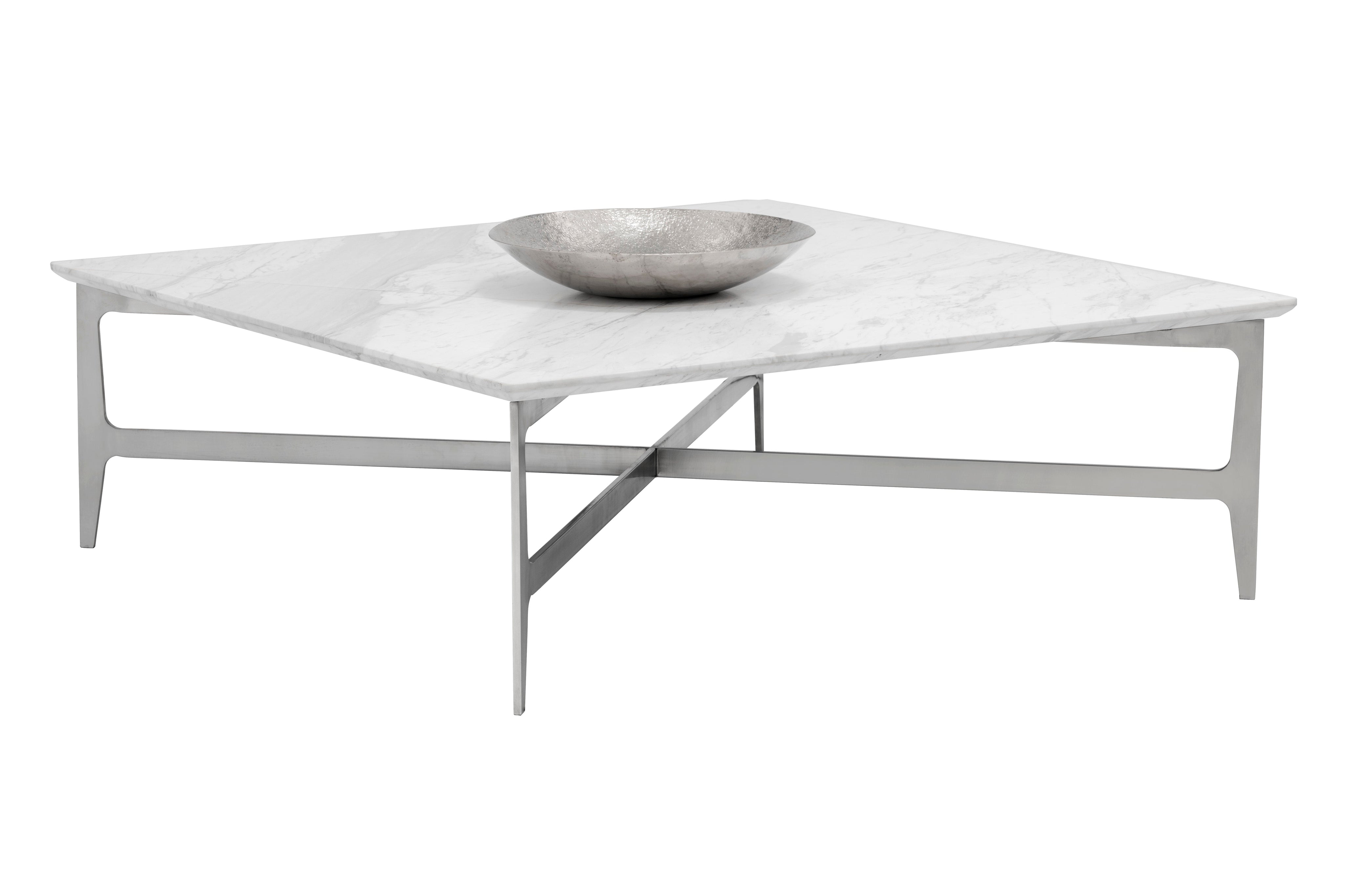 Chic and elegant, this spectacular coffee table features a brushed stainless steel base with a beveled white marble layer top. Each piece is uniquely marked with grey veining. As marble is a natural material, unique veining, pitting, fissures, micro-cracks and colour variations are all characteristics that add to the uniqueness and beauty of each piece.