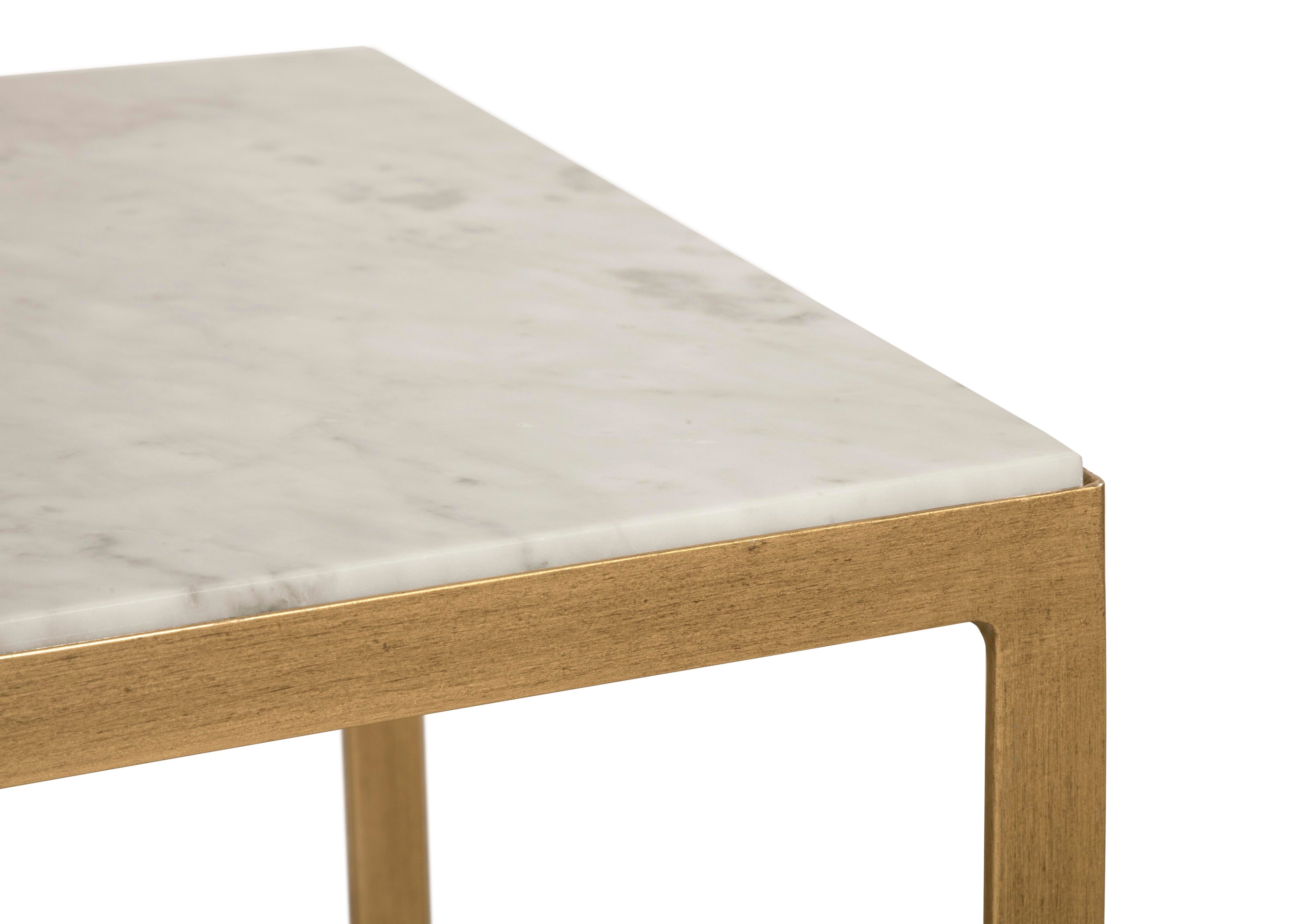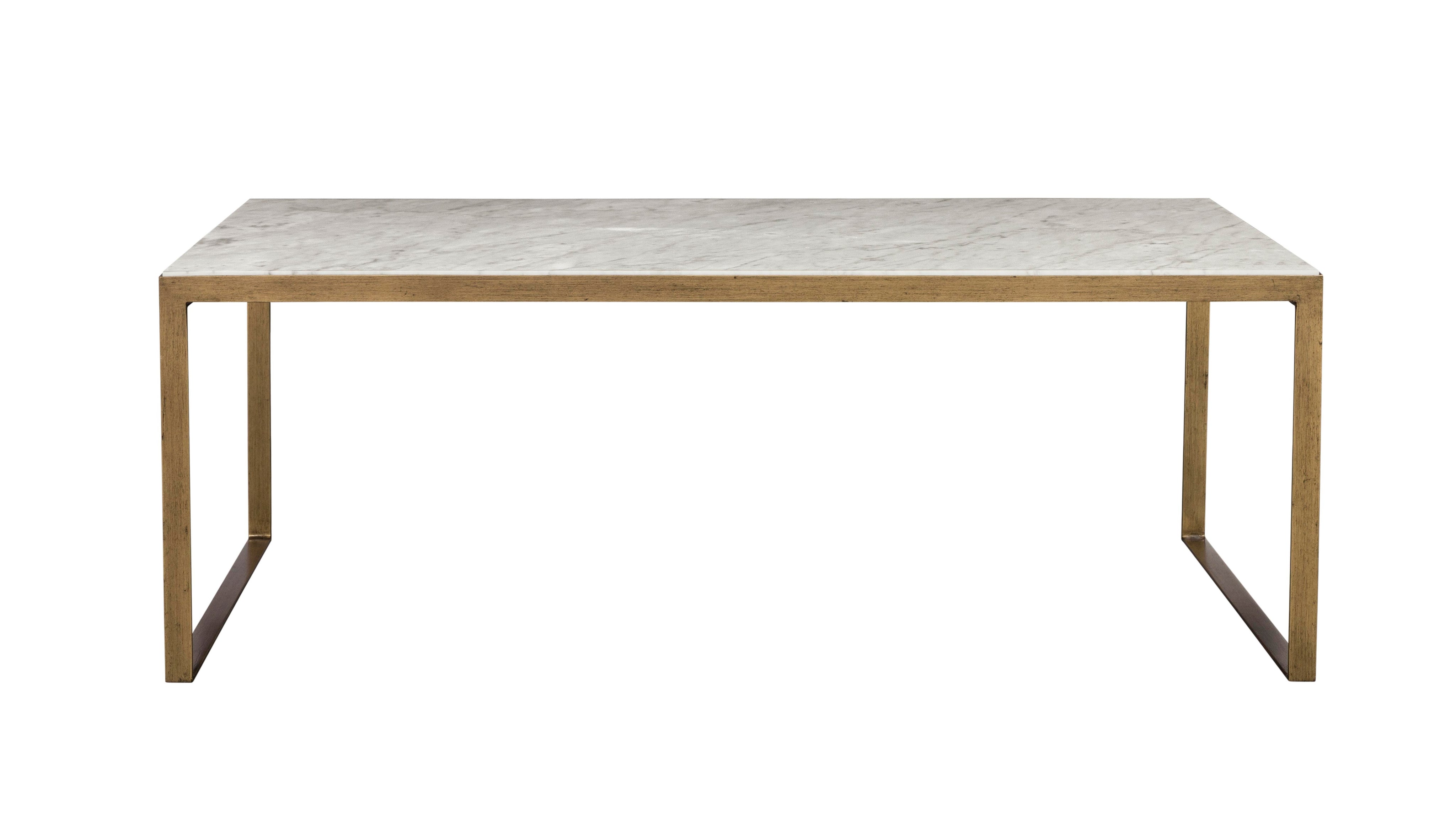 A beautiful modern marble coffee table. Tabletop features a 1" layer of white Italian marble supported by an antique brass iron frame. Can be paired with our high profile Evert coffee table for added dimension. Each piece sold separately. As marble is a natural material, unique veining, pitting, fissures, micro-cracks and colour variations are all characteristics that add to the uniqueness and beauty of each piece.