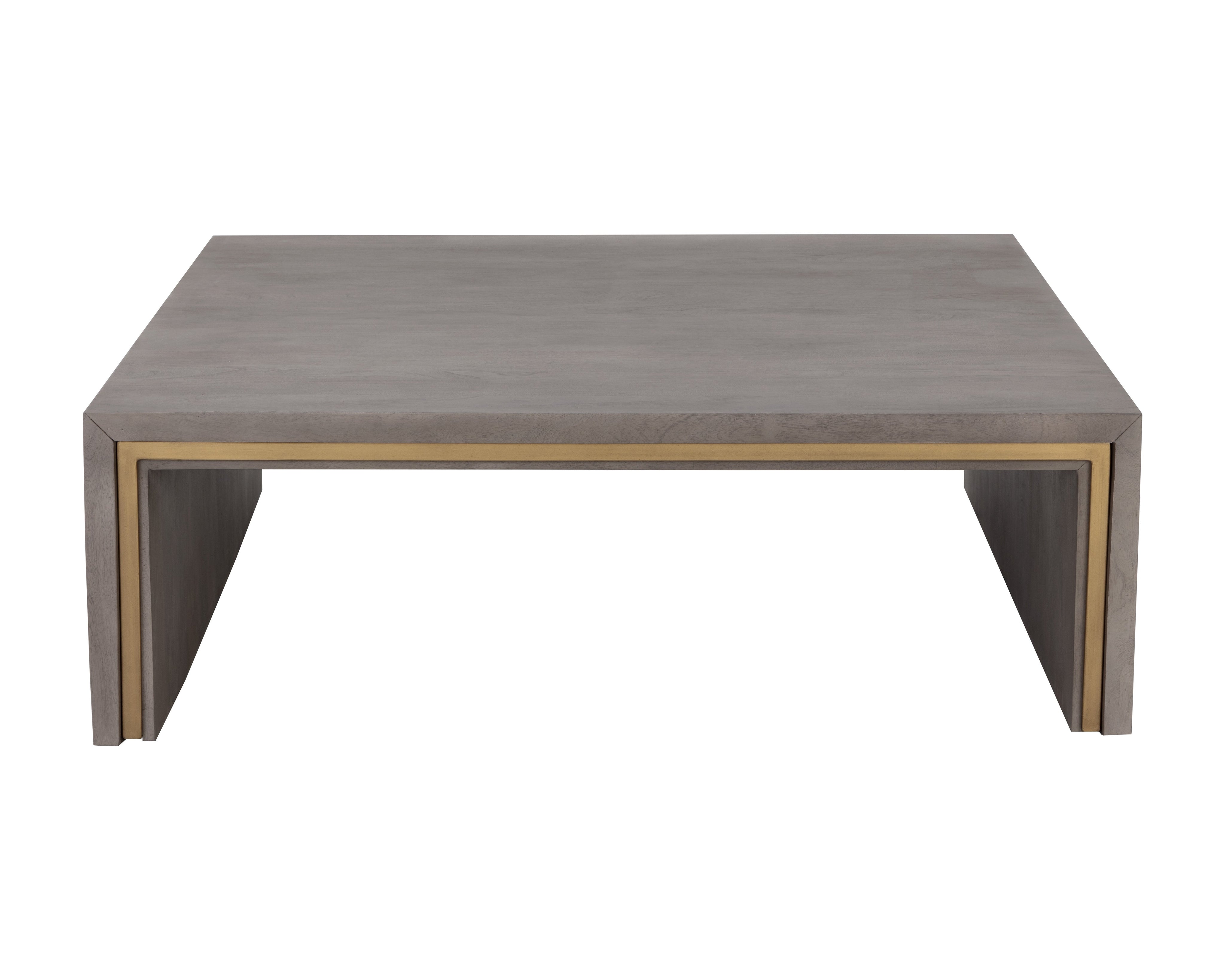 The Hilbert Coffee Table is grounded in a functional modern design. Crafted from grey acacia wood, this console table features a sharp linear silhouette. A brass iron trim on the front and the back of the piece provides added dimension and intrigue to the overall look. As wood is an organic, porous material, these pieces will contain natural variations of texture and may also exhibit fine indentations and cracks. Wood pieces will also display a disparity of colour and grain, and visible knots and burls that add to the character of each piece. Made in India. With refined craftsmanship, this design was brought to life by skilled local artisans. Due to the nature of handcraftsmanship, unique imperfections such as fissures, markings and variations in colour and shape are welcomed and appreciated characteristics for a truly one-of-a-kind piece.
