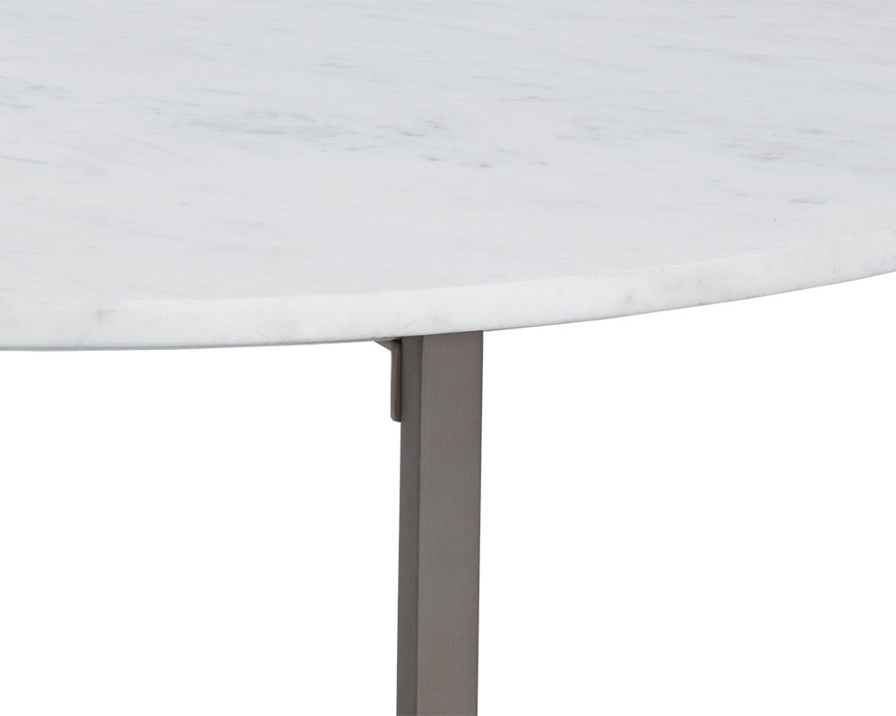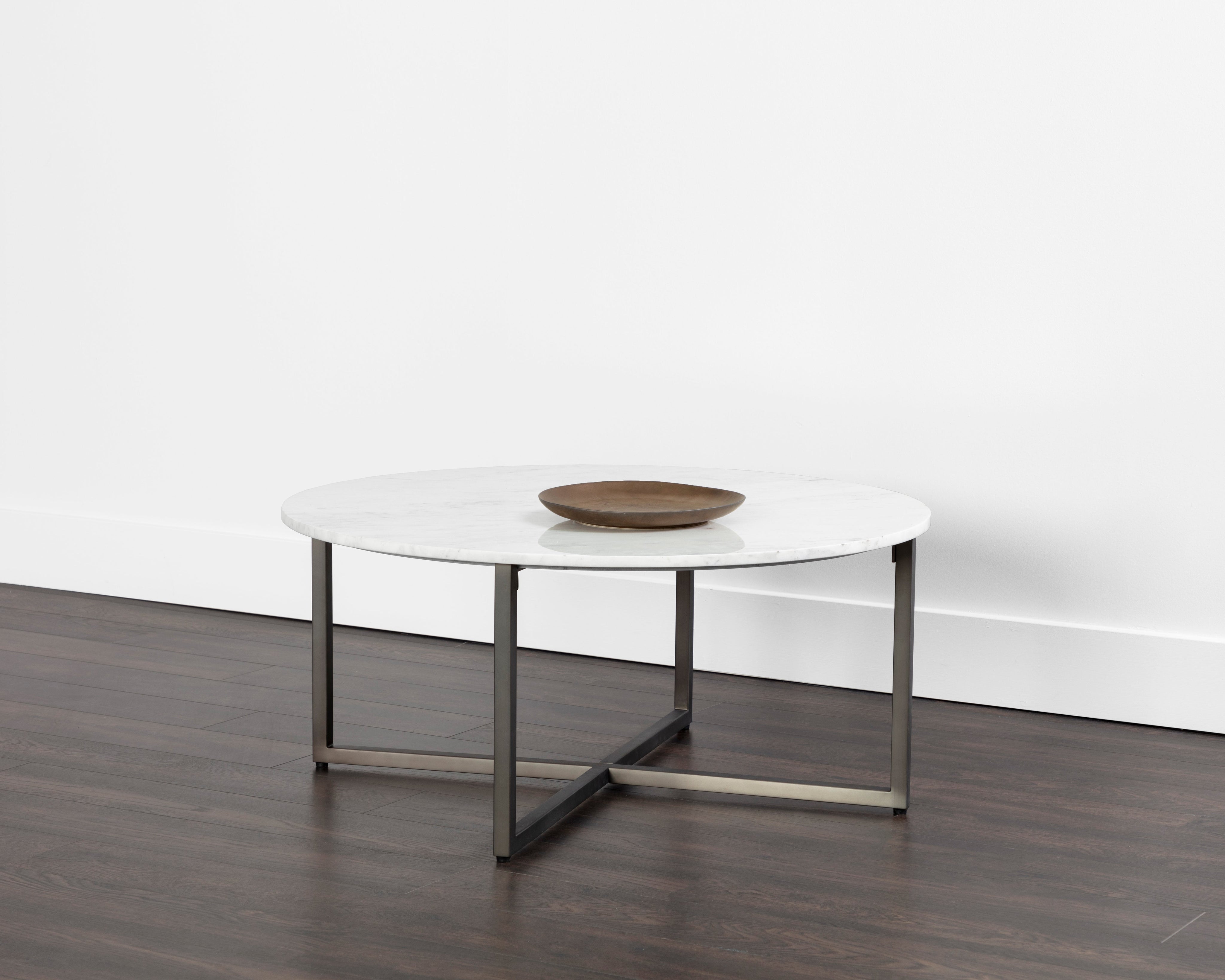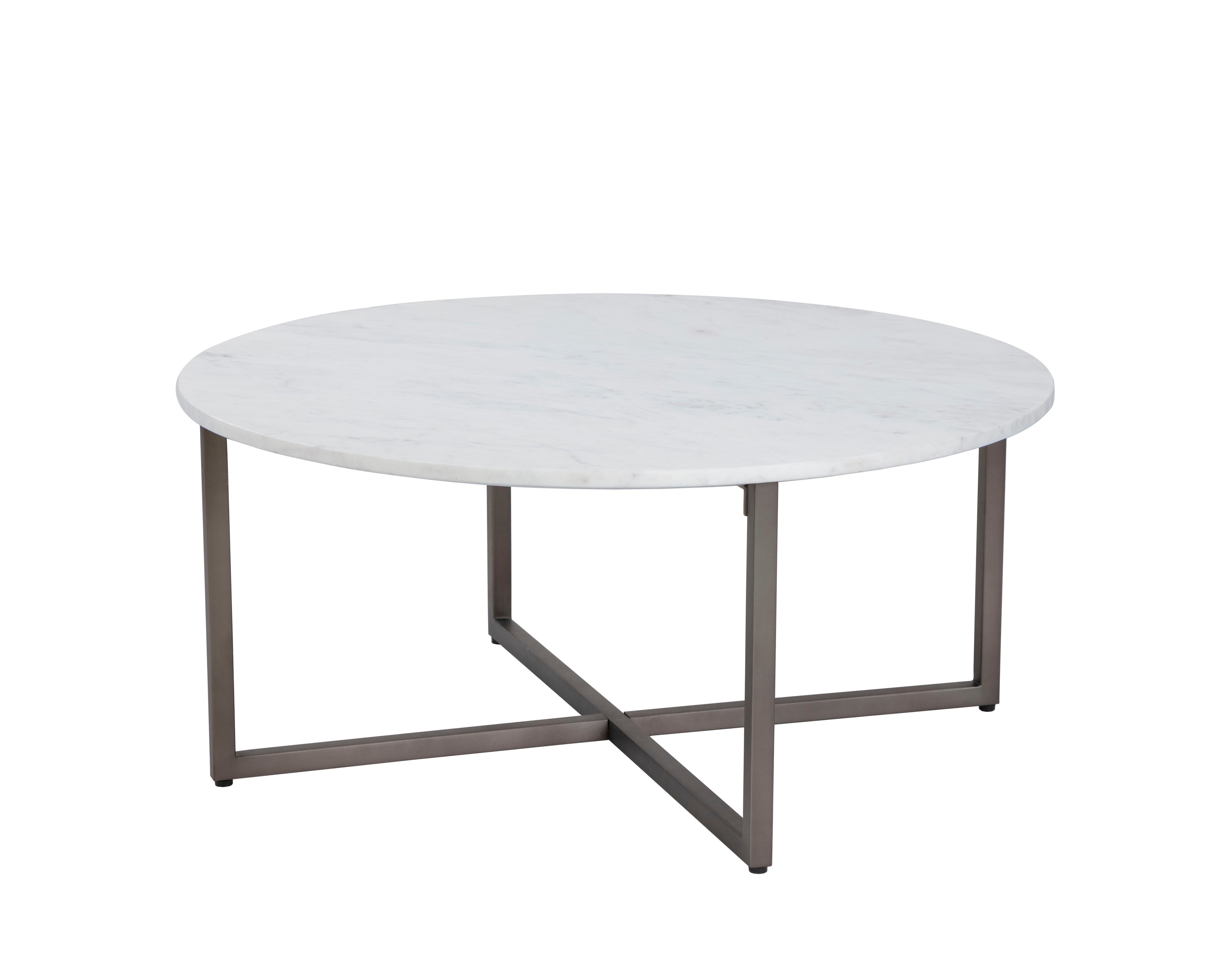 Boasting a minimalist design, this modern coffee table illustrates the contrasting beauty of smooth curves with rigid lines. Features a round, white marble top with a stainless steel gunmetal base. Also available in an oval version with coordinating console and end tables. As marble is a natural material, unique veining, pitting, fissures, micro-cracks and colour variations are all characteristics that add to the uniqueness and beauty of each piece. Made in India. With refined craftsmanship, this design was brought to life by skilled local artisans. Due to the nature of handcraftsmanship, unique imperfections such as fissures, markings and variations in colour and shape are welcomed and appreciated characteristics for a truly one-of-a-kind piece.
