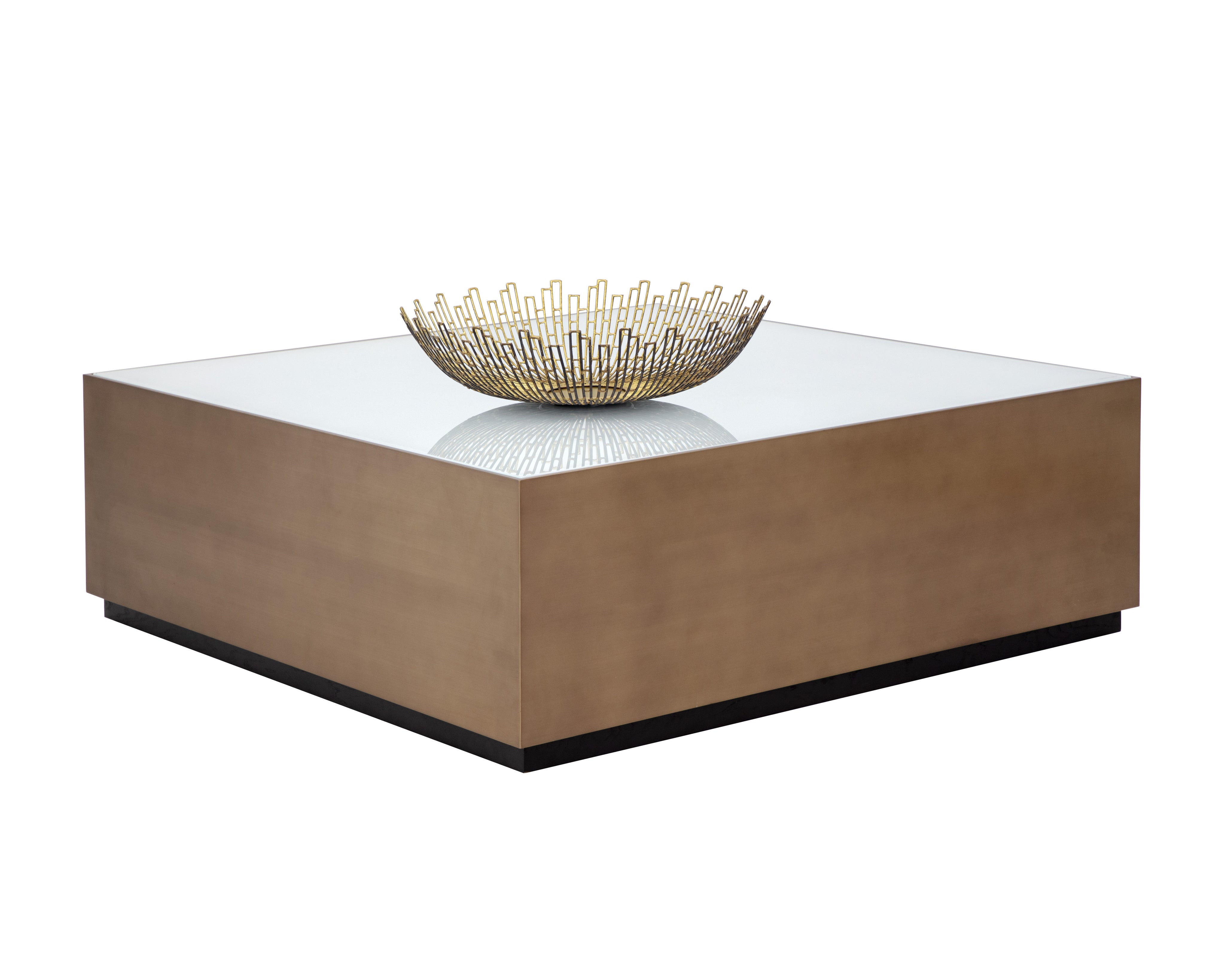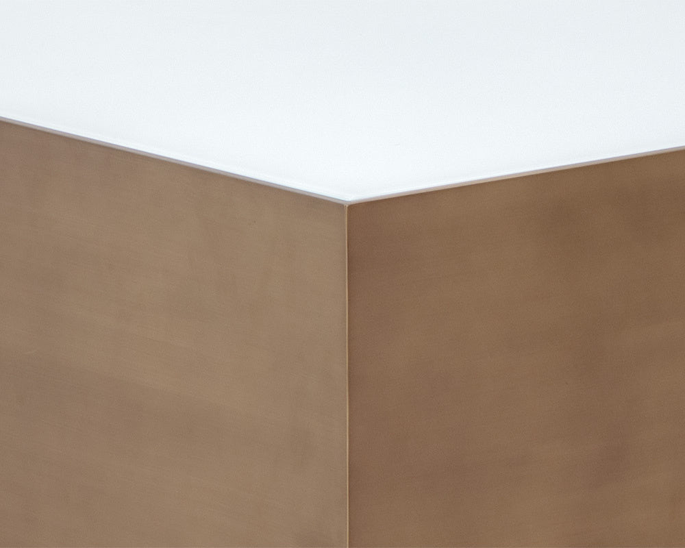 This large, stylish coffee table is elegant and modern. The unique white glass top is framed with a stunning brushed gold stainless steel frame and black oak wood base. Suitable for commercial and residential environments.