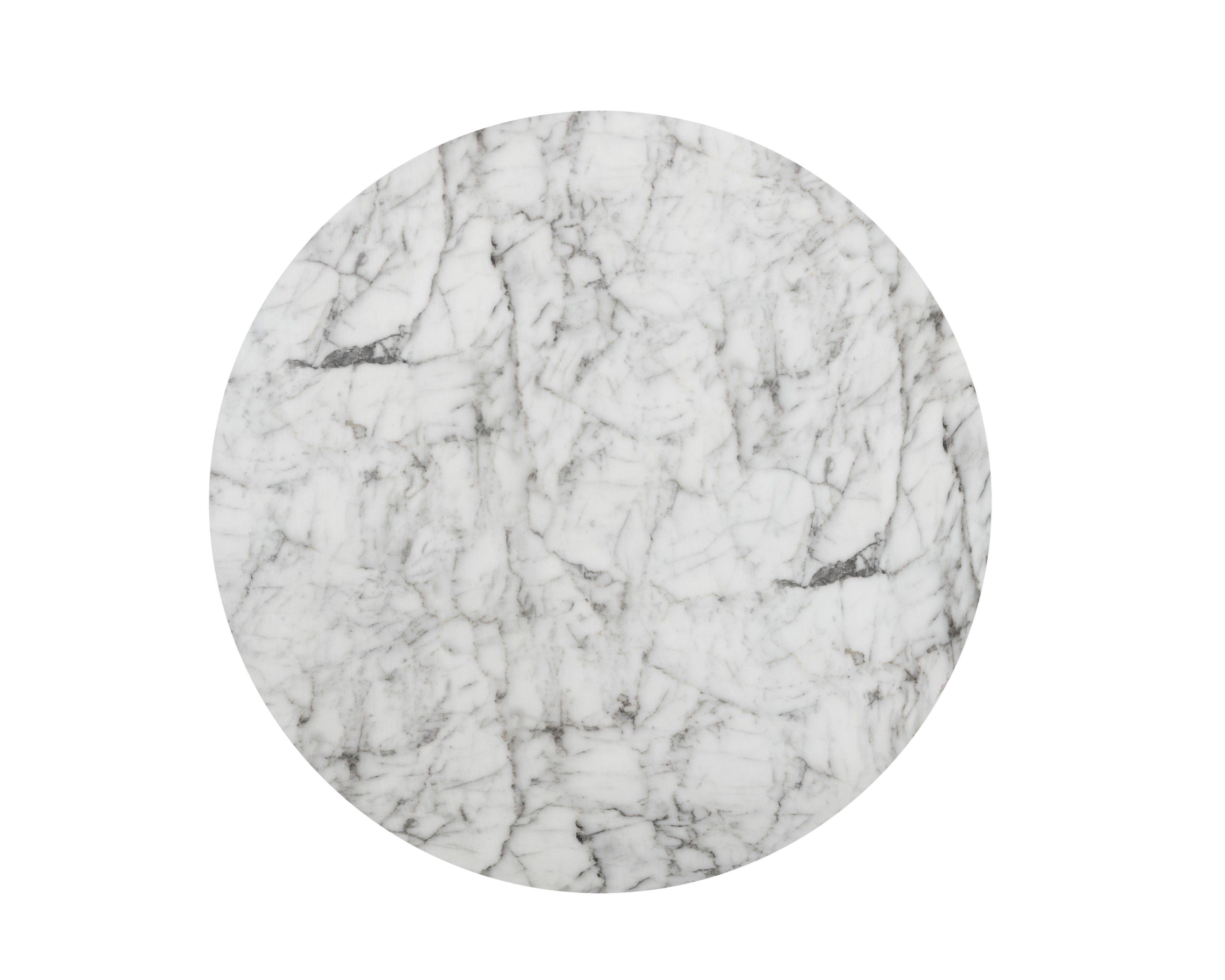 This round coffee table combines natural and industrial elements for a dramatic look. Features a white marble look film top supported by an architecturally designed brushed antique brass metal base. Suitable for residential and contract environments.