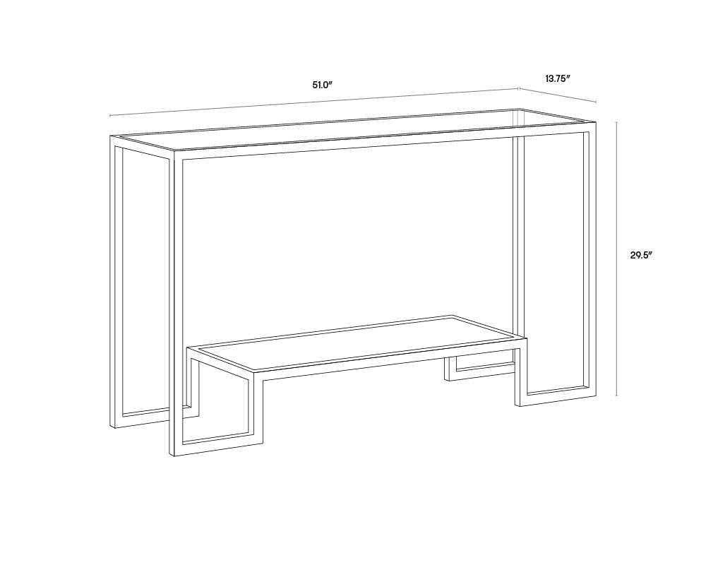 This console table combines contemporary with rustic elements reminiscent of mid-century modern styling. Features a tempered glass top, a bottom shelf composed of planks of solid Elm in a smoked brown finish, and a rich matte gold stainless steel frame.