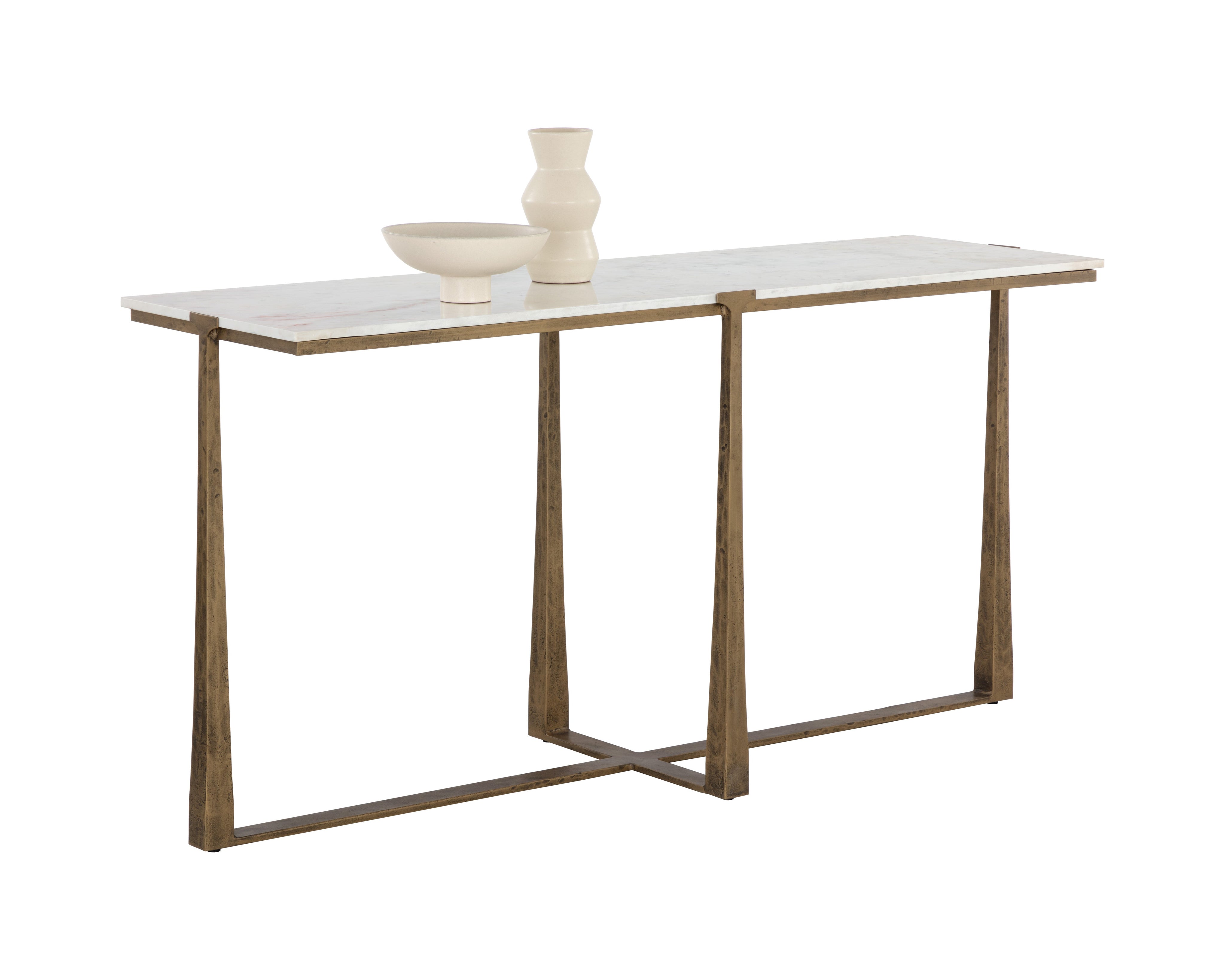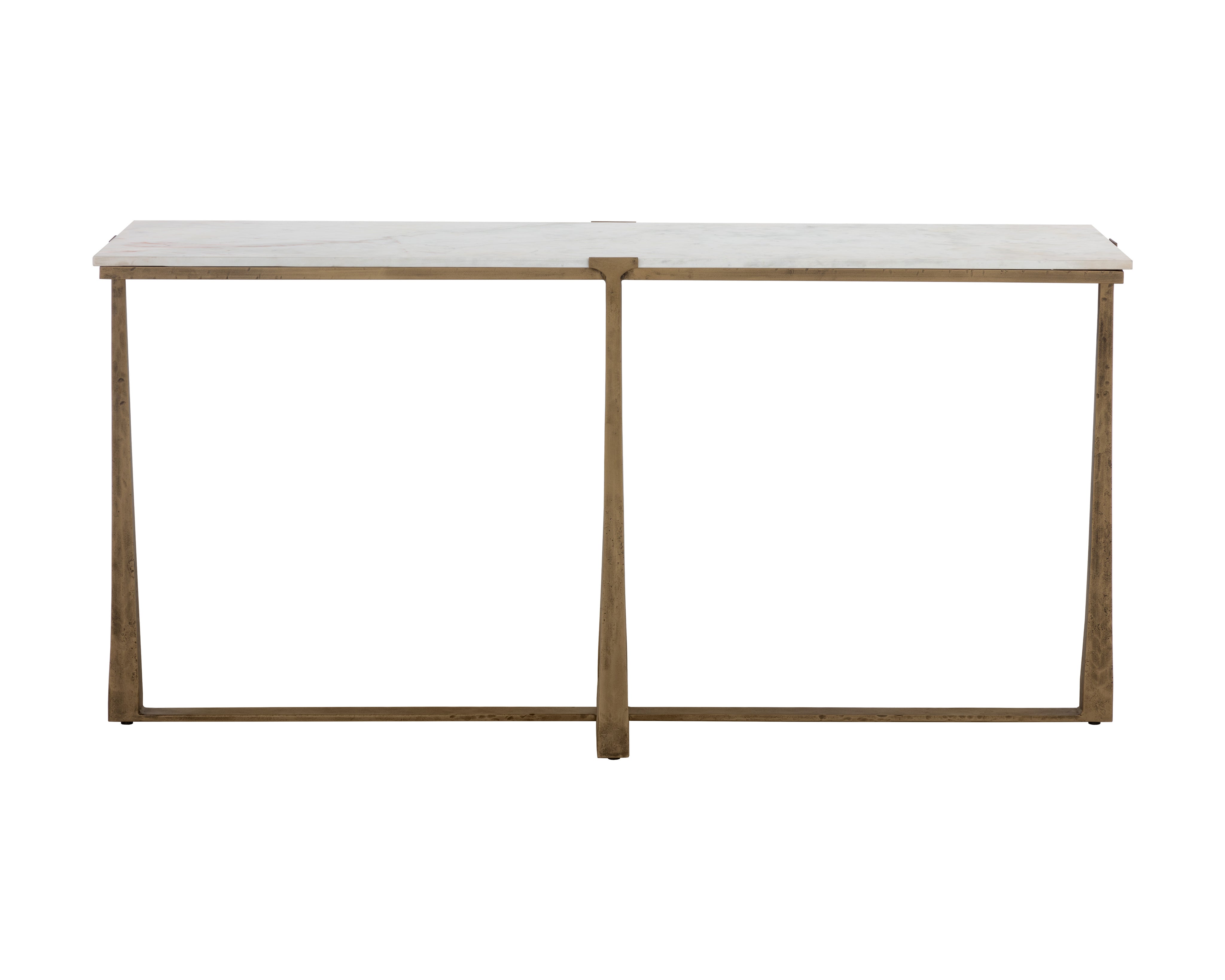 Inspired by mid-century design, the Cowell Console Table features a chic, minimal aesthetic that will elevate any room. The powder-coated antique brass finished legs give off a rustic sensibility that contrasts with the cool white marble top. As marble is a natural material, unique veining, pitting, fissures, micro-cracks and colour variations are all characteristics that add to the uniqueness and beauty of each piece. Made in India. With refined craftsmanship, this design was brought to life by skilled local artisans. Due to the nature of handcraftsmanship, unique imperfections such as fissures, markings and variations in colour and shape are welcomed and appreciated characteristics for a truly one-of-a-kind piece.