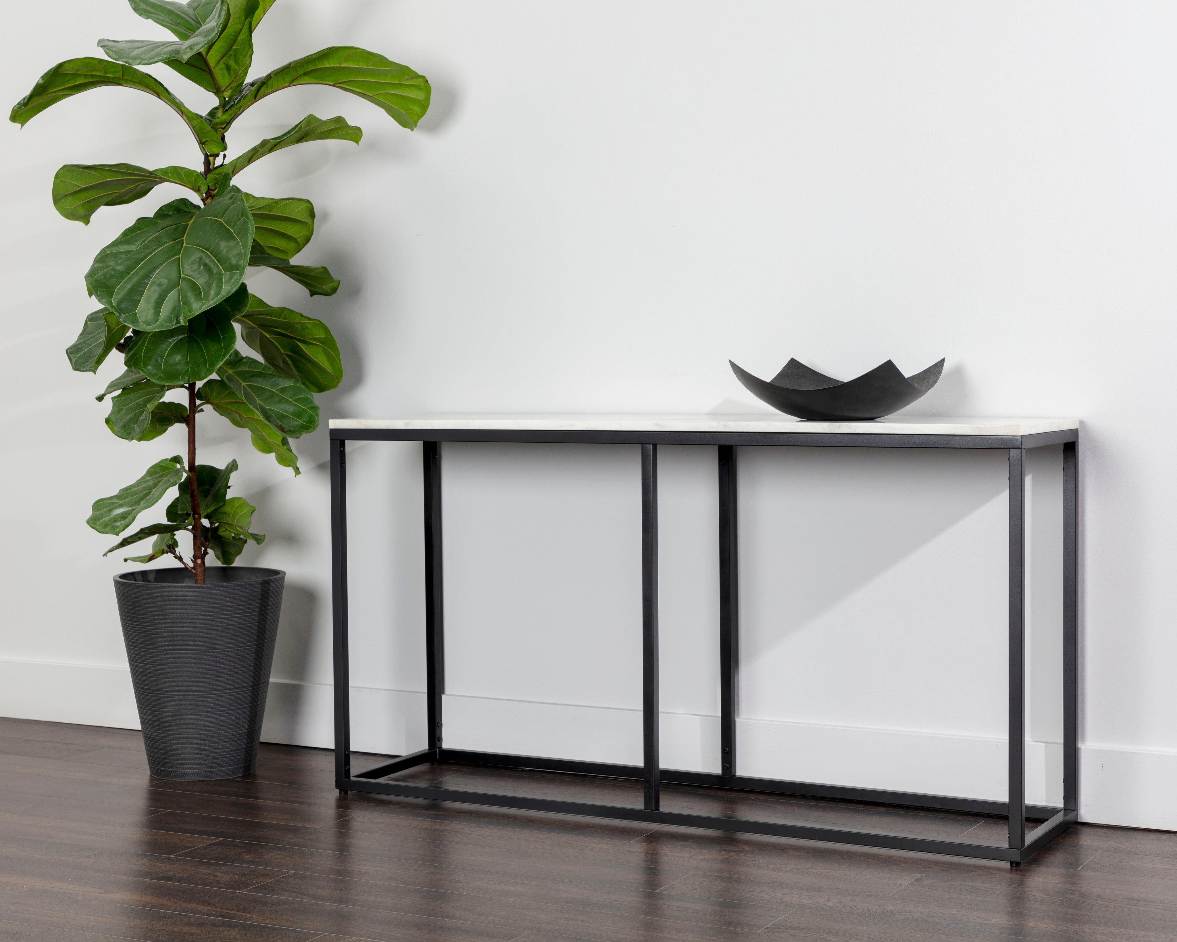 With an understated design, this modern console table is made distinct by clean lines. Features a white polished natural marble table top with a matte black powder coated steel base. Coordinating coffee and end tables also available. As marble is a natural material, unique veining, pitting, fissures, micro-cracks and colour variations are all characteristics that add to the uniqueness and beauty of each piece. Made in India. With refined craftsmanship, this design was brought to life by skilled local artisans. Due to the nature of handcraftsmanship, unique imperfections such as fissures, markings and variations in colour and shape are welcomed and appreciated characteristics for a truly one-of-a-kind piece.