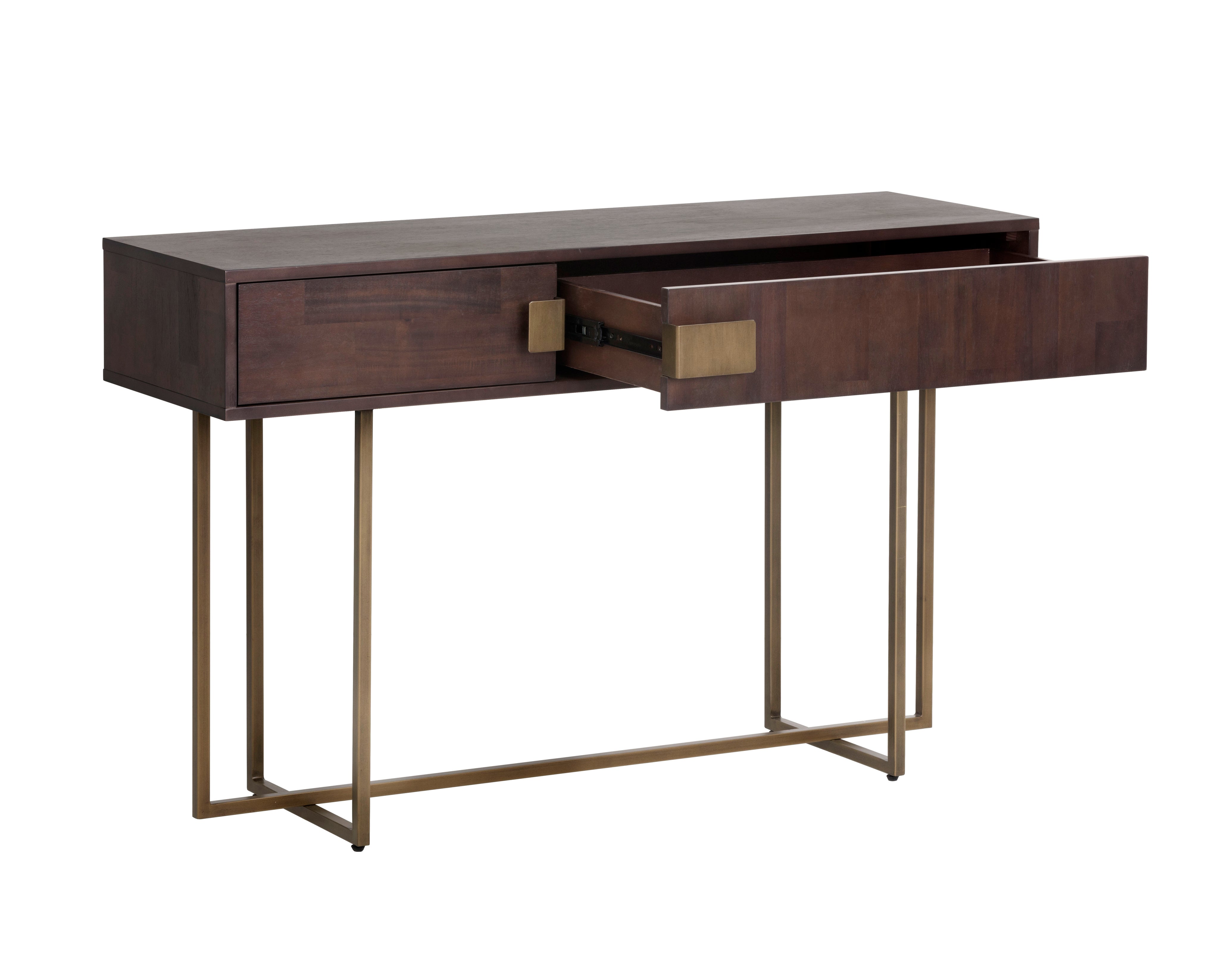 This uniquely crafted console table will add transitional allure to any foyer, living or dining space. Made from acacia wood veneer with two drawers. Alternating wood grain patterns on the drawer fronts and antique brass hardware complete the look. Suitable for residential and contract settings.