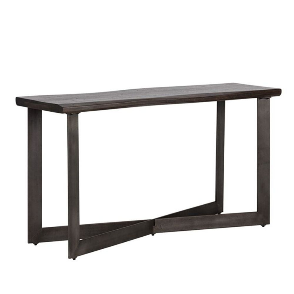 This console table combines rustic and industrial elements perfect for transitional spaces. Featuring a solid acacia wood top in a rich walnut brown finish, with a contrasting antique gunmetal steel base. As wood is an organic, porous material, these pieces will contain natural variation of texture and may also exhibit fine indentations and cracks. Wood pieces will also display a disparity of colour and grain, and visible knots and burls that add to the character of each piece.