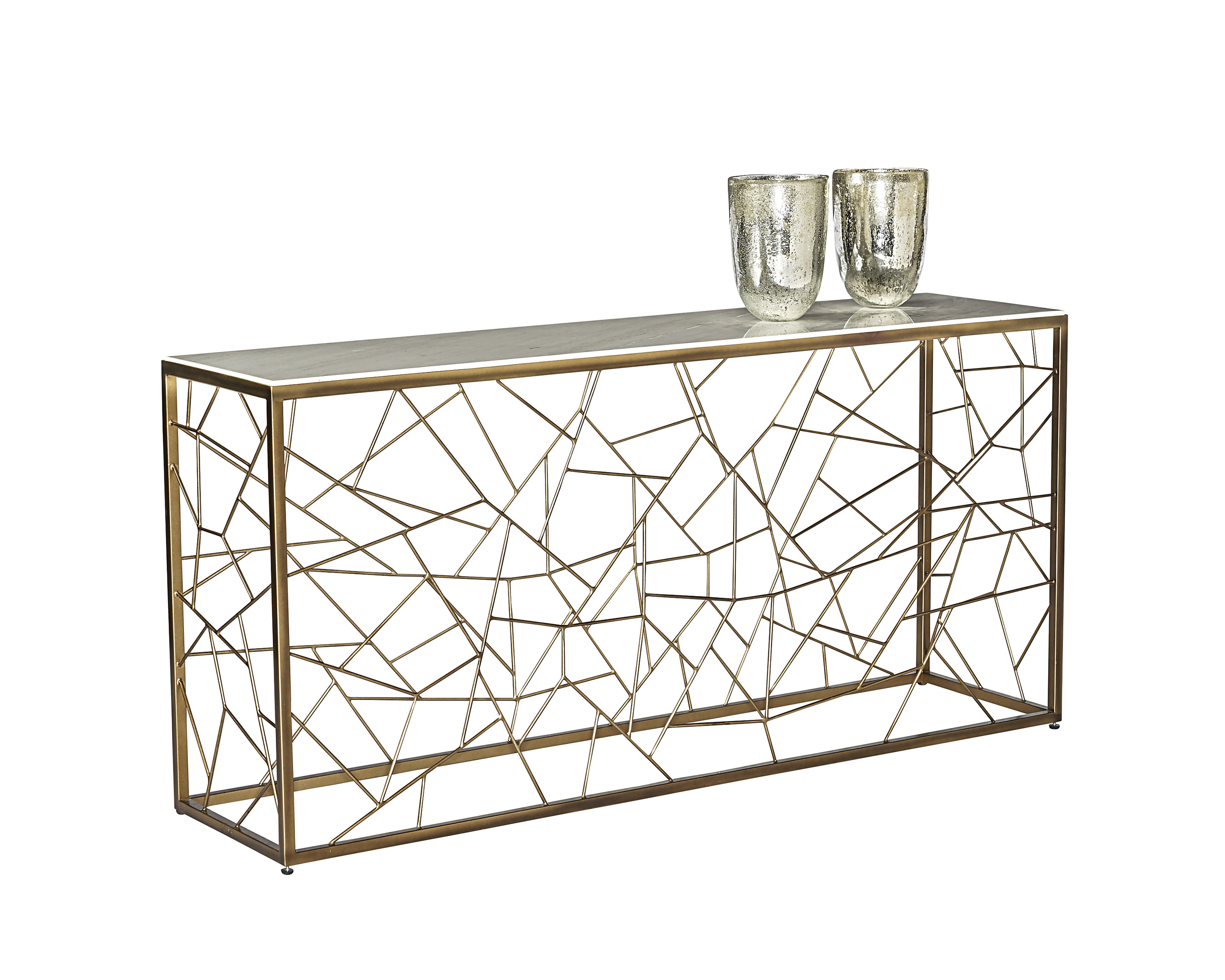 This large and dramatic console table is sure to be the center of attention in any room. A white Volakas marble top is beautifully paired with a powder-coated rustic bronze steel frame in an intriguing webbed pattern. Suitable for lounge and living spaces in residential and commercial environments. As marble is a natural material, unique veining, pitting, fissures, micro-cracks and colour variations are all characteristics that add to the uniqueness and beauty of each piece.