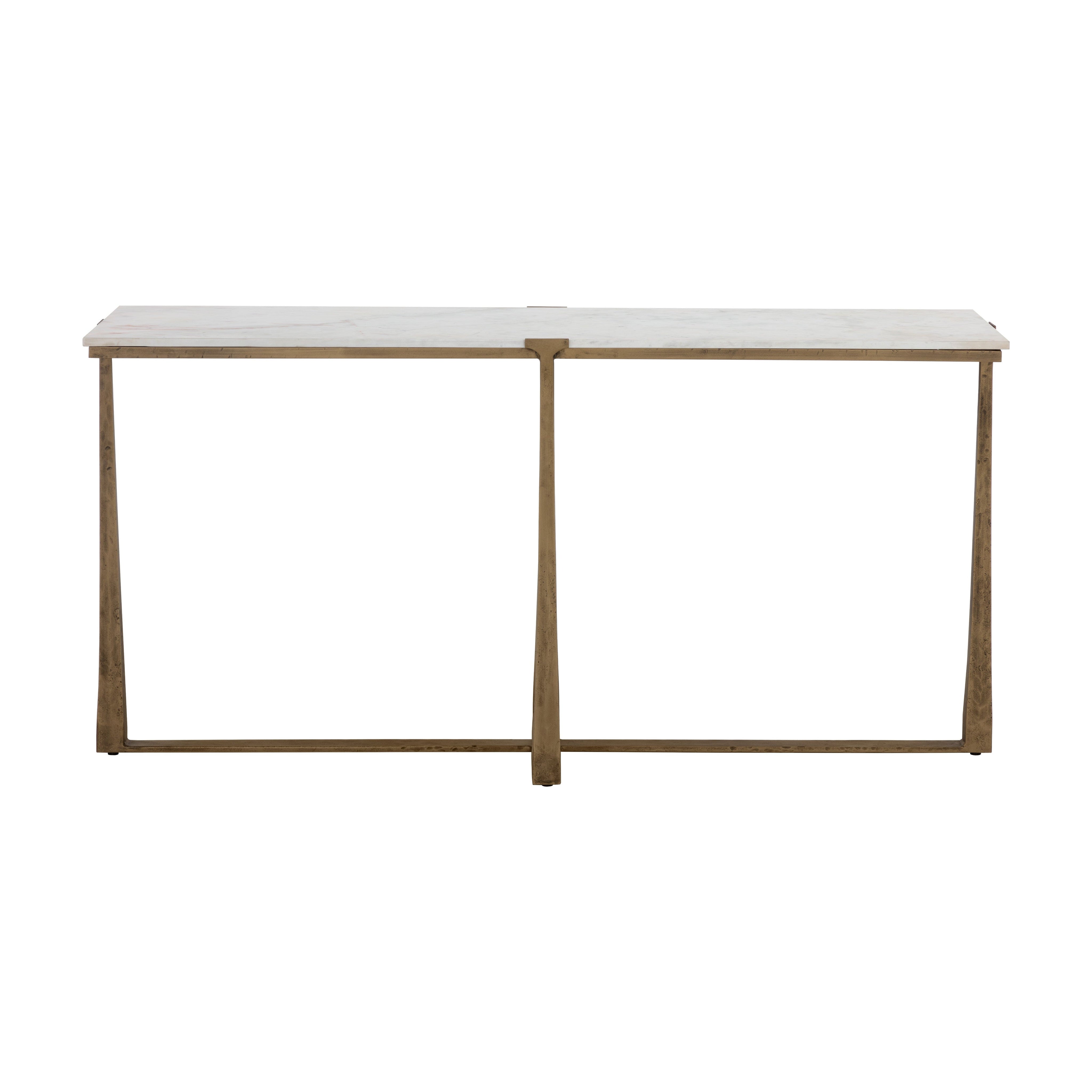 Inspired by mid-century design, the Cowell Console Table features a chic, minimal aesthetic that will elevate any room. The powder-coated antique brass finished legs give off a rustic sensibility that contrasts with the cool white marble top. As marble is a natural material, unique veining, pitting, fissures, micro-cracks and colour variations are all characteristics that add to the uniqueness and beauty of each piece. Made in India. With refined craftsmanship, this design was brought to life by skilled local artisans. Due to the nature of handcraftsmanship, unique imperfections such as fissures, markings and variations in colour and shape are welcomed and appreciated characteristics for a truly one-of-a-kind piece.