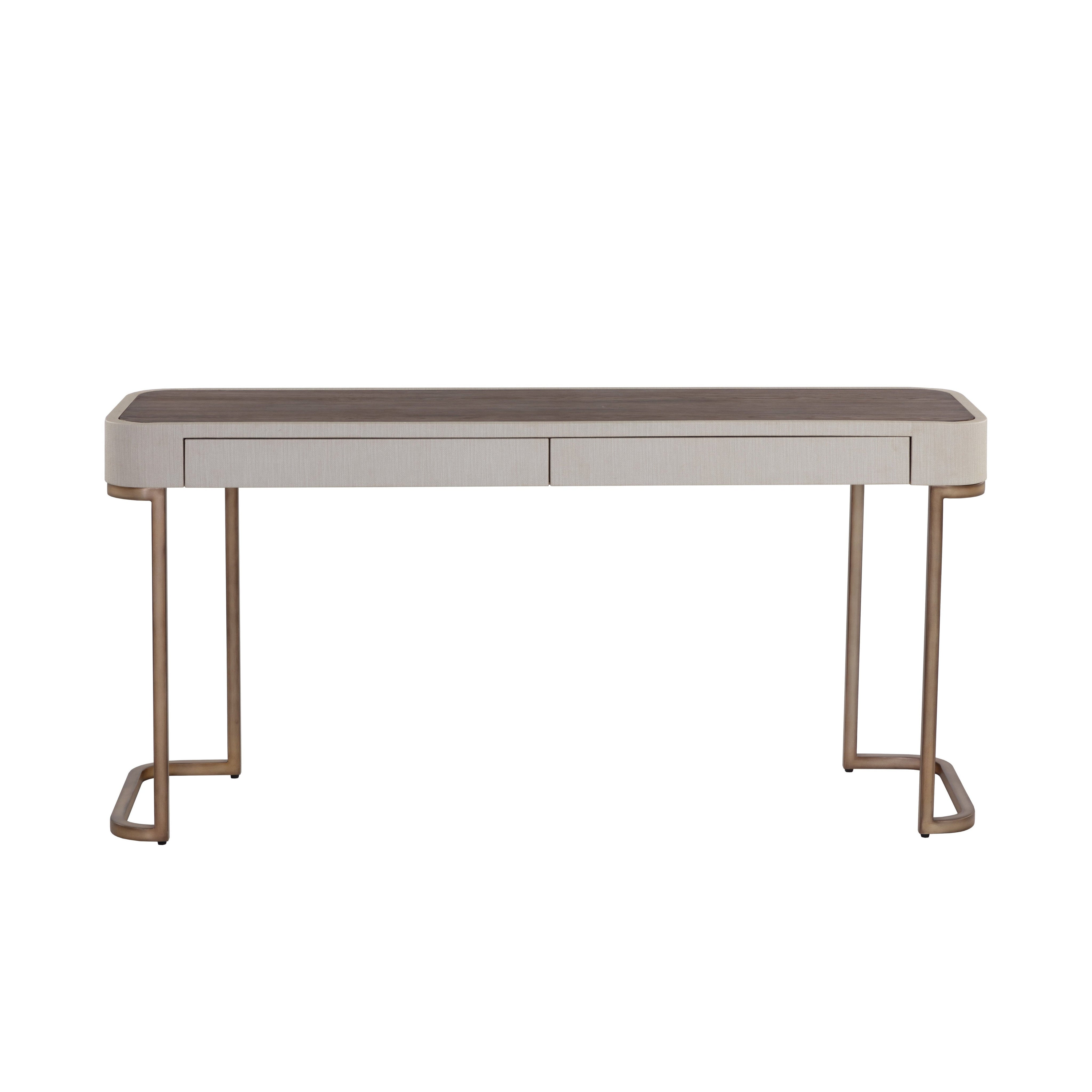 This contemporary console table is defined by its beautiful and gentle curves. Wrapped in cream faux leather with a brown oak veneer tabletop that is sure to impress.