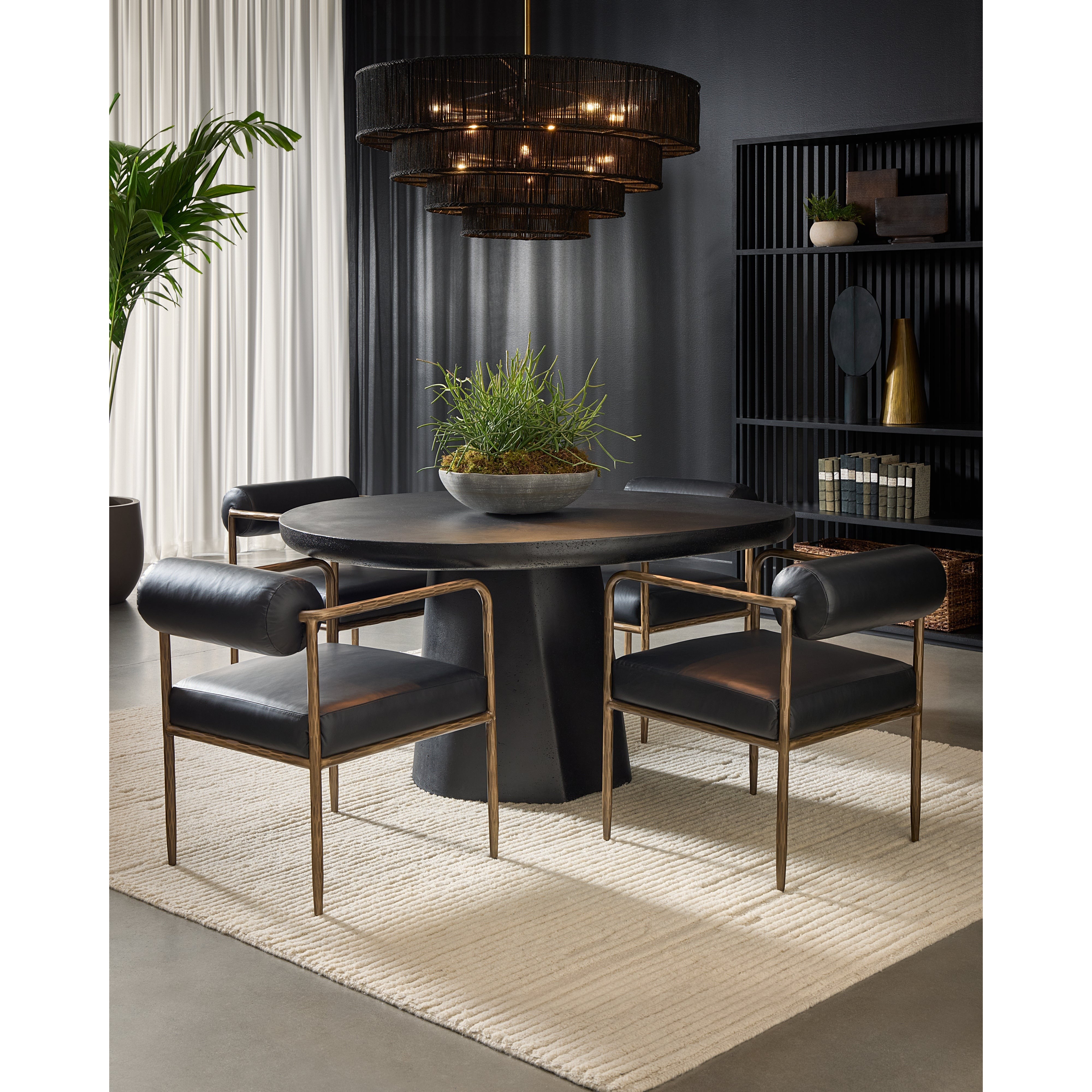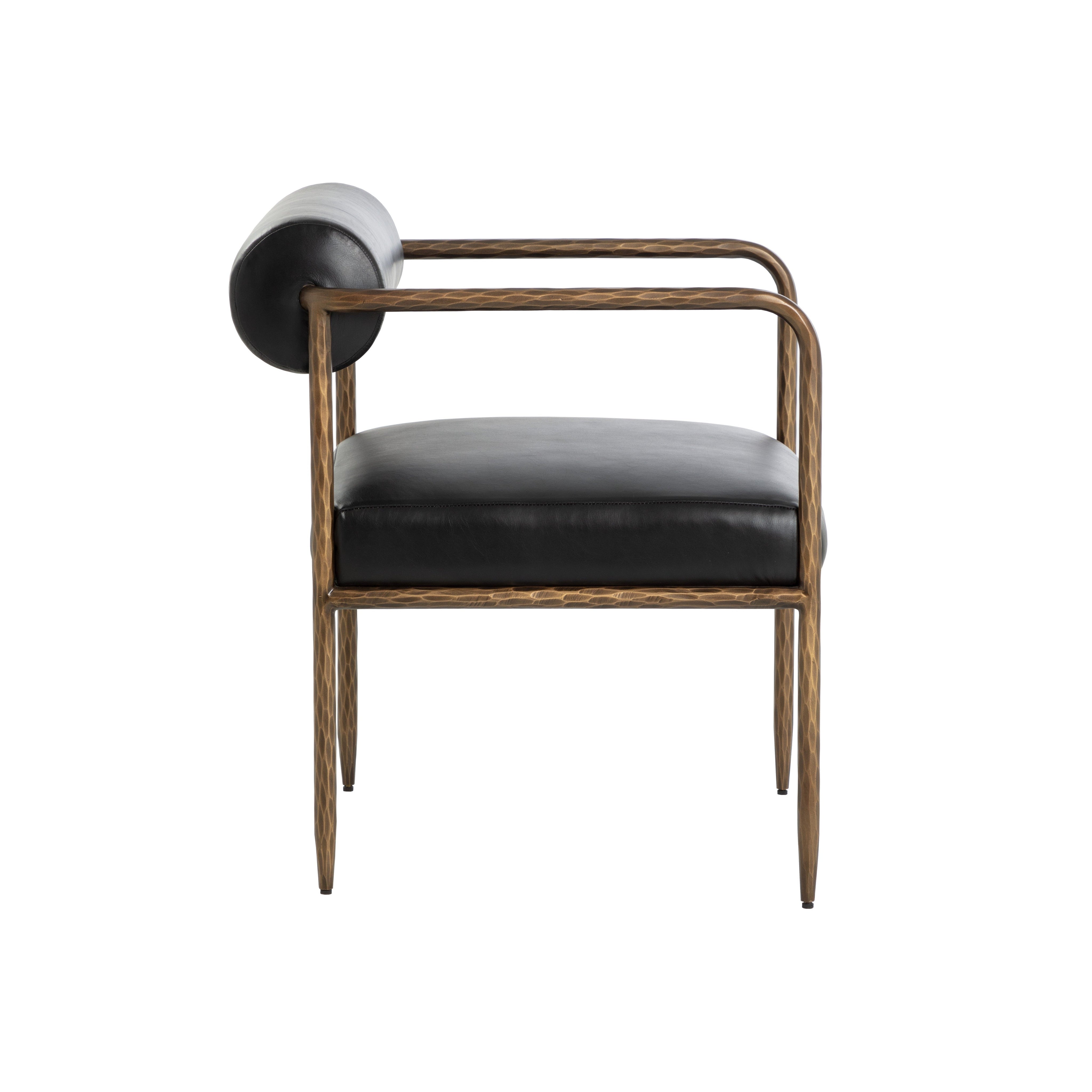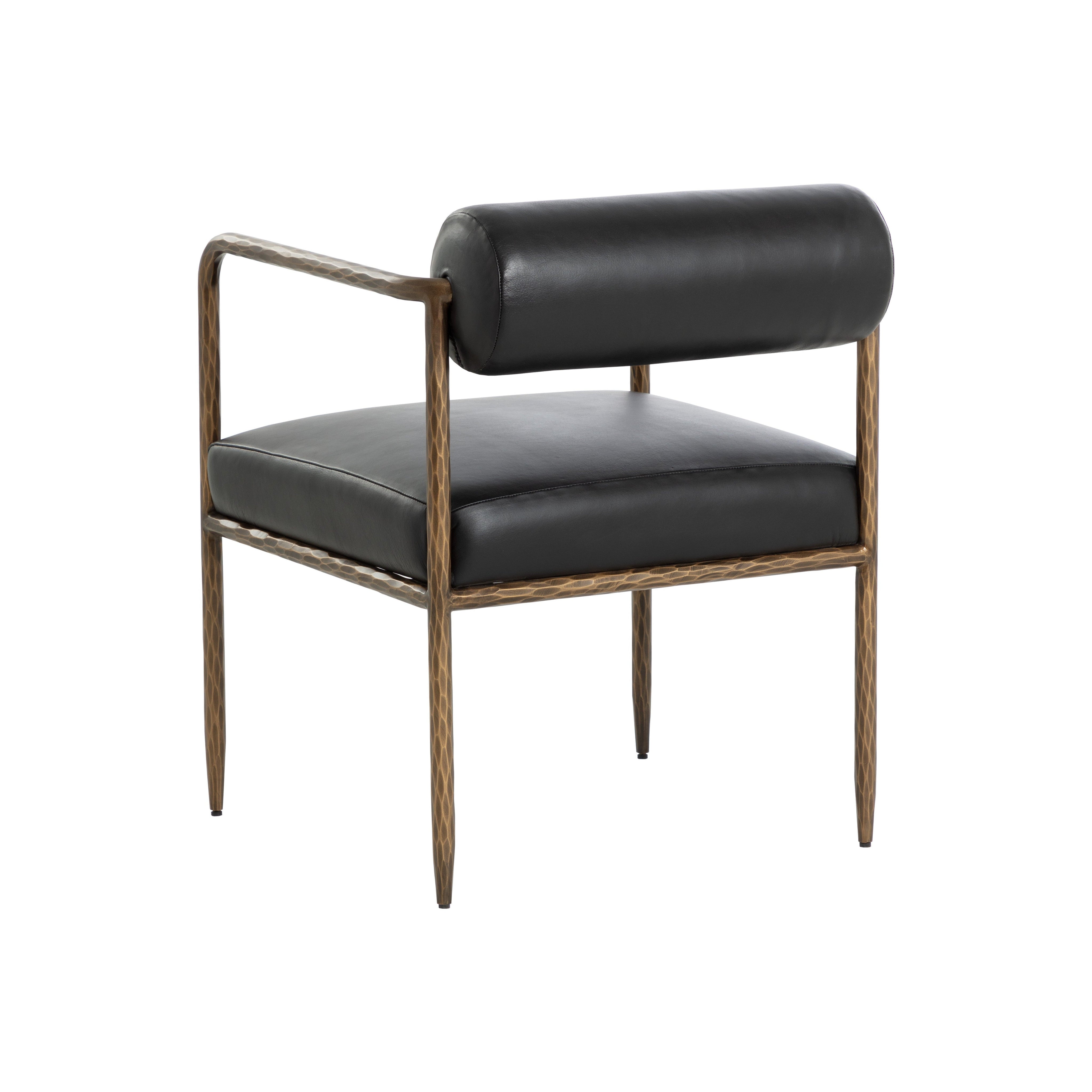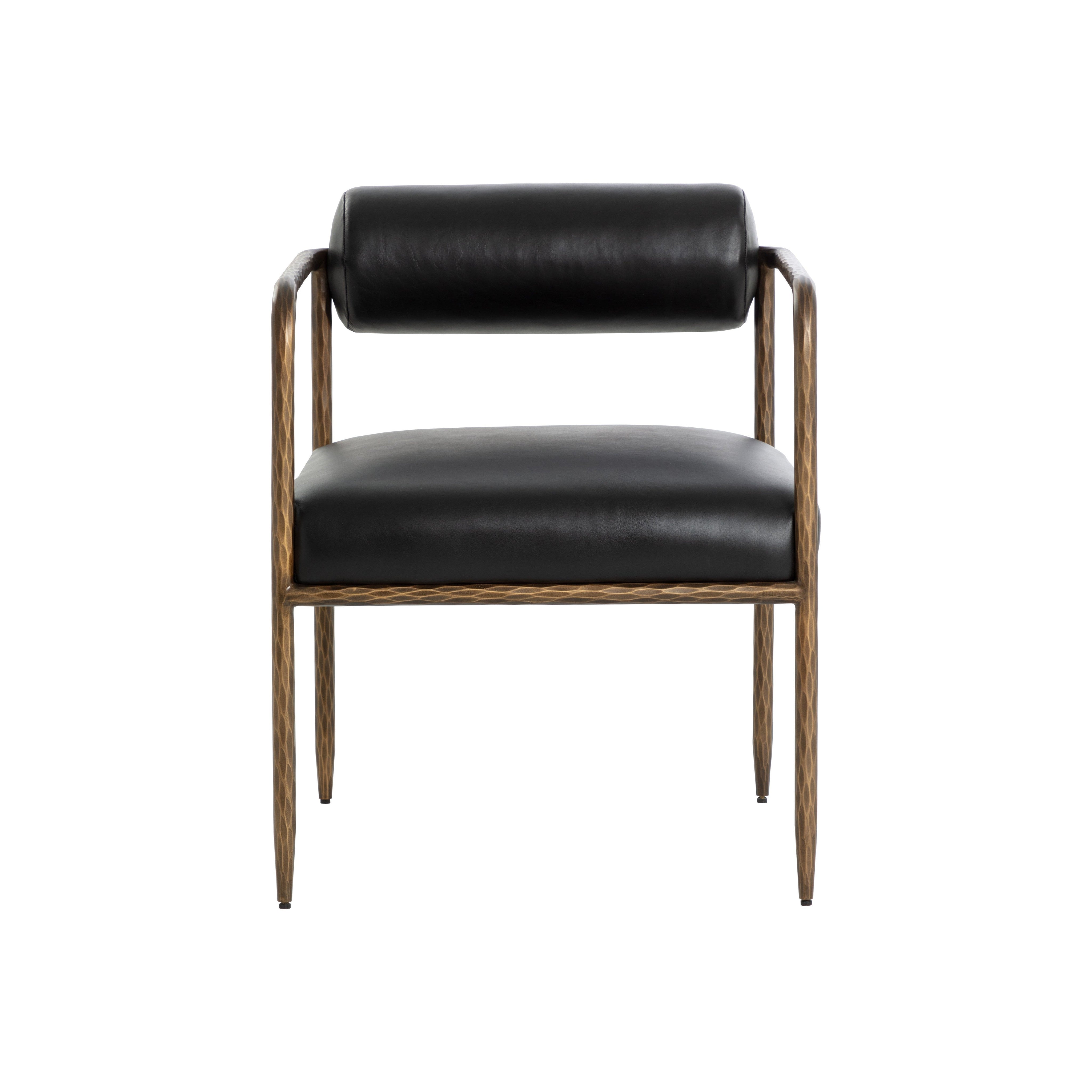 The simple frame of the Ajani Dining Armchair lets the finer details do the talking. Crafted from iron with a hand-hammered finish, this piece showcases a distinctly textured look. Charcoal black leather and a bolster back add the perfect touch of comfort, making it a great dining room addition.