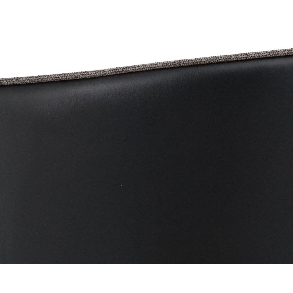 A modern barrel back dining armchair upholstered in our soft sparrow grey fabric and contrasting napa black faux leather. Finished with black steel legs and brushed gold foot caps. Handle With Care: This design has been crafted with faux leather. Faux leather is manufactured to reflect the natural characteristics of leather; as such, colour variations, markings wrinkles, grooves, and light scratches are appreciated characteristics. No two pieces will be alike. Visit our Product Care page for more information on how to ensure the lasting beauty of this piece.