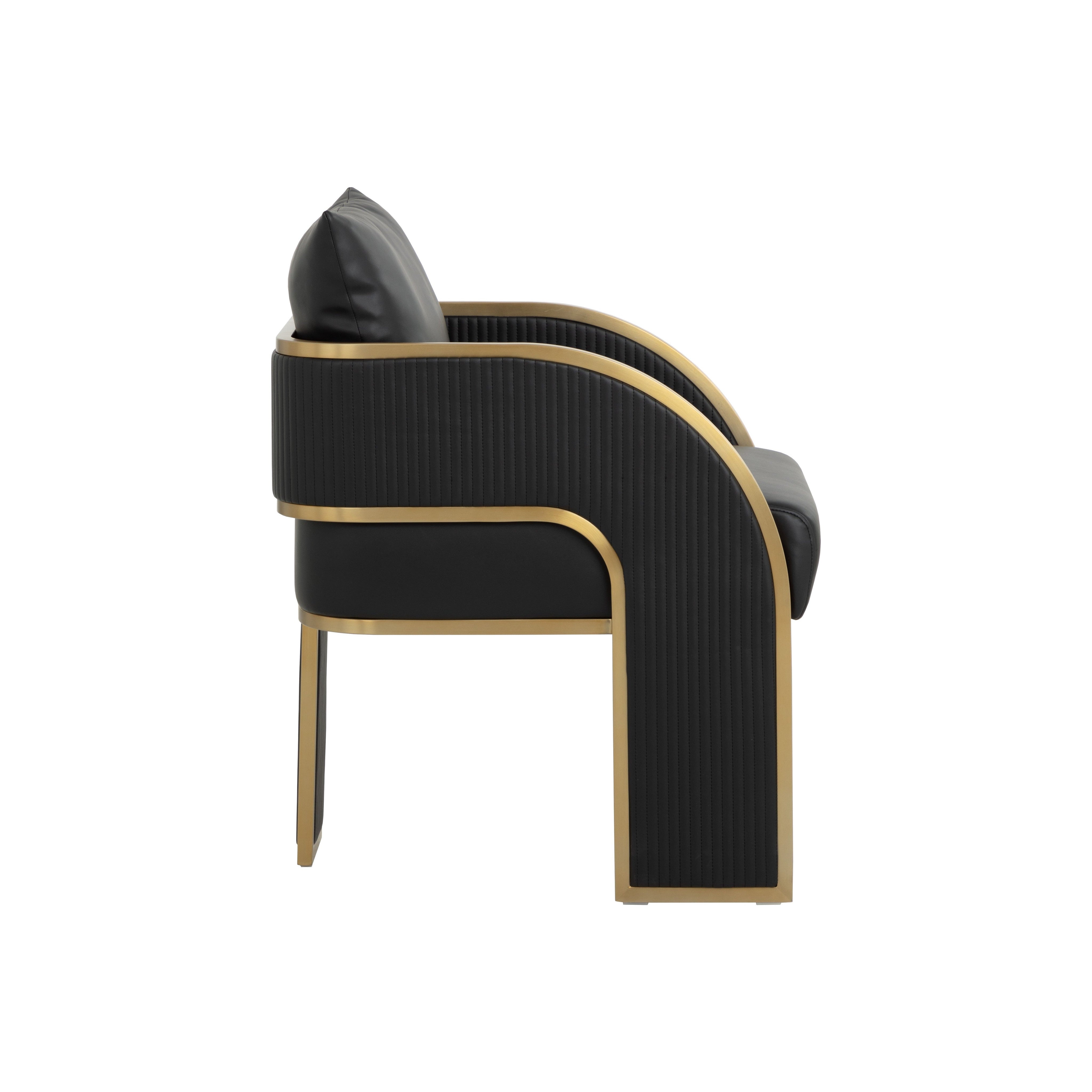 Bold and stylish, the Baz Dining Armchair is sure to turn heads. Featuring a daring silhouette upholstered in napa black faux leather. Gold stainless steel detailing and channel stitching add depth and visual impact to the overall look of the piece.