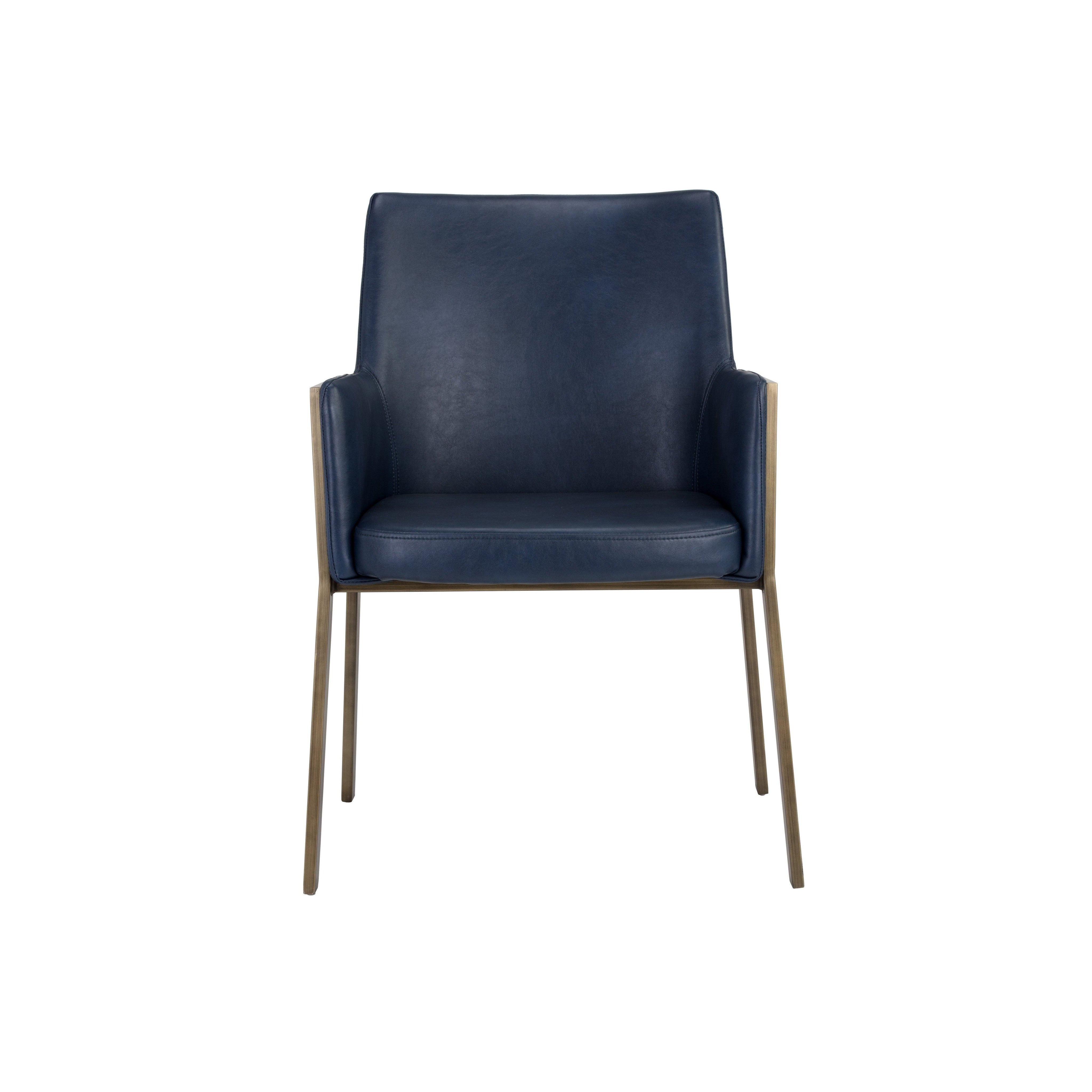 The Bernadette Dining Armchair features a shapely design with an exposed brushed antique brass frame. Upholstered in bravo admiral faux leather for added style and durability. Handle With Care: This design has been crafted with faux leather. Faux leather is manufactured to reflect the natural characteristics of leather; as such, colour variations, markings wrinkles, grooves, and light scratches are appreciated characteristics. No two pieces will be alike. Visit our Product Care page for more information on how to ensure the lasting beauty of this piece.
