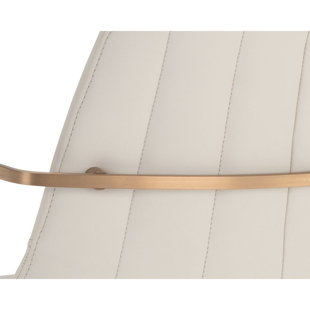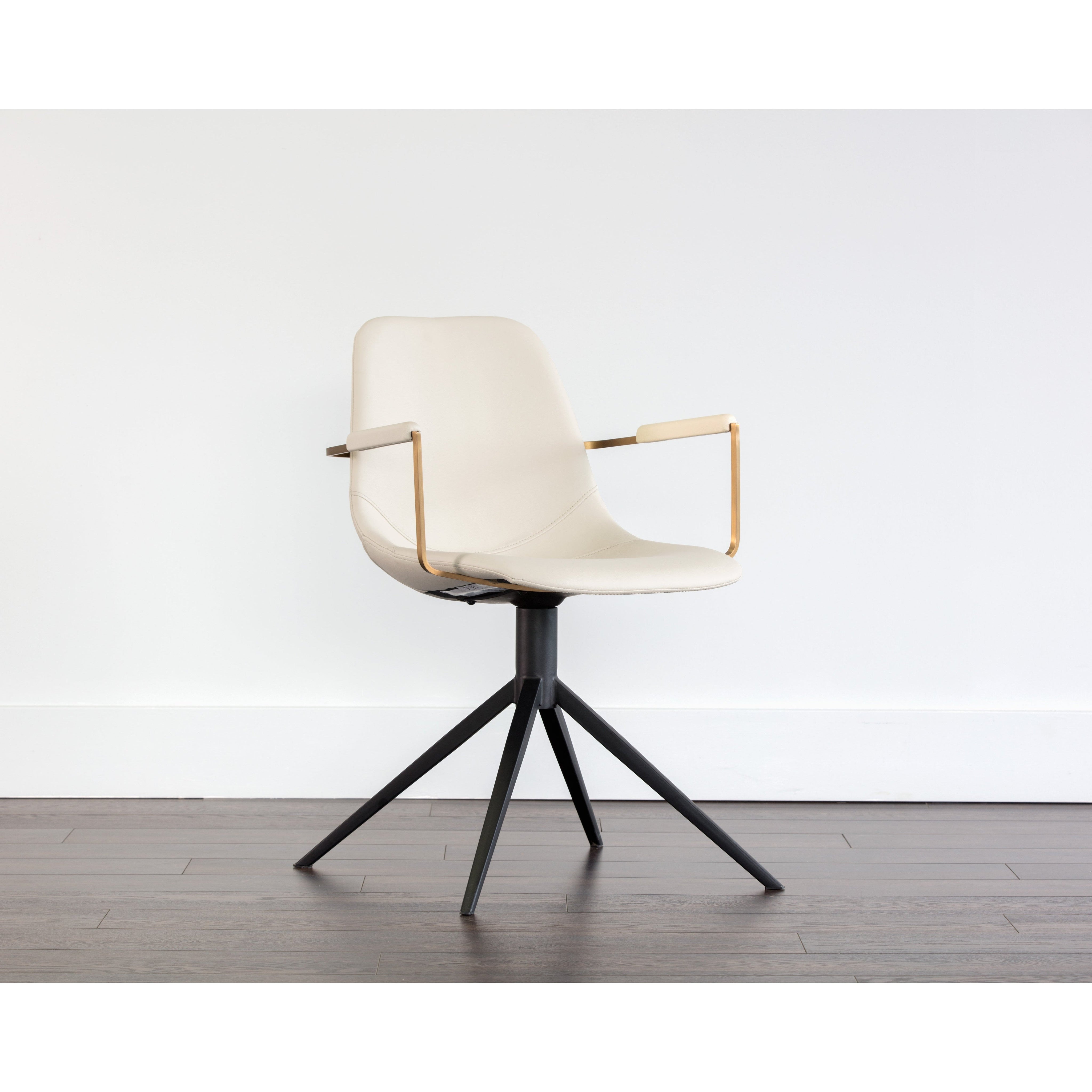 This swivel dining chair is where urban cool meets contemporary elegance. Stocked in dillon cream faux leather. Brushed gold finished arms and black iron legs complete this look. Handle With Care: This design has been crafted with faux leather. Faux leather is manufactured to reflect the natural characteristics of leather; as such, colour variations, markings wrinkles, grooves, and light scratches are appreciated characteristics. No two pieces will be alike. Visit our Product Care page for more information on how to ensure the lasting beauty of this piece.