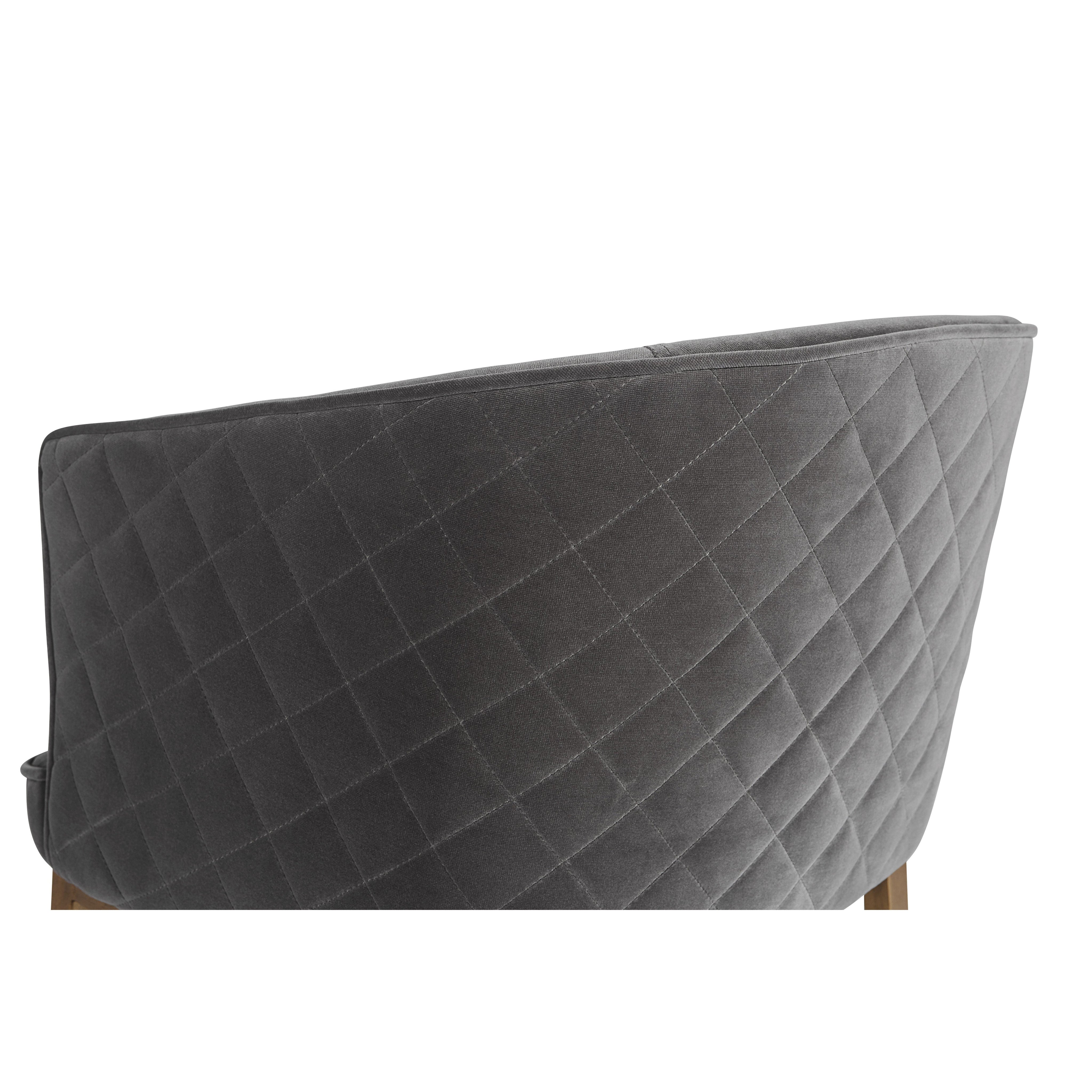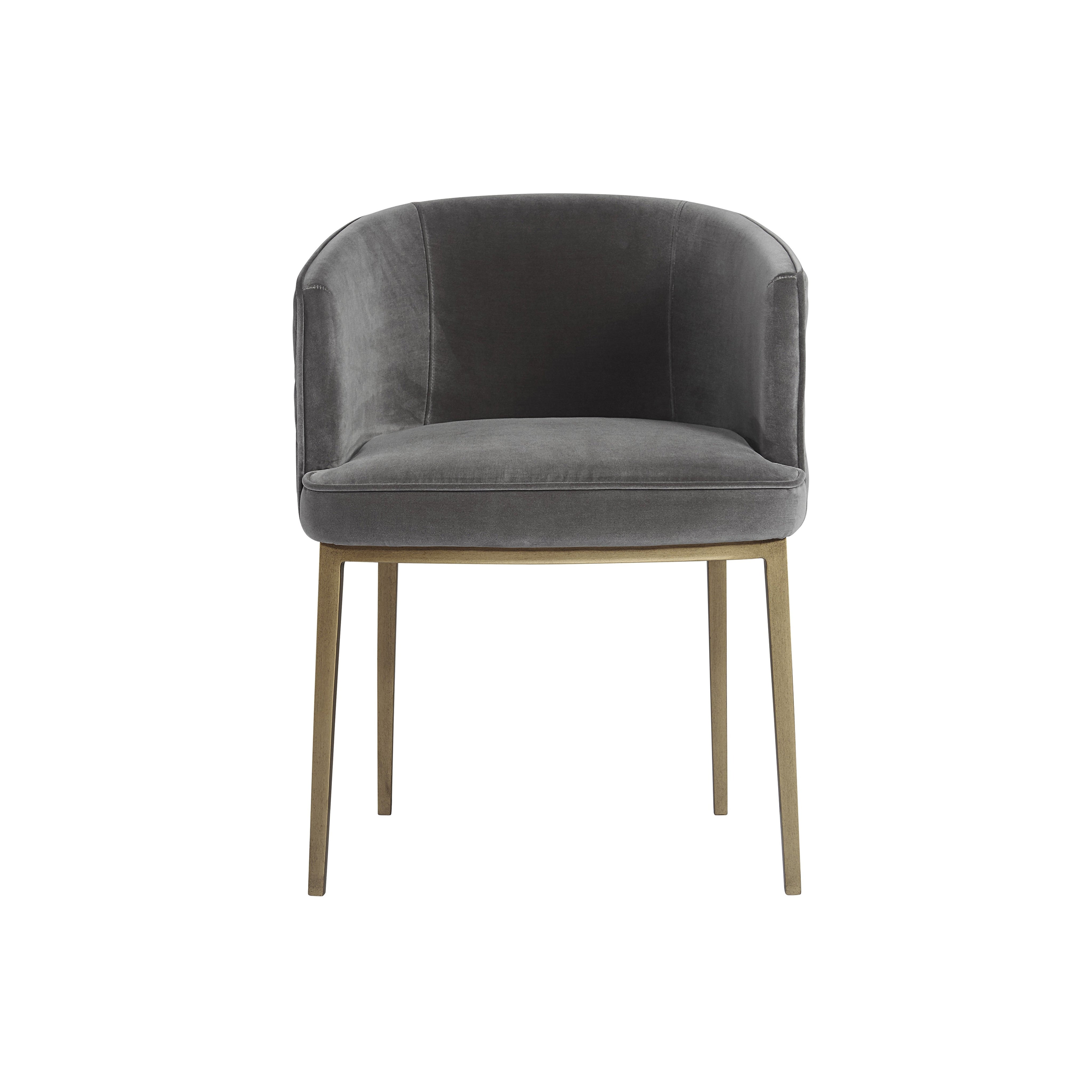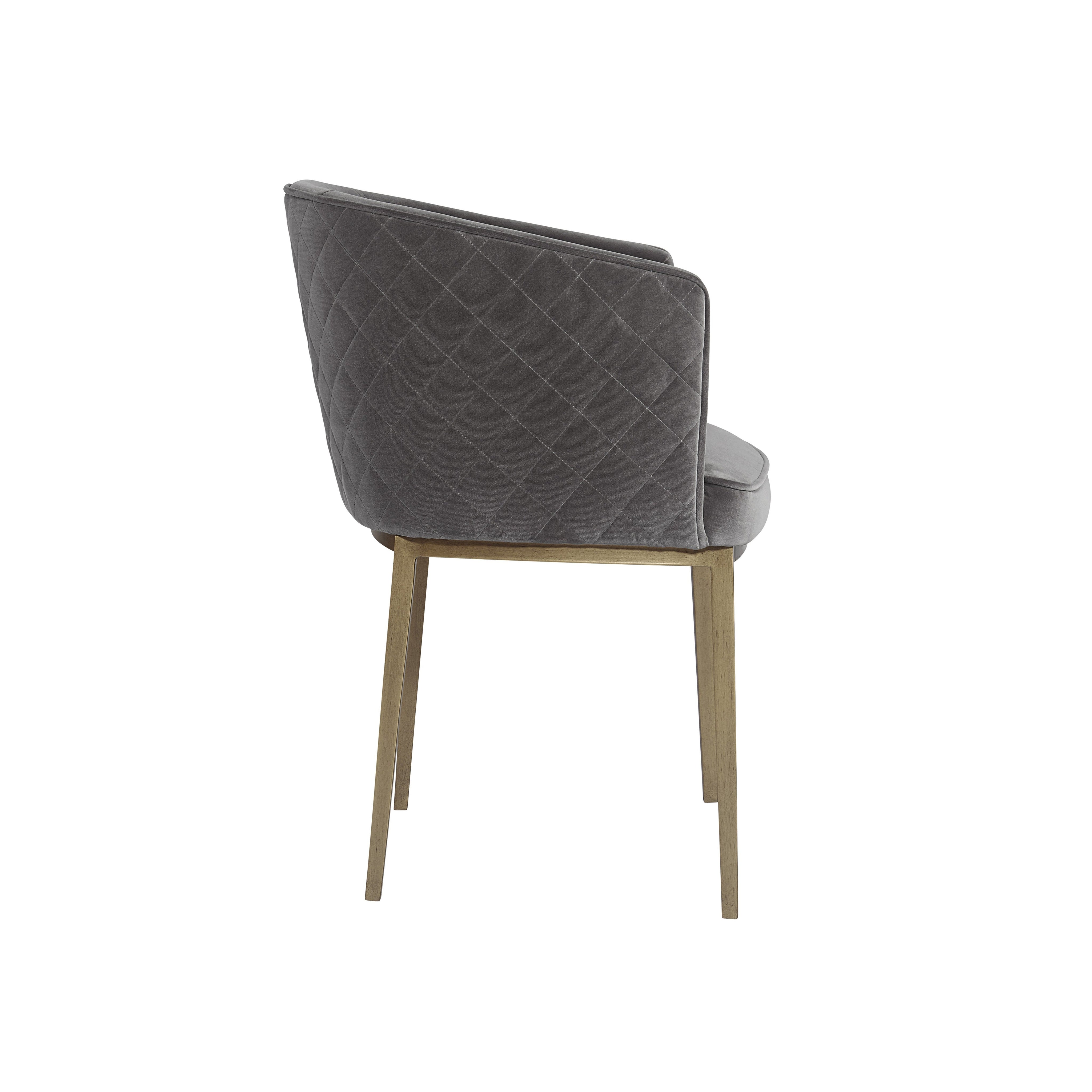 Feminine flair comes to life in this modern dining chair. Stocked in our blush grey fabric with elegant diamond stitching on the exterior seatback. An antique brass steel frame completes the look.