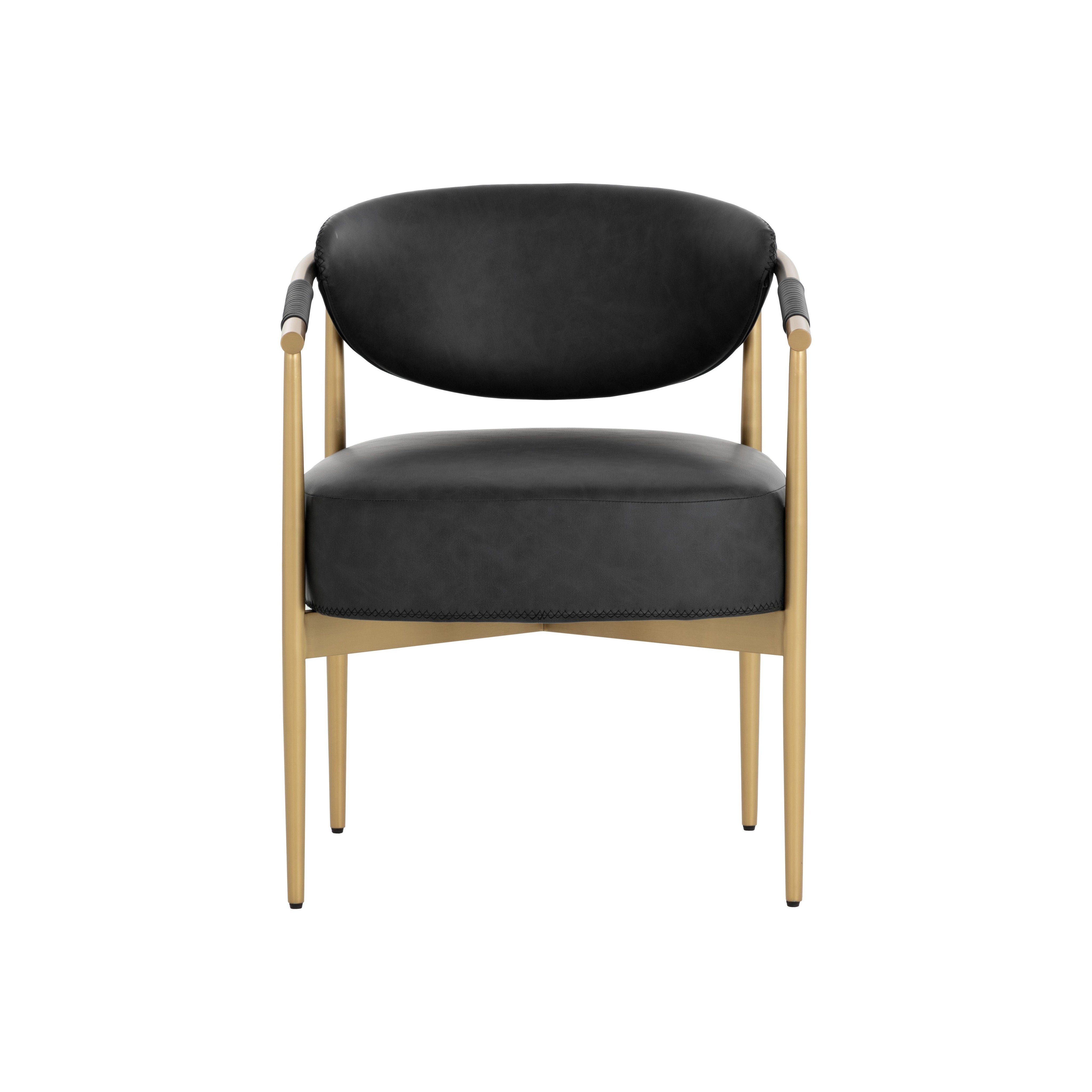 Every detail that makes up the handsome Heloise Dining Armchair is designed with purpose. Bravo black faux leather upholstery and rope detailing is paired with powder-coated gold stainless steel for optimal style and comfort. Visible stitching on the seat and backrest accentuates the chair's smooth contours. This elegant dining chair will perfectly complement any dining space. Handle With Care: This design has been crafted with faux leather. Faux leather is manufactured to reflect the natural characteristics of leather; as such, colour variations, markings, wrinkles, grooves, and light scratches are appreciated characteristics. No two pieces will be alike. Visit our Product Care page for more information on how to ensure the lasting beauty of this piece.