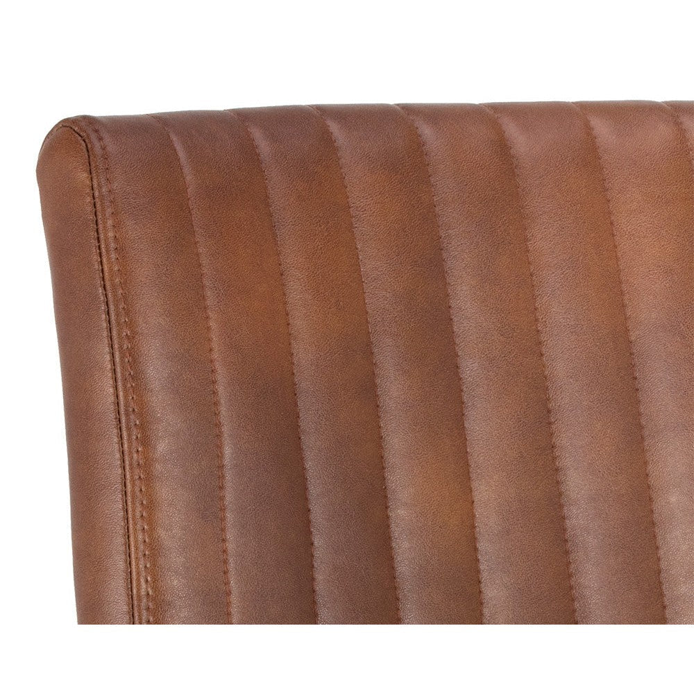 This compact dining armchair from the Ikon collection will bring a sophisticated industrial style to any space. Features bold channel stitching on the seat and seatback and finished with a brushed antique brass frame. Available in bravo cognac faux leather. Handle With Care: This design has been crafted with faux leather. Faux leather is manufactured to reflect the natural characteristics of leather; as such, colour variations, markings, wrinkles, grooves, and light scratches are appreciated characteristics. No two pieces will be alike. Visit our Product Care page for more information on how to ensure the lasting beauty of this piece.