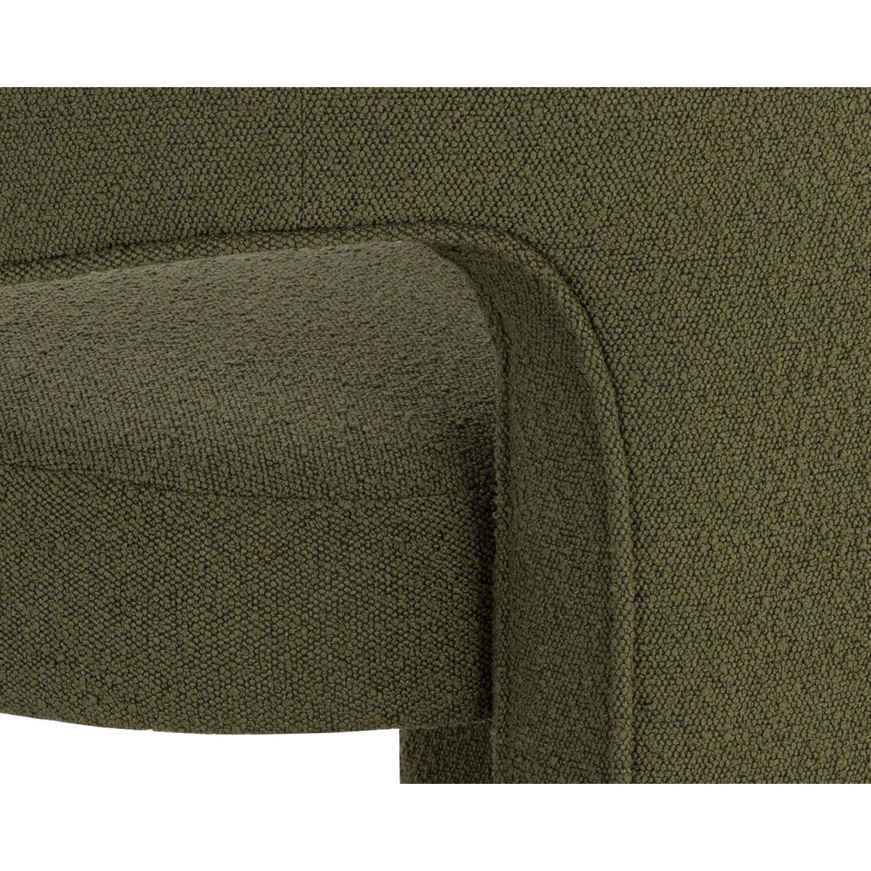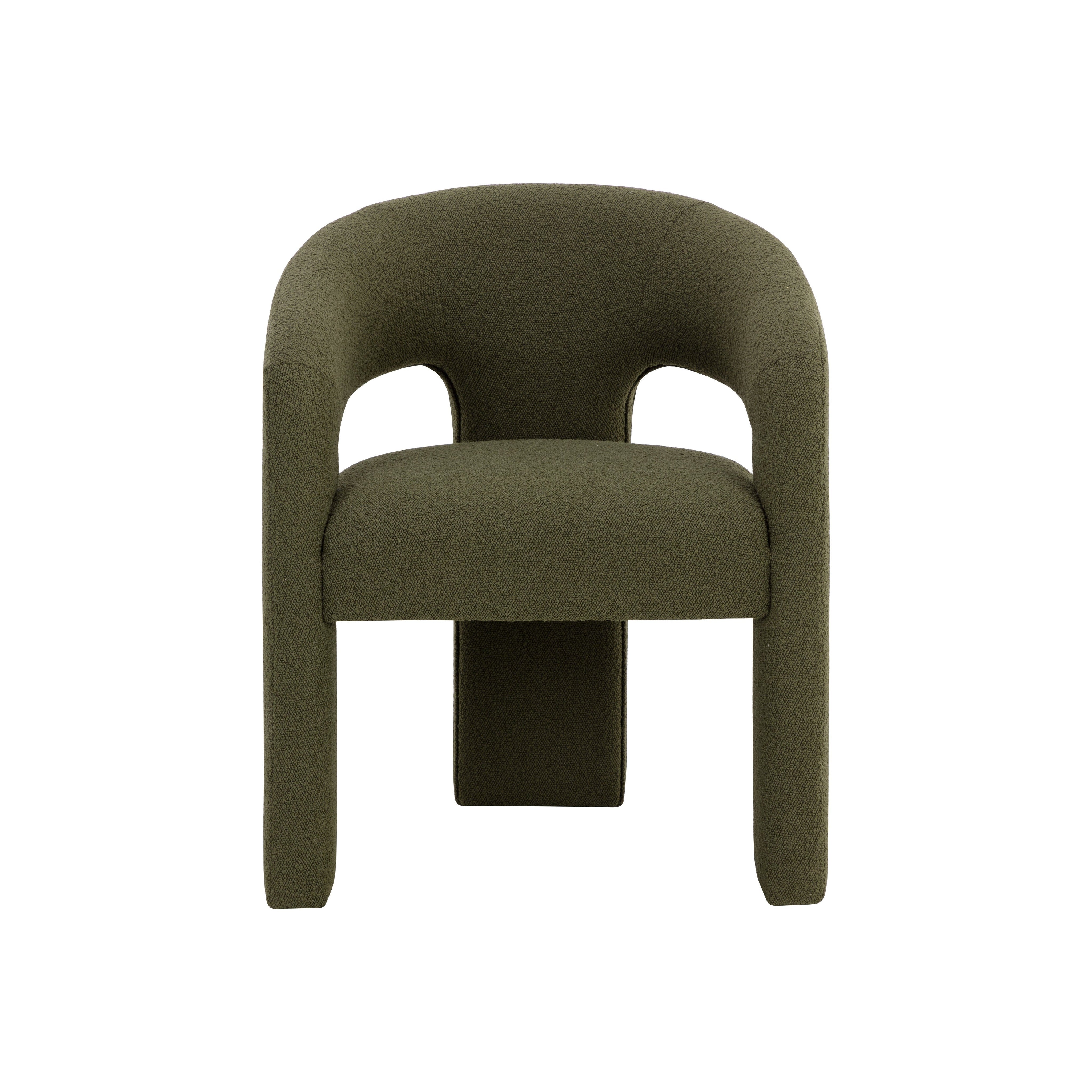 Clean lines and contoured arches add style and structure to this contemporary dining chair. Features a curved backrest and open back for optimal comfort. Eye-catching from all angles. Fully upholstered in copenhagen olive fabric.