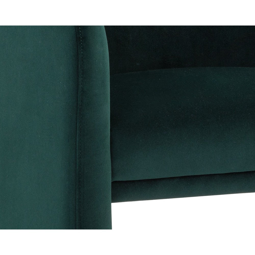 Make a bold statement with this spectacular dining armchair that will elevate any dining space. Stocked in meg dark emerald fabric and completed with a gold stainless steel base.