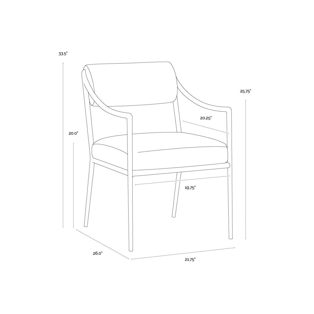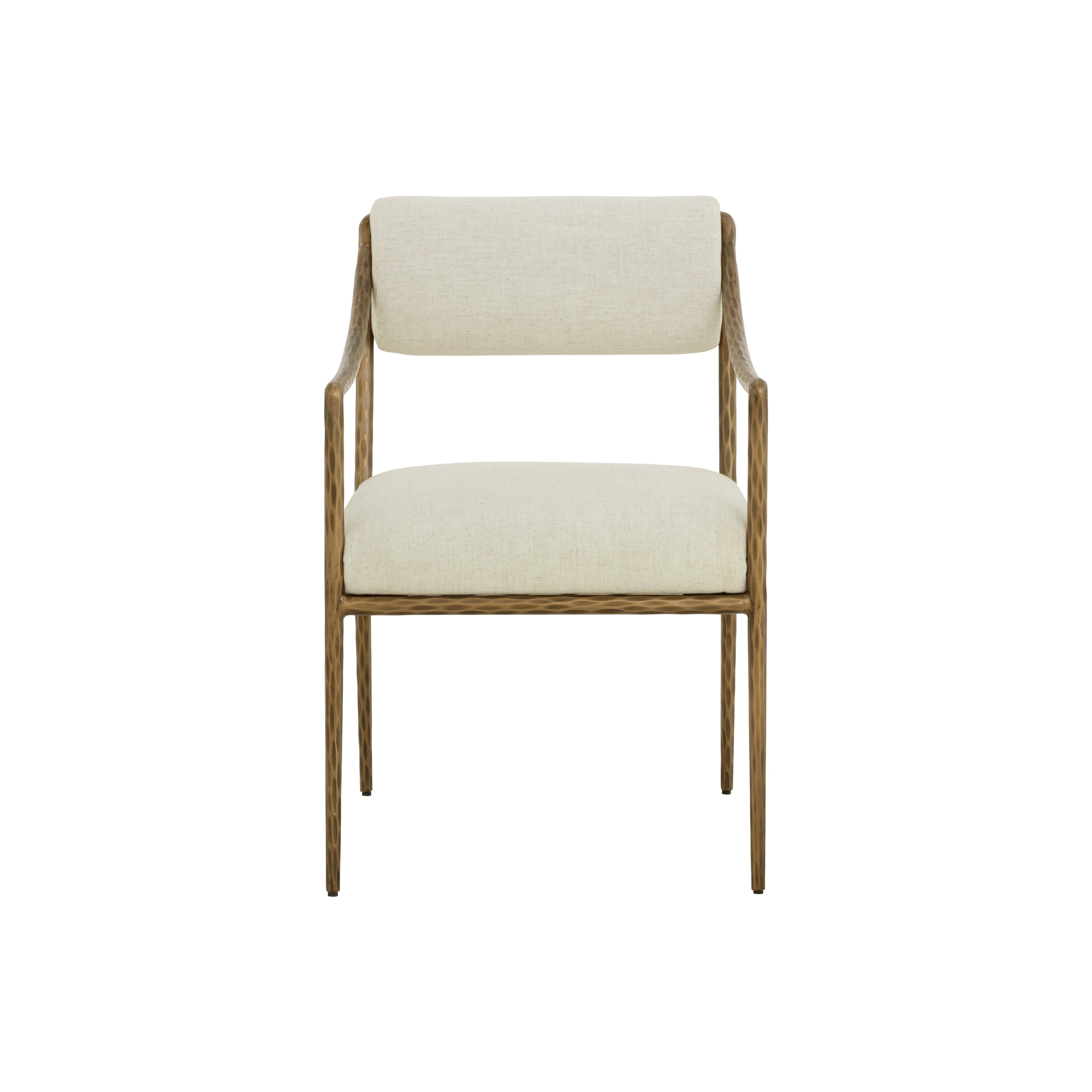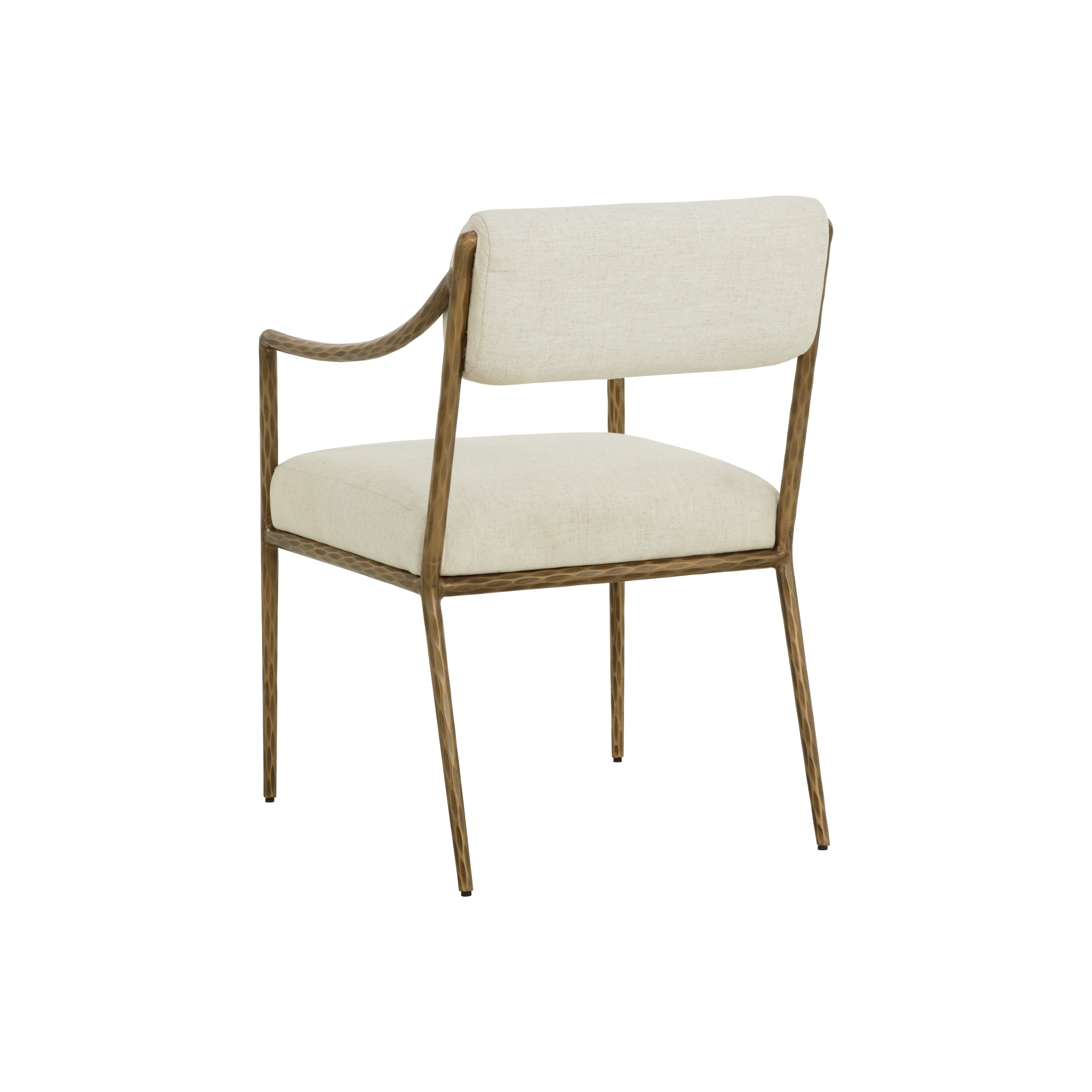 A timeless statement of expert craftsmanship, the Leticia Dining Armchair offers both beauty and resilience. Sloped arms invite ease, while hand-hammered detailing on the tapered metal frame lends an artisanal touch. Upholstered in geralt linen performance fabric, this versatile piece is equally at home at an elegant dinner party or styled as an accent chair.