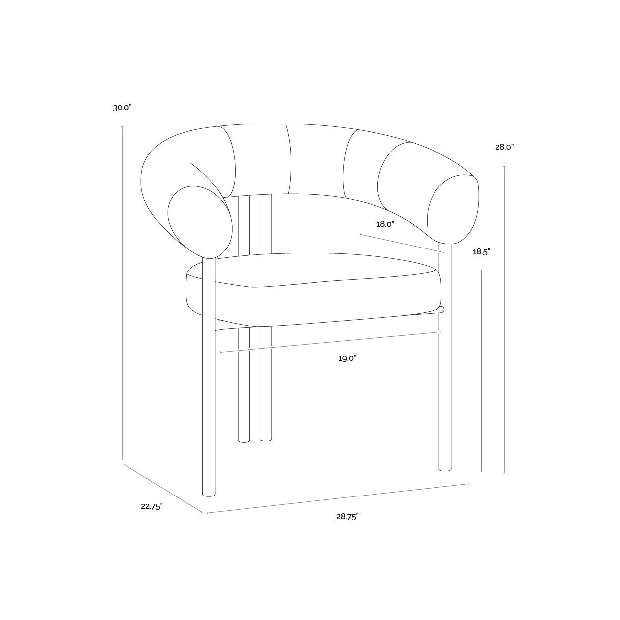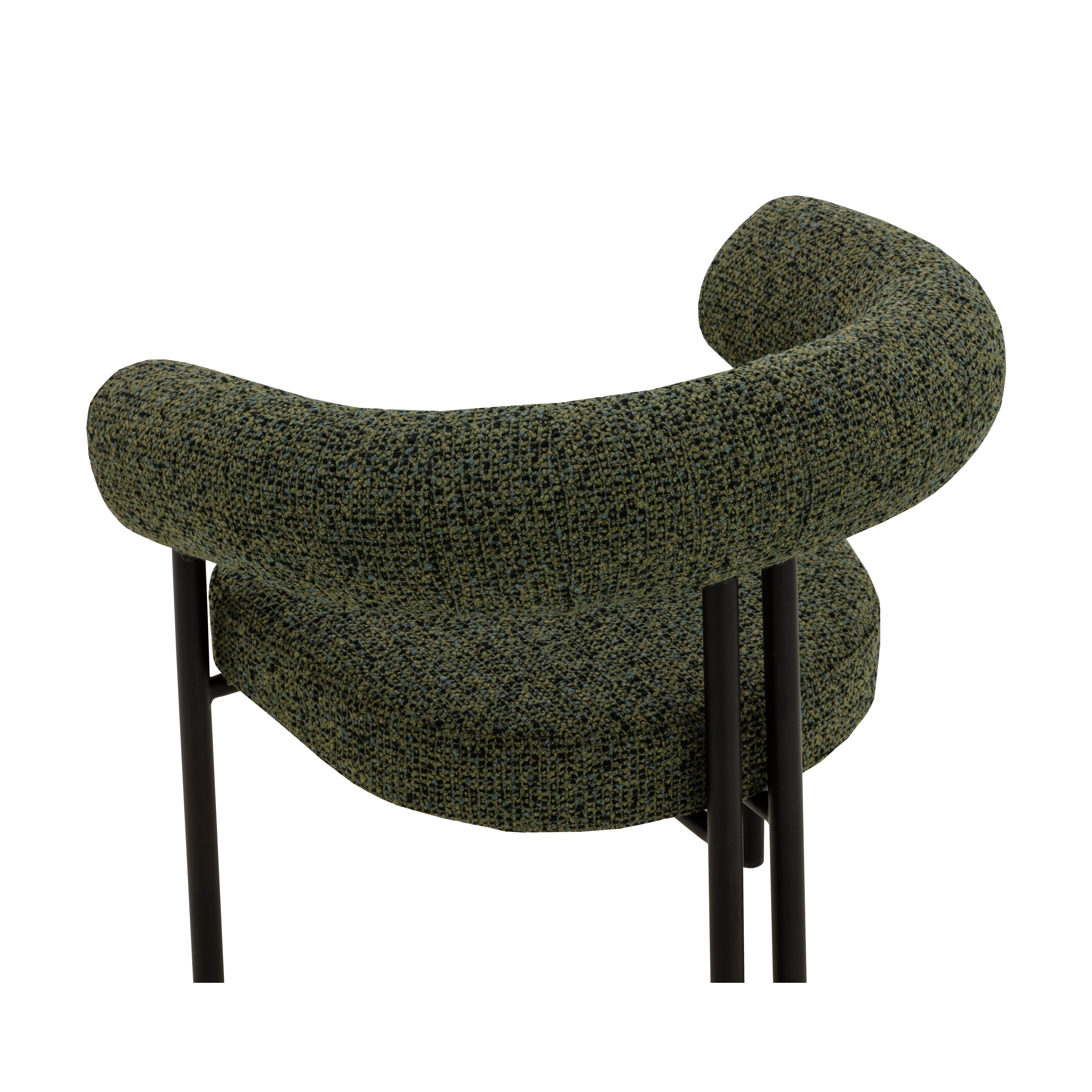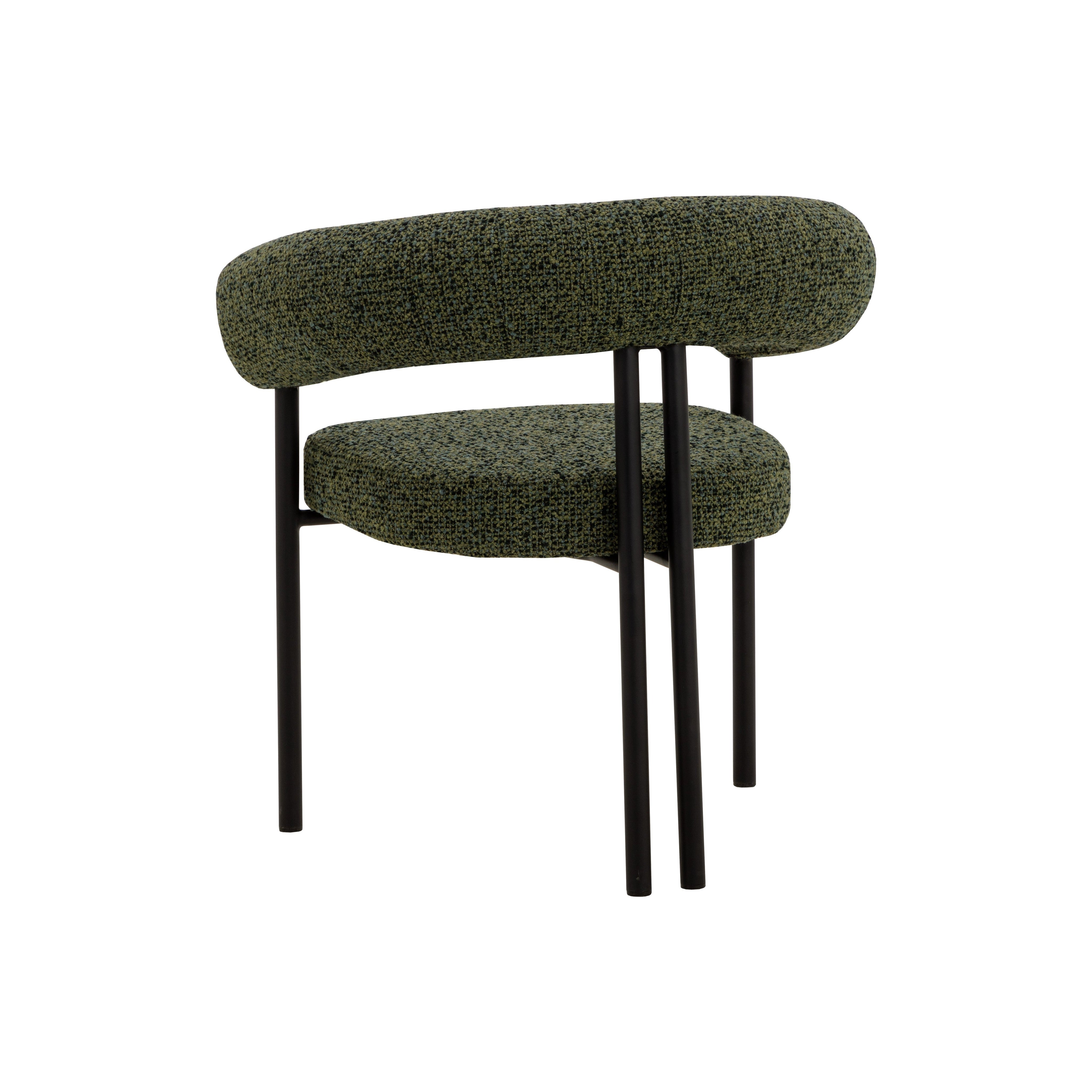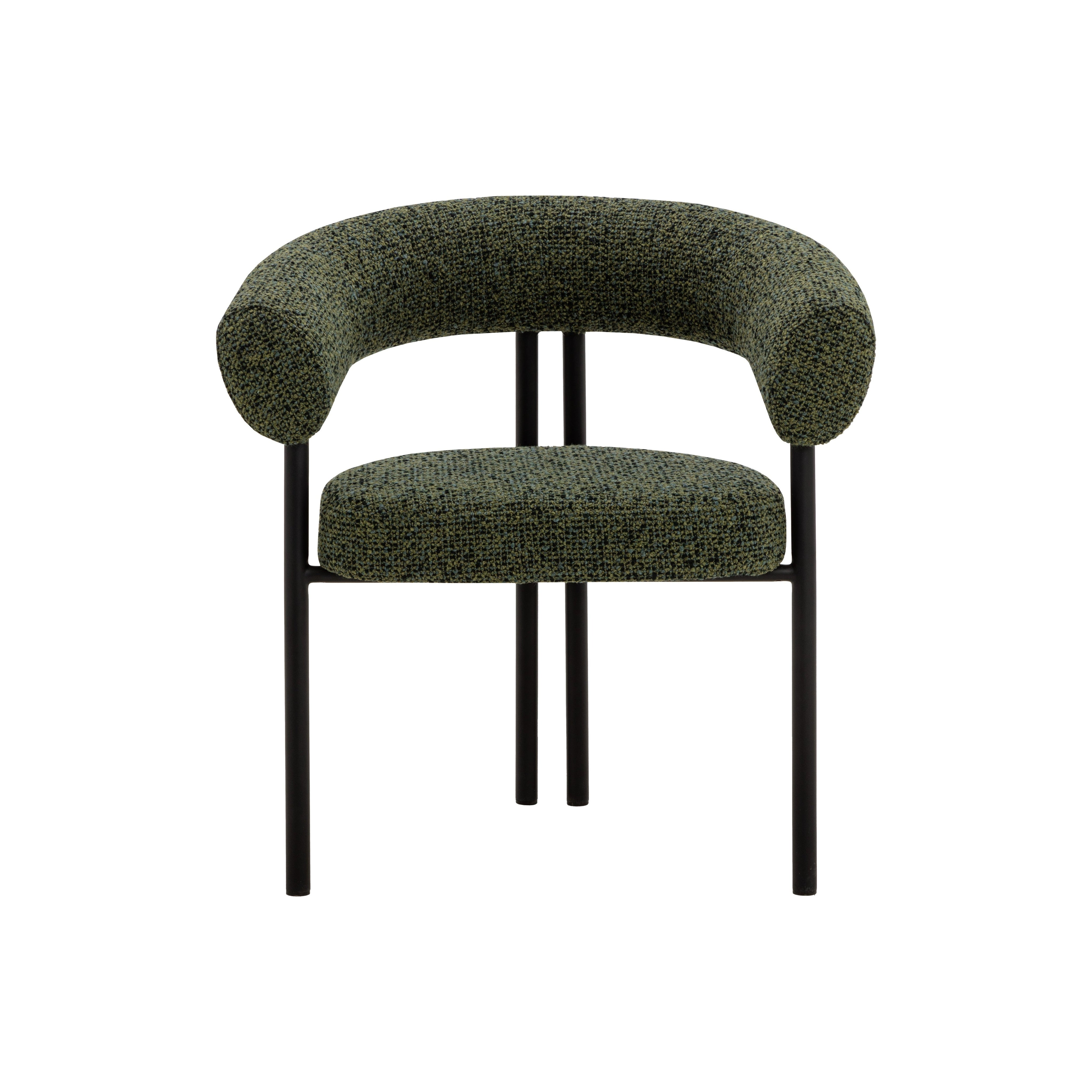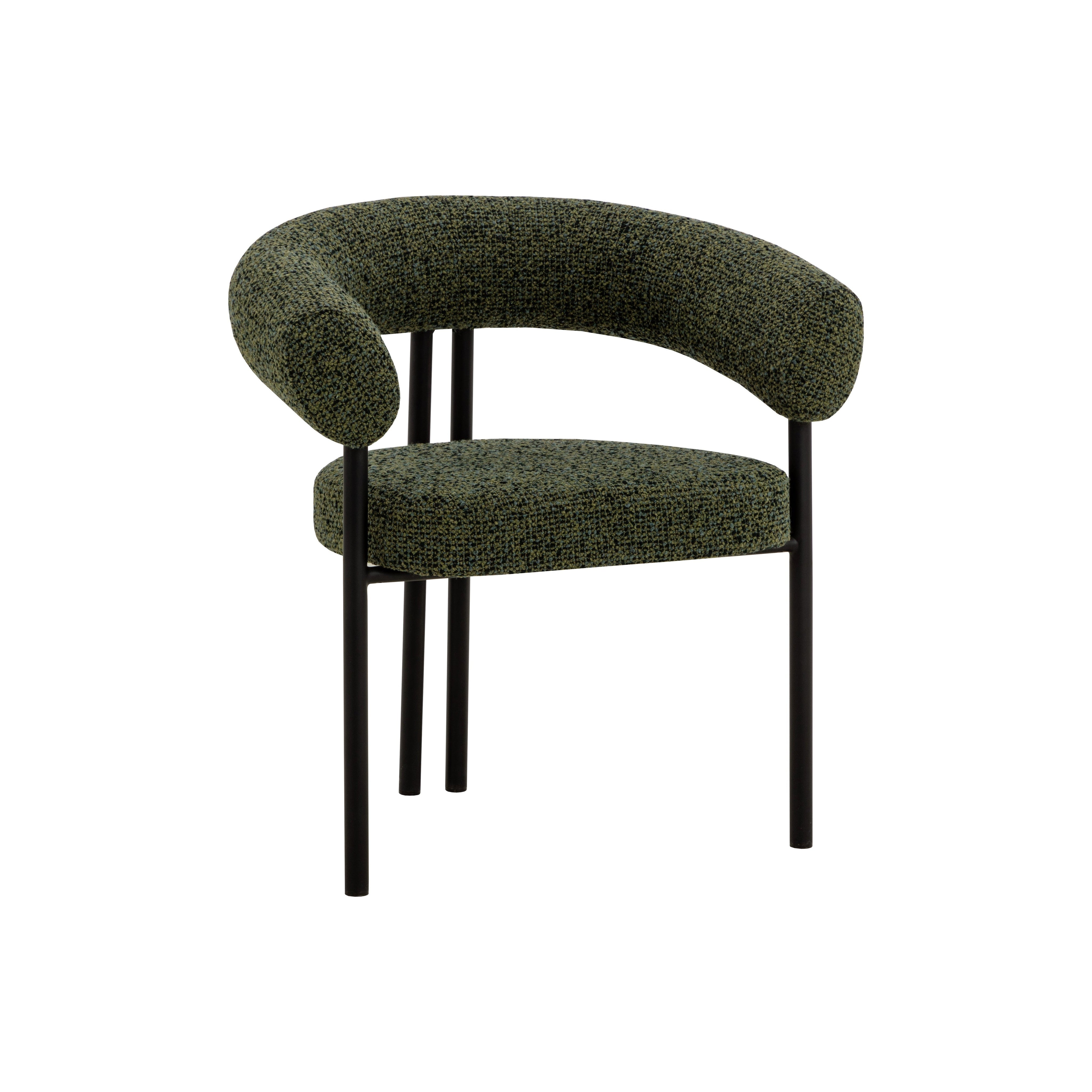 The Oniva Dining Armchair brings tactile personality with playful curves and richly textured fabric. A rounded seatback enhances comfort with plush contours that offer gentle support, while the black iron legs ground the piece with a sleek, modern presence.