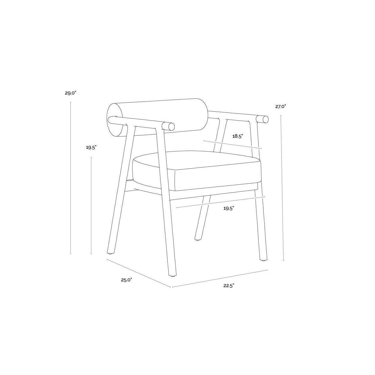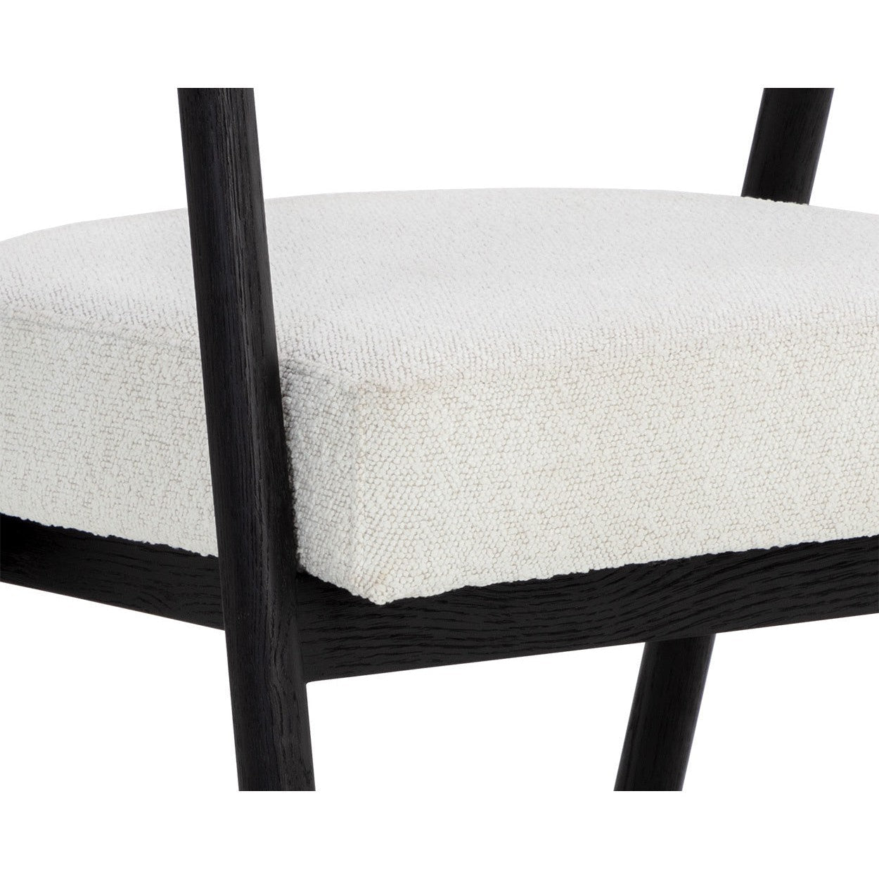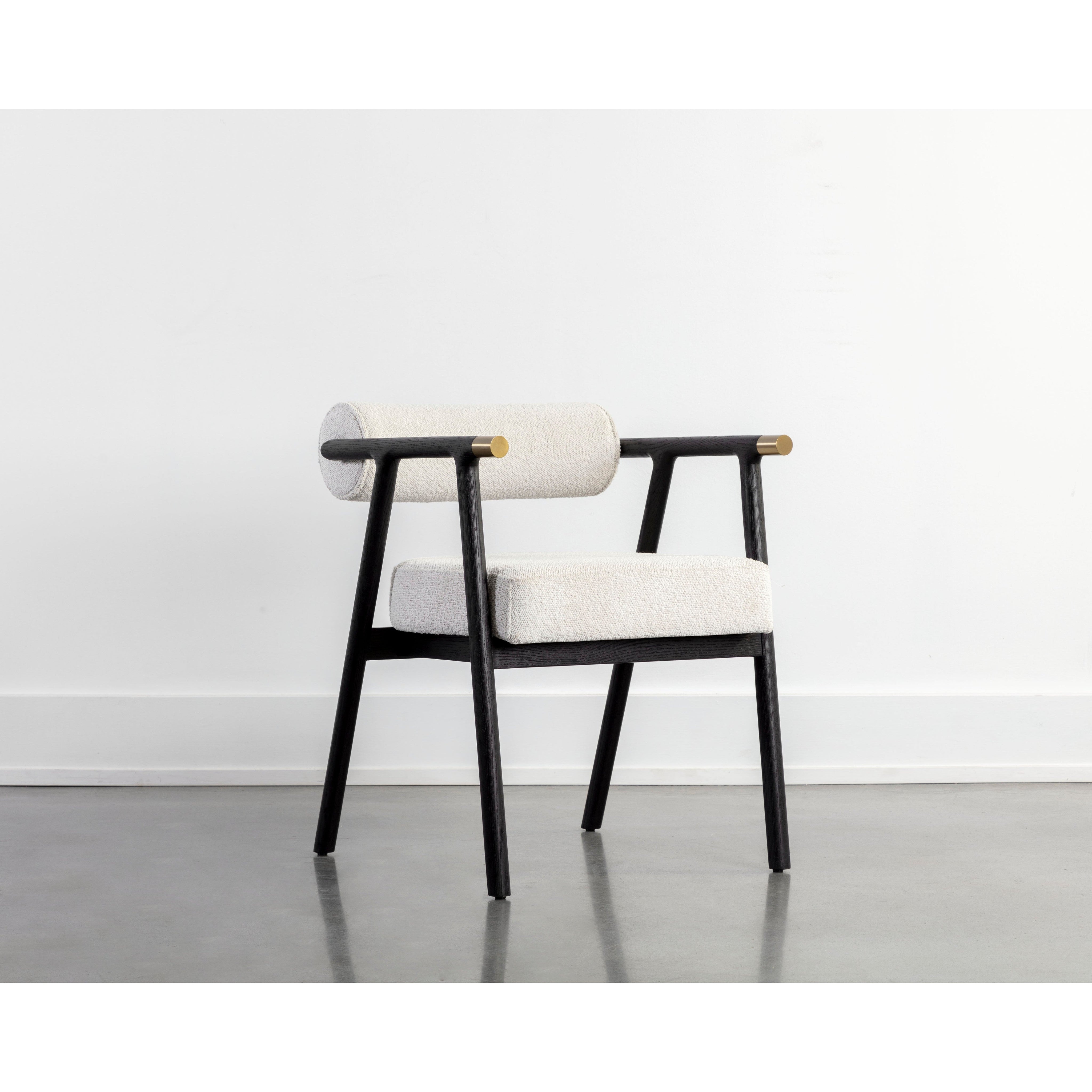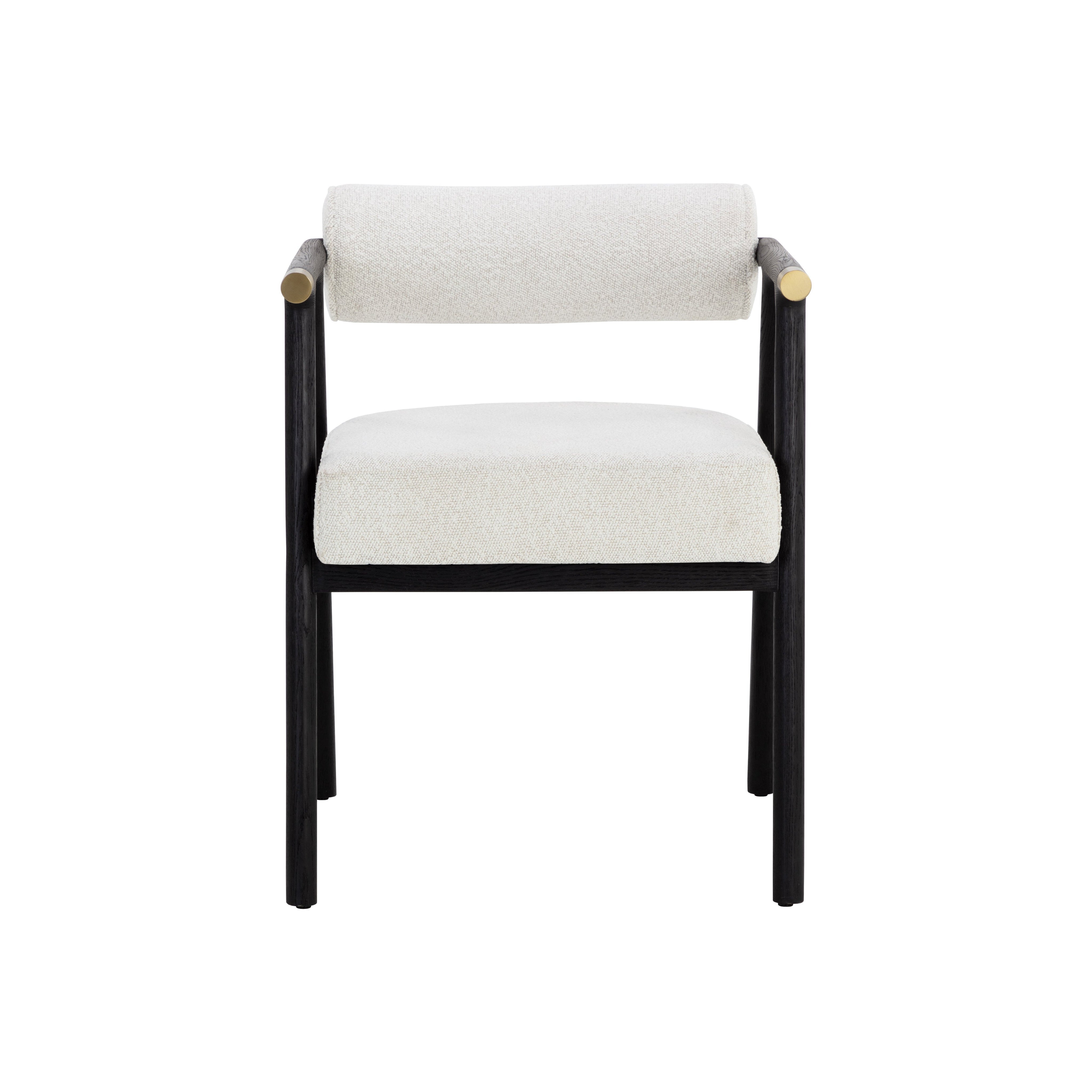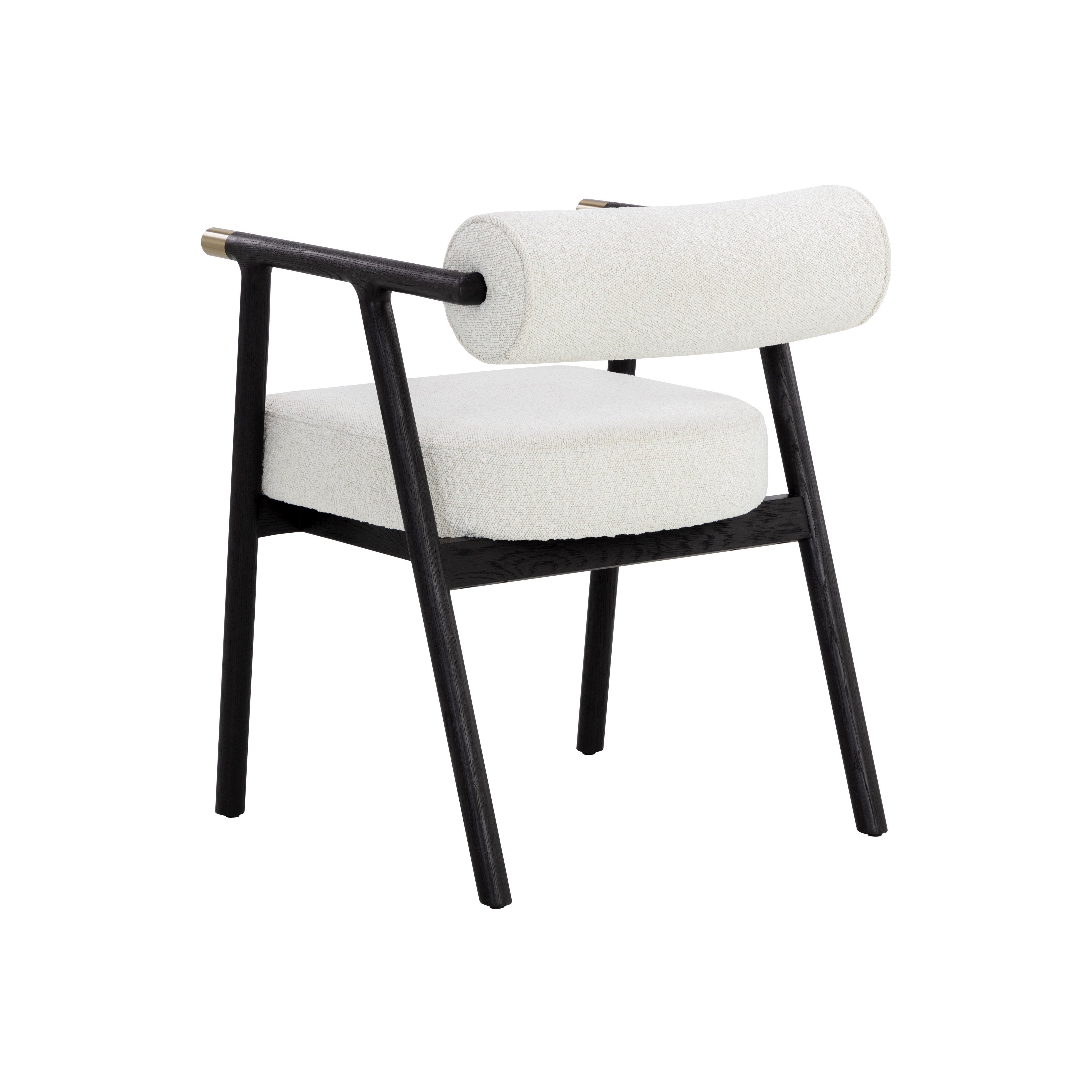 The attractive profile of the Sova Dining Armchair encapsulates modern sophistication. Black oak wood, copenhagen white boucle fabric and brushed brass metal caps create a timeless combination of refined materials.