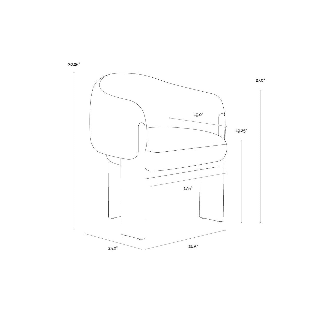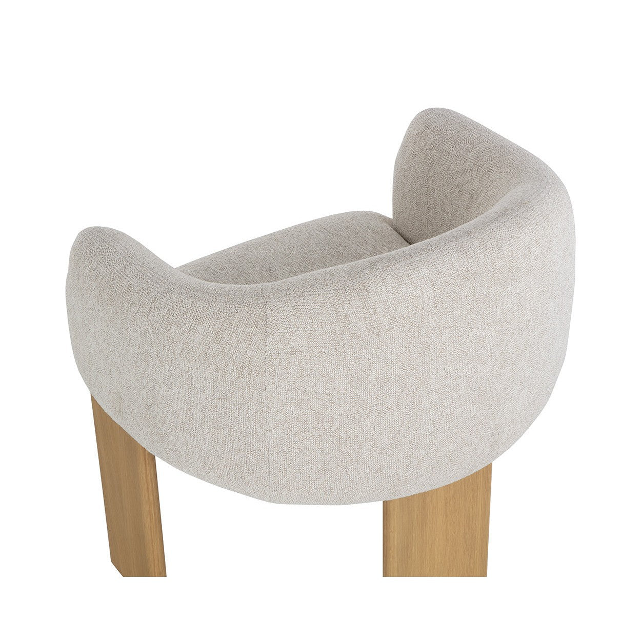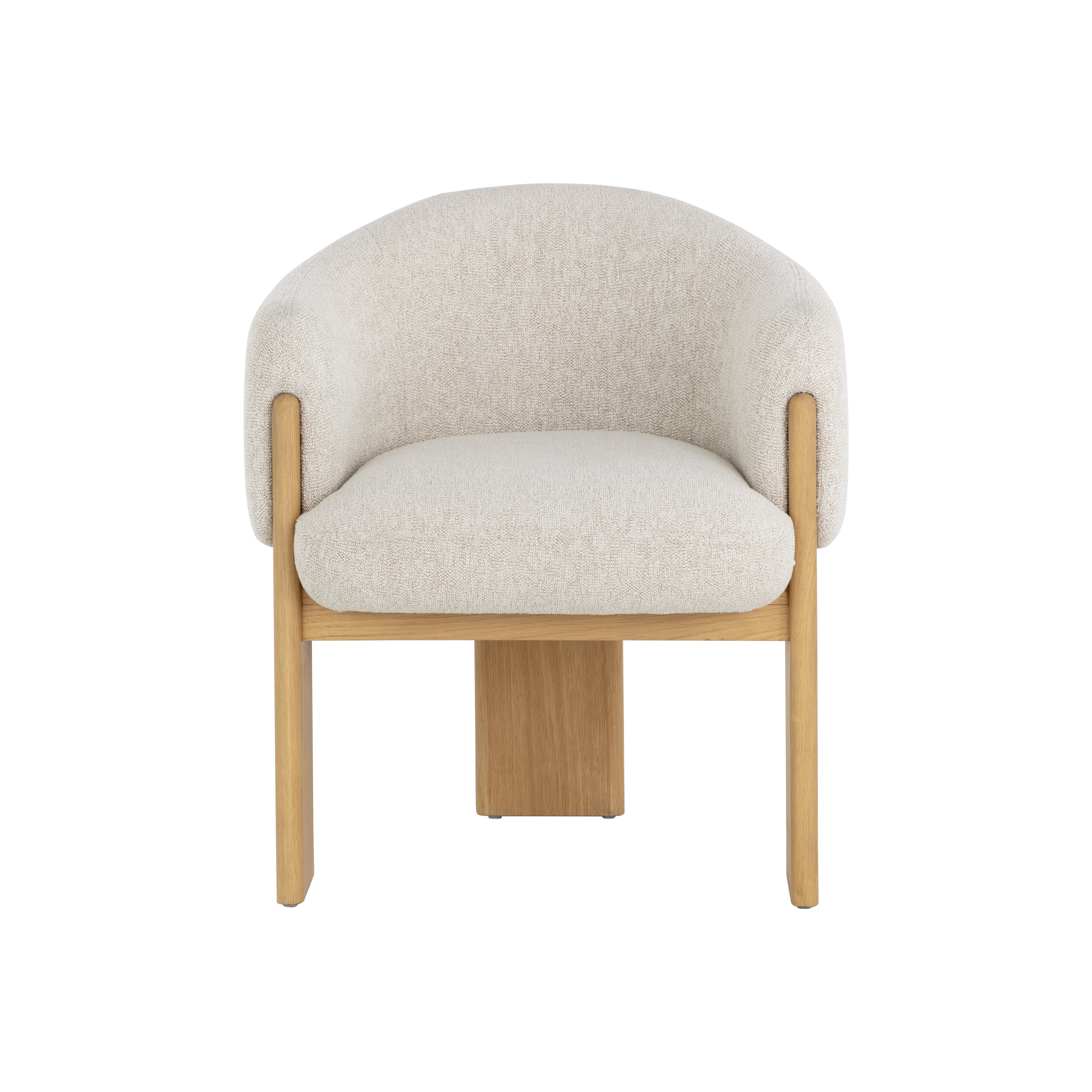 Embrace the luxurious comfort of the uniquely shaped Trine Dining Armchair. Generously padded and upholstered in our stylish dove cream fabric, this piece will complement any home aesthetic. Completed with a rustic oak wood base with a cerused finish on the legs.