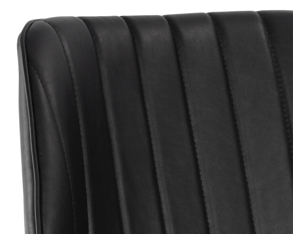 This industrial inspired dining chair is perfect for dining, lounge, office spaces and more. For a feminine touch, this design combines bravo black faux leather with channel tufting and bronze iron legs. Beautiful from all angles.