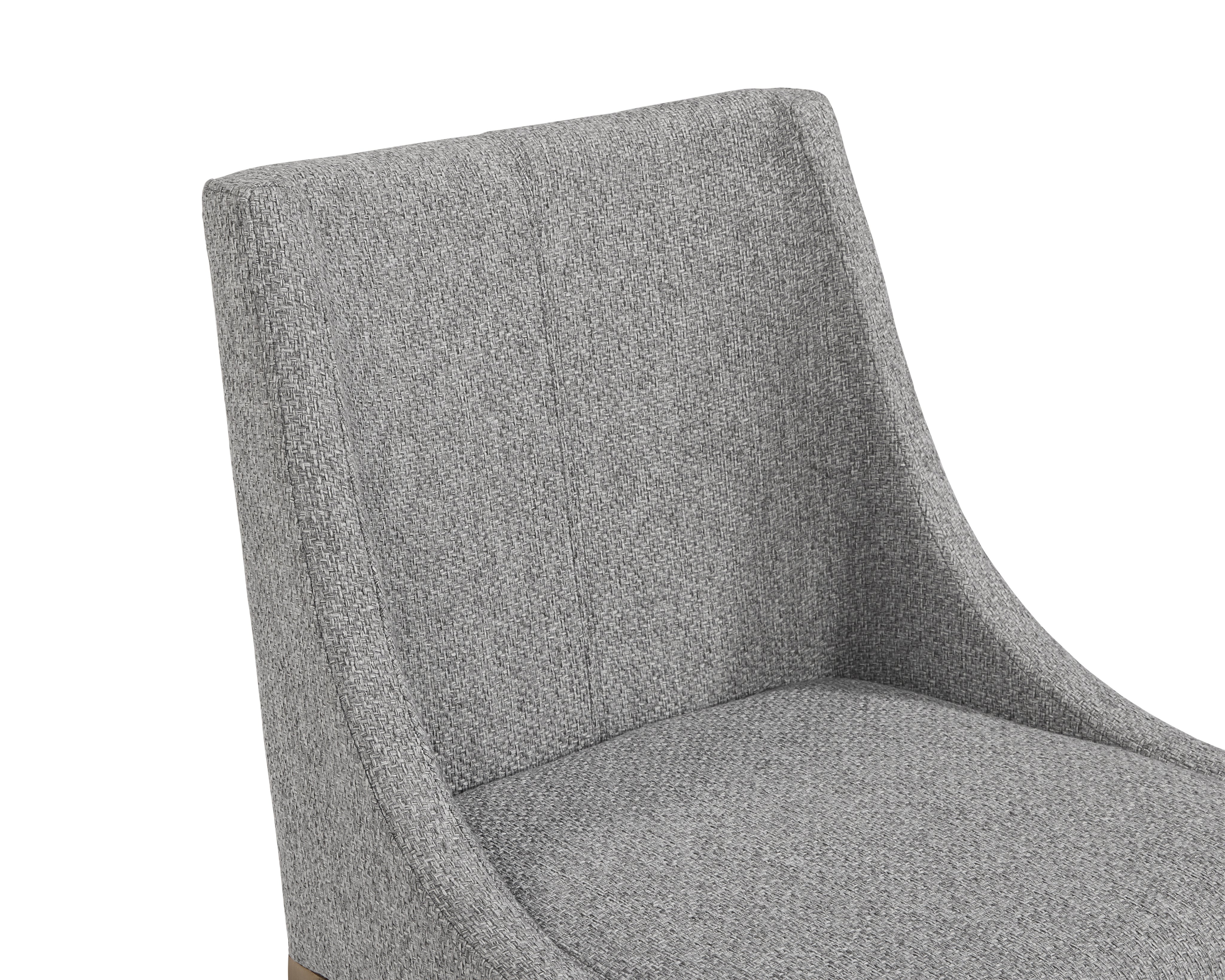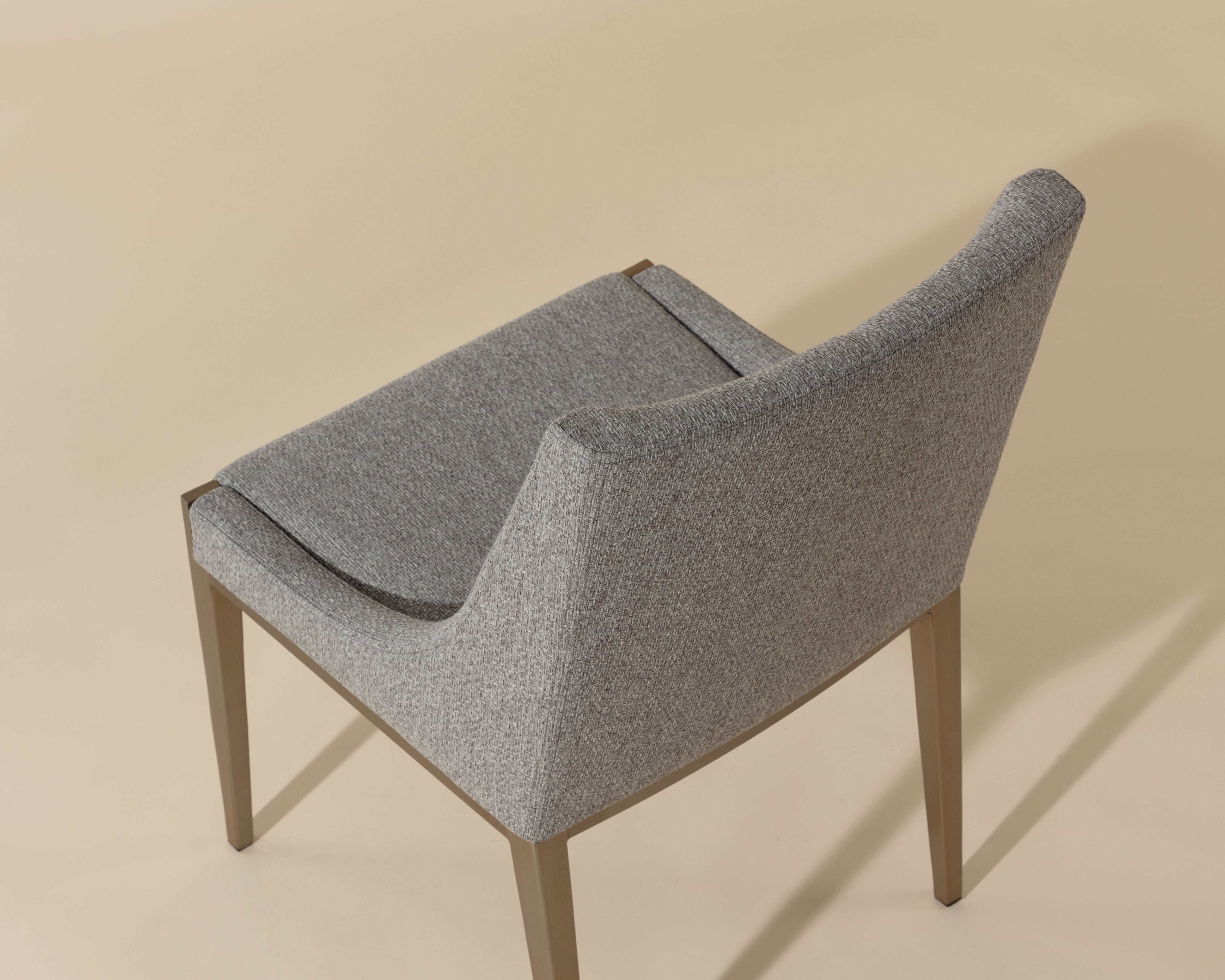 With its clean and modern design, this dining chair is a stunning addition to any dining room space. Stocked in our textured monumental oatmeal or pebble fabric and completed with stainless steel legs in an antique brass finish.