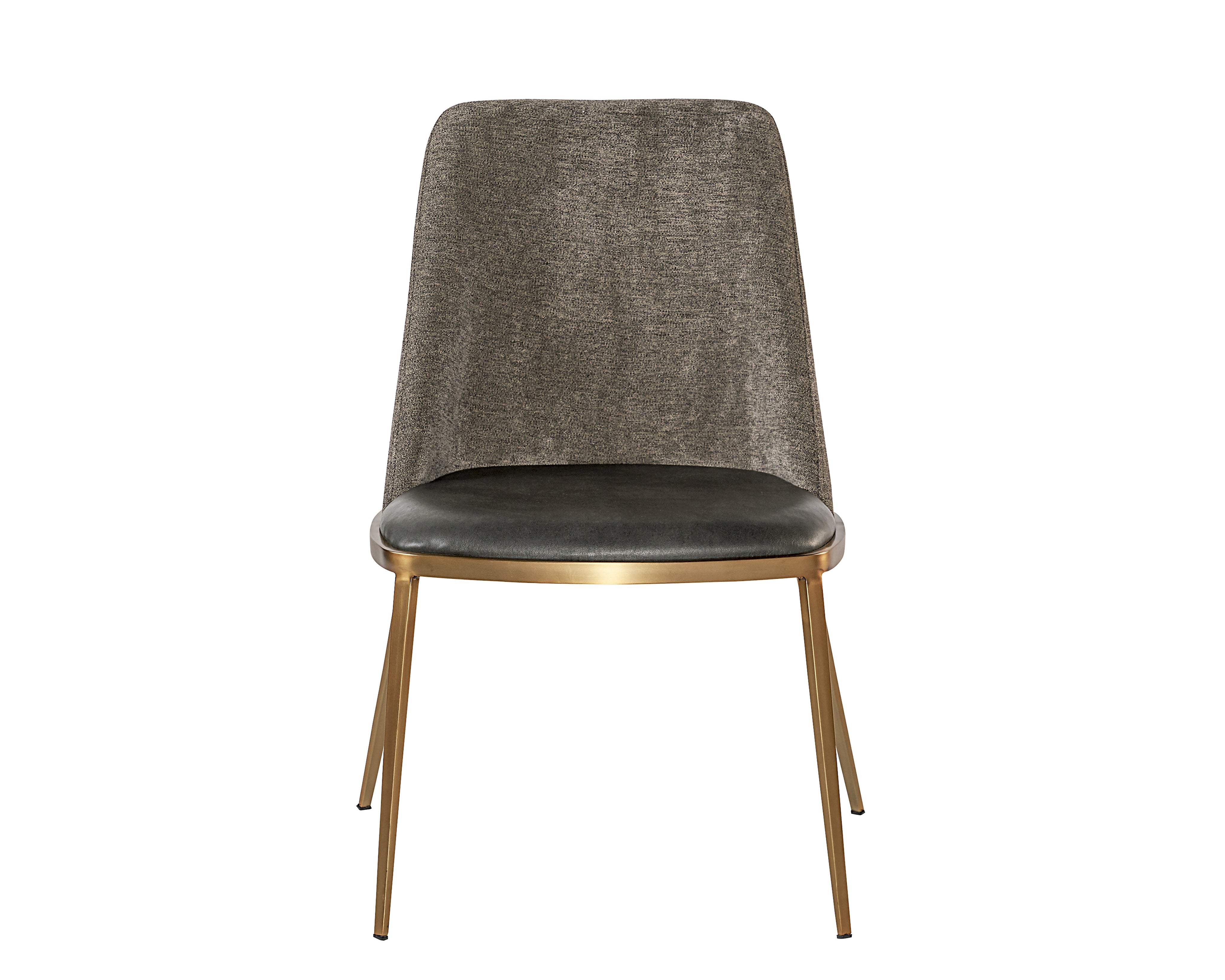 A combination of mixed materials creates a truly luxurious dining chair. The contemporary silhouette is finished with a bravo portabella faux leather seat, sparrow grey fabric seatback and sleek brushed gold steel legs. An eye-catching piece from all angles.